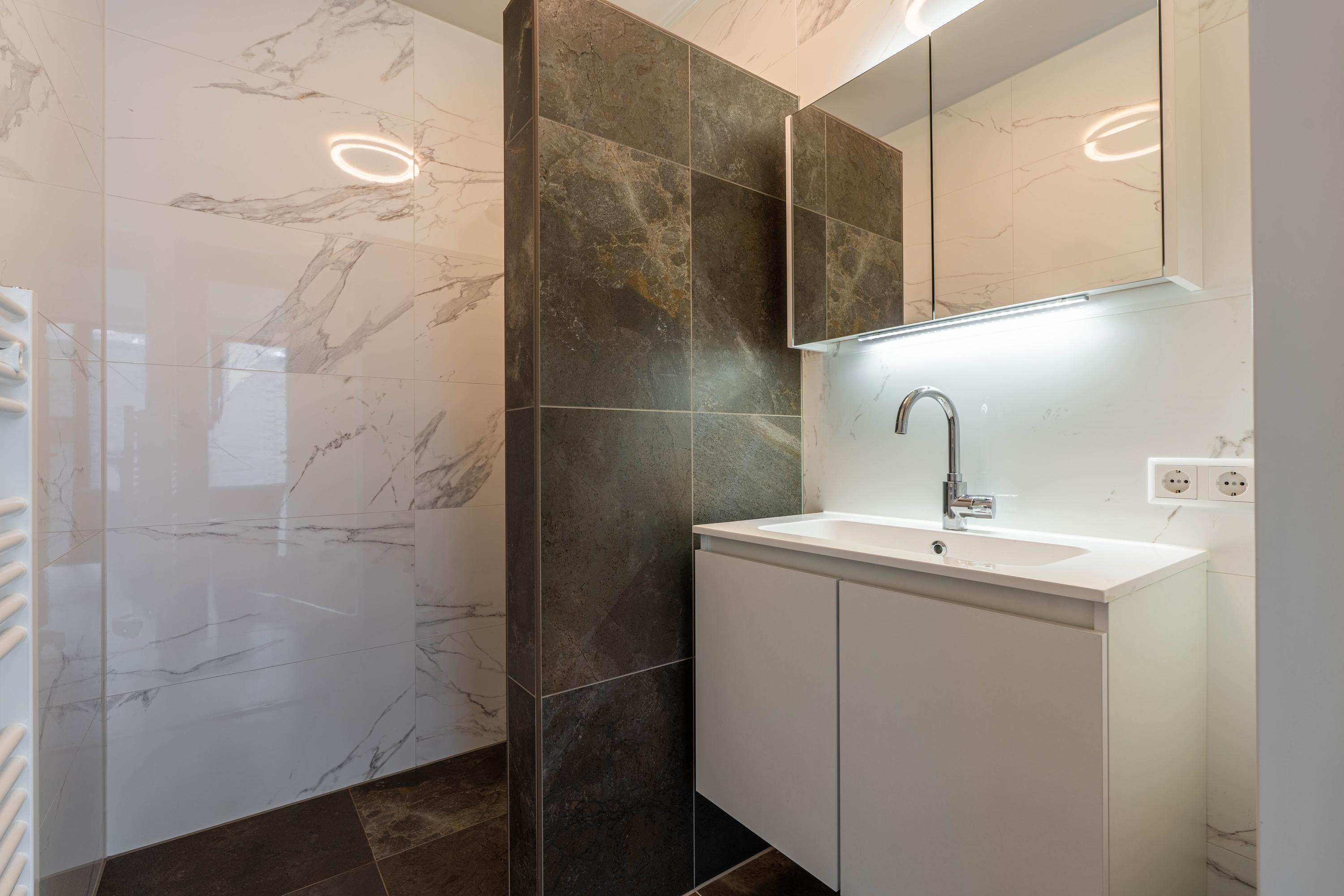 Private entrance with spacious hallway, guest toilet with washbasin, and technical room with space for cloakroom. From the hallway, the bright and spacious living room is accessible and features a luxurious kitchen with cooking island and breakfast bar. The kitchen is fully equipped with an induction hob with downdraft extractor, combi-oven, steam oven, coffee machine, dishwasher, fridge-freezer, and Quooker. The living room provides access to the large balcony.