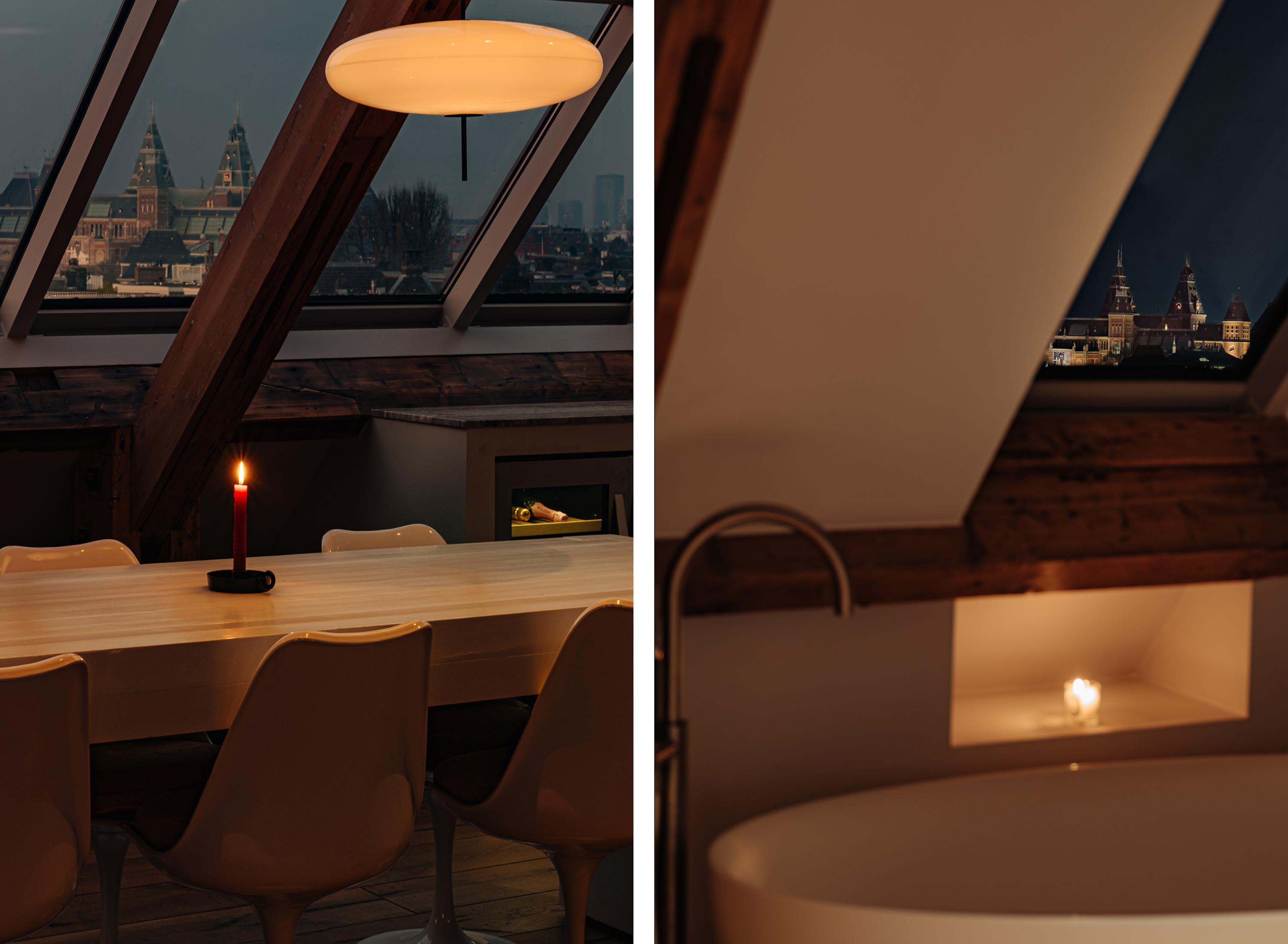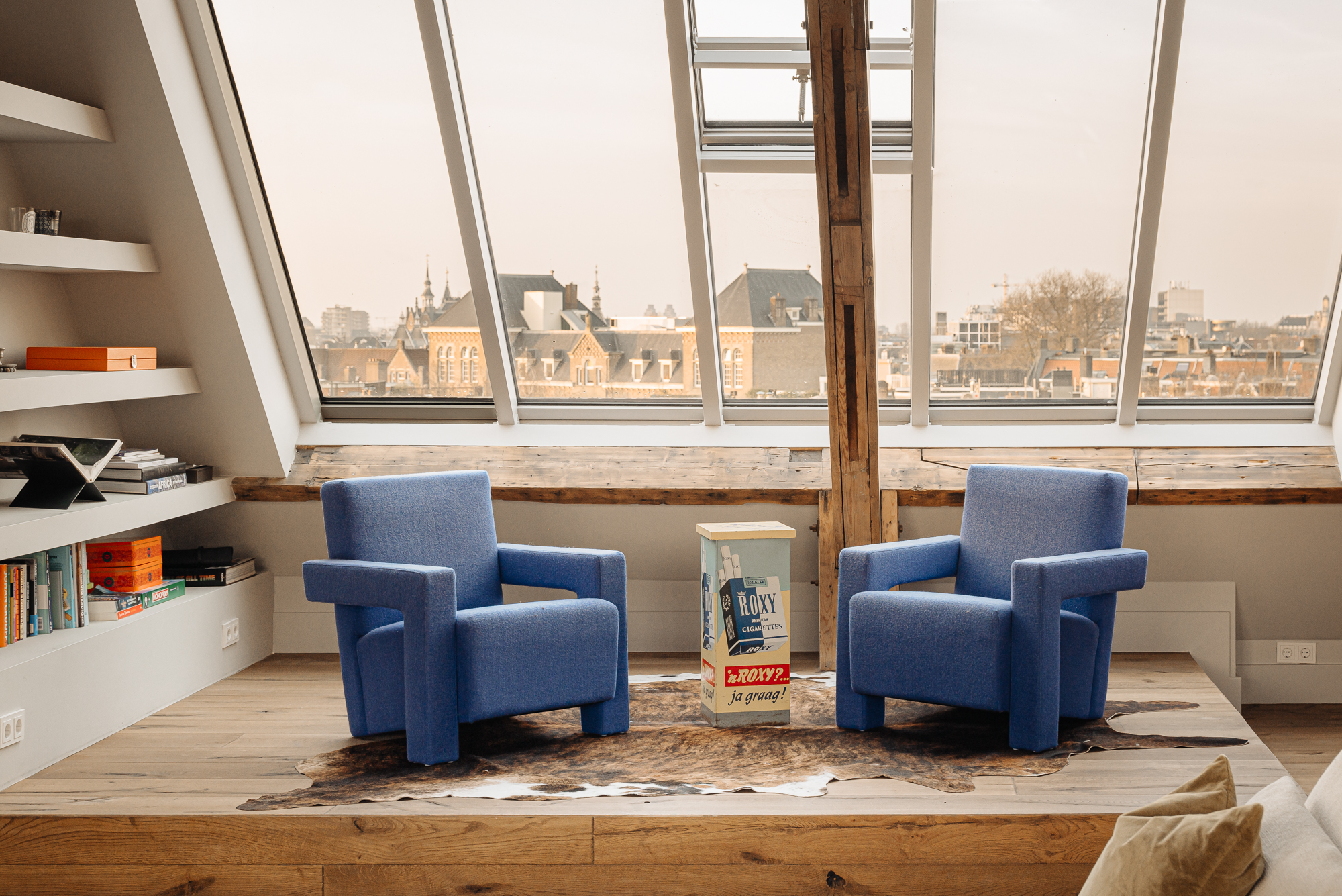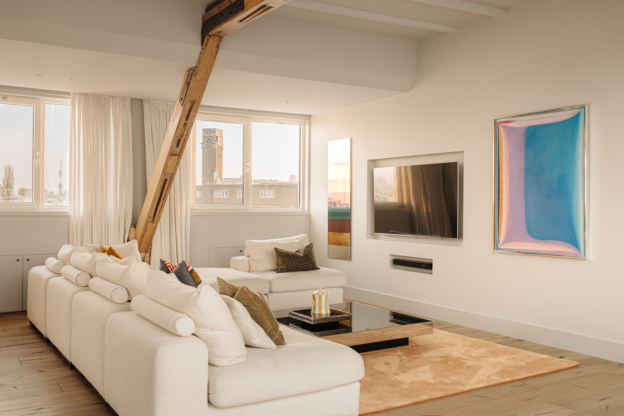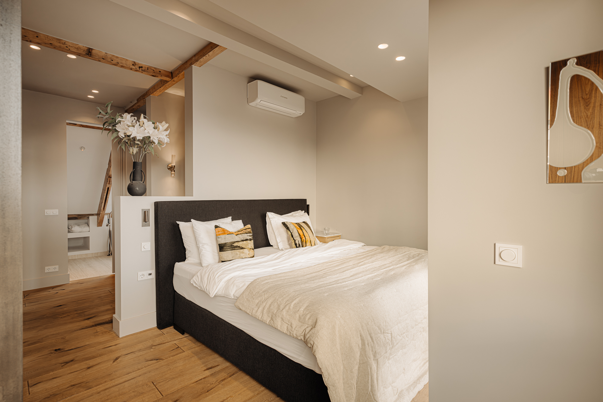 Upon entering, you immediately notice the spacious and light-filled design of the apartment. The living room features a charming south-facing balcony and large windows on both sides, allowing plenty of natural light and offering a panoramic view of the city. The visible wooden beams add character, while the elevated seating area creates a cosy space to relax. An air conditioning unit is installed above the kitchen, which boasts a large cooking island with a natural stone worktop and high-end built-in appliances, including a four-burner induction hob with extractor, a dishwasher, a fridge-freezer combination, a Quooker, and a built-in wine climate cabinet. A stylish raised bar area is integrated into the kitchen island. The dining area comfortably accommodates a large table, benefiting from ample natural daylight through the expansive windows.