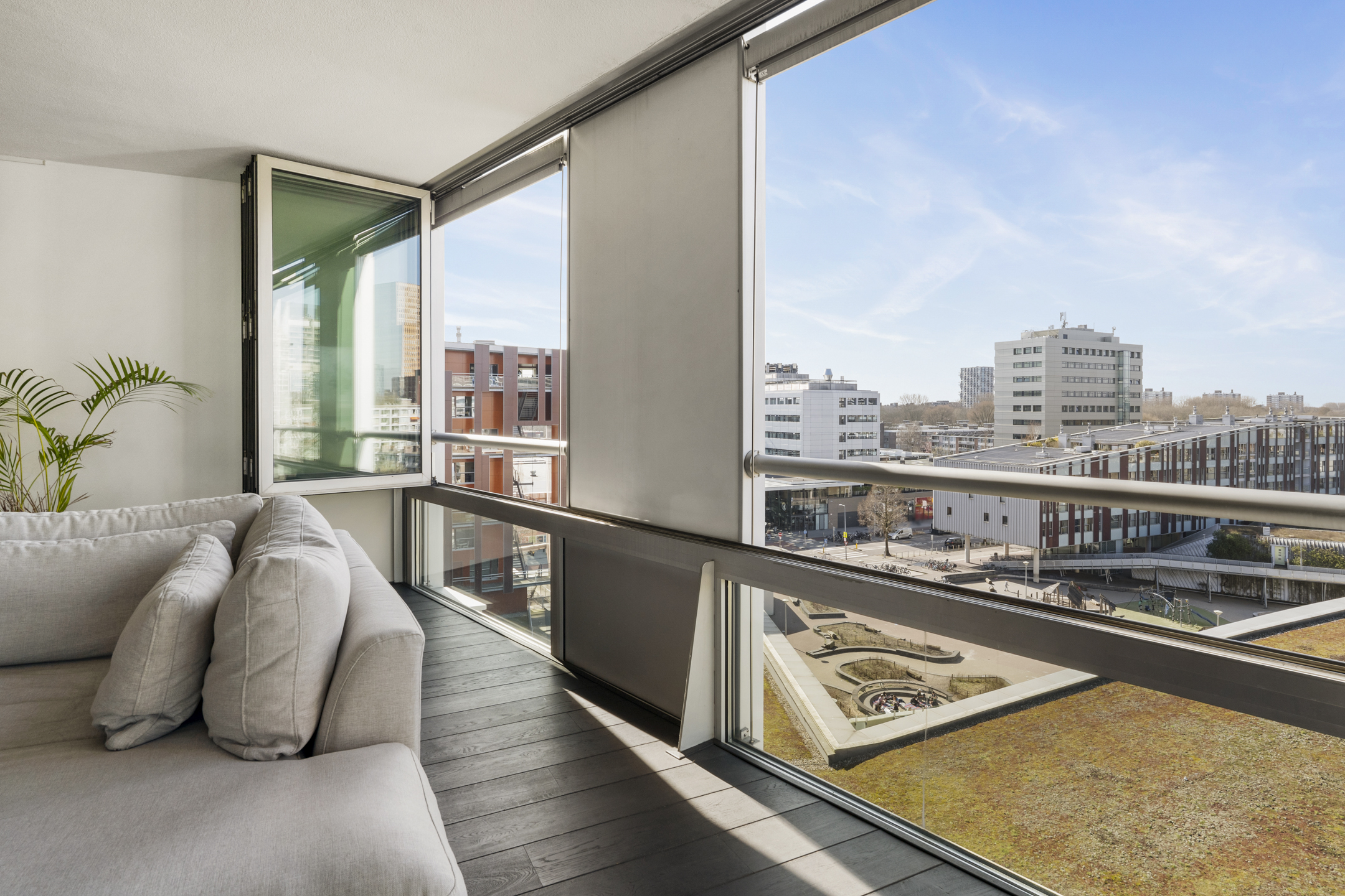 Apartment Amsterdam on the seventh floor of the Gelderhof complex offers 117 m² of refined living space and panoramic views over the water and the Zuidas skyline. This corner residence is designed for abundant natural light, with southwest and north-facing floor-to-ceiling windows that frame the city and waterfront vistas. The property features two spacious bedrooms, currently configured as a main suite with walk-in closet, a luminous living area with glass walls and fold-away façade, and a high-spec kitchen with island, solid oak parquet, and built-in appliances, all executed with clarity and purpose.