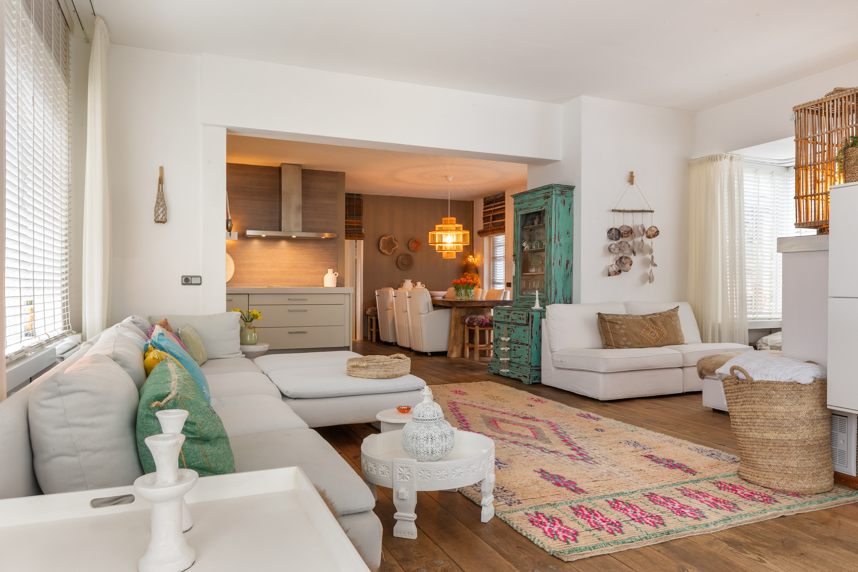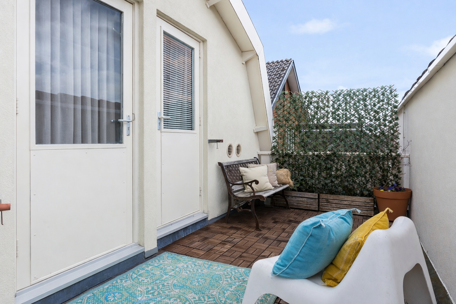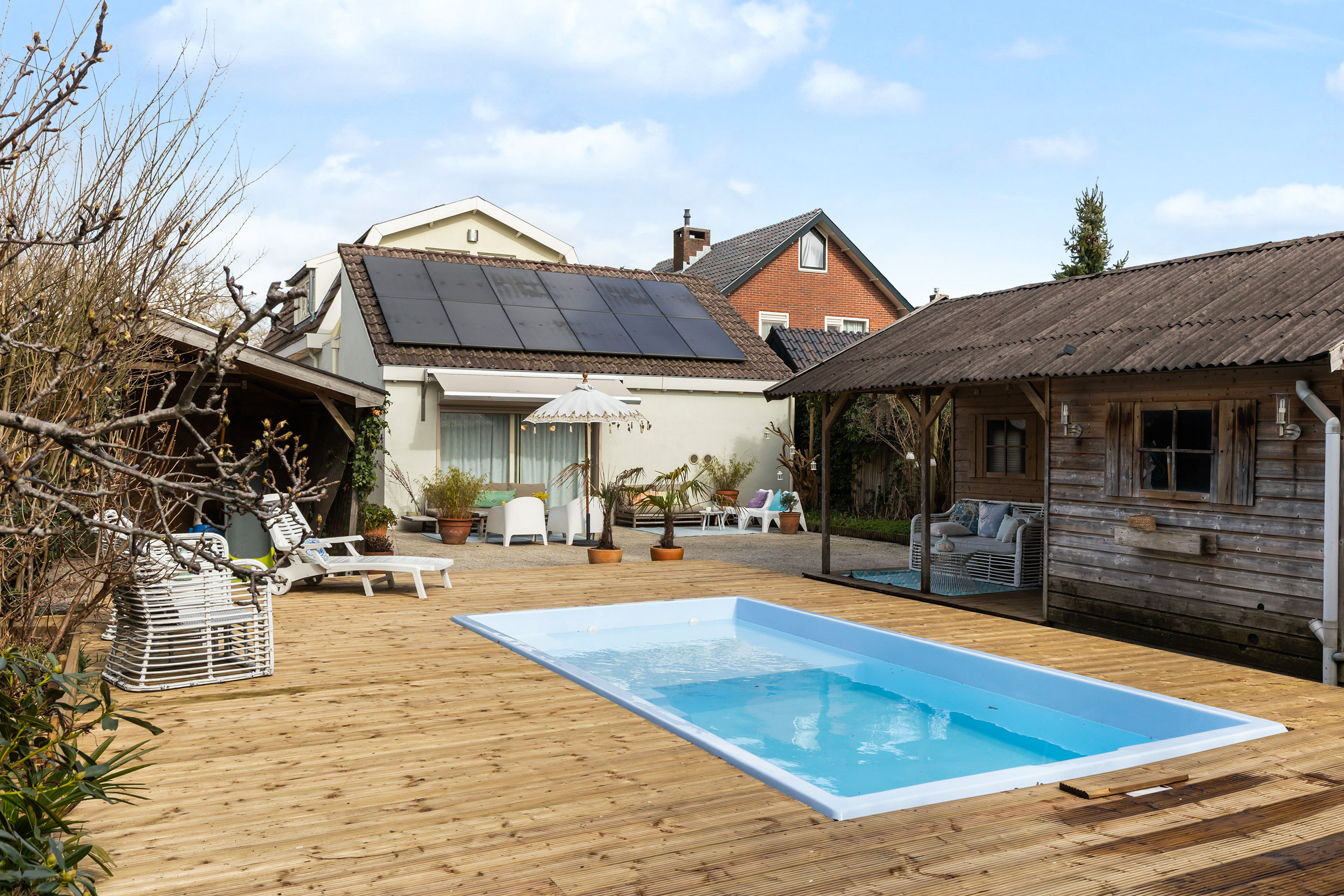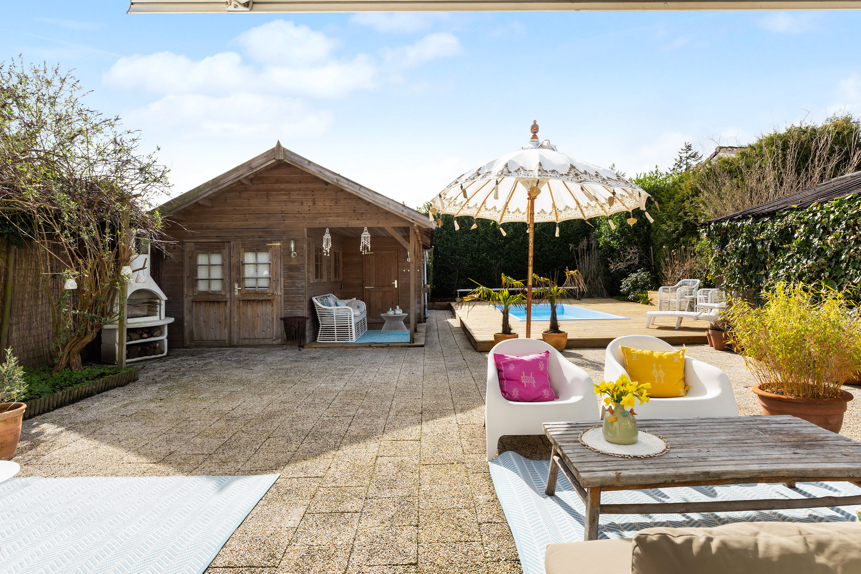 From the front of the property the full extent of the living space is hardly visible. Once inside, the space unfolds impressively, offering several living and sleeping areas, two bathrooms, two garages, two verandas and a sunny, fully private garden with swimming pool. The current finish is contemporary and inspired by a warm South-European Ibiza style. In 2026 the exterior was finished in a warm tone and fitted with characteristic louvre shutters. Combined with the sunny terraces and the pool, this creates a relaxed and almost Mediterranean atmosphere.