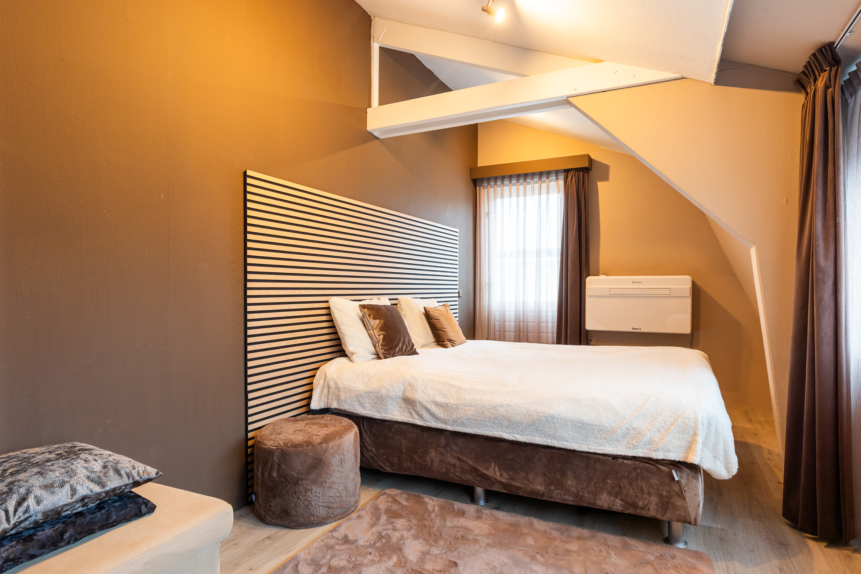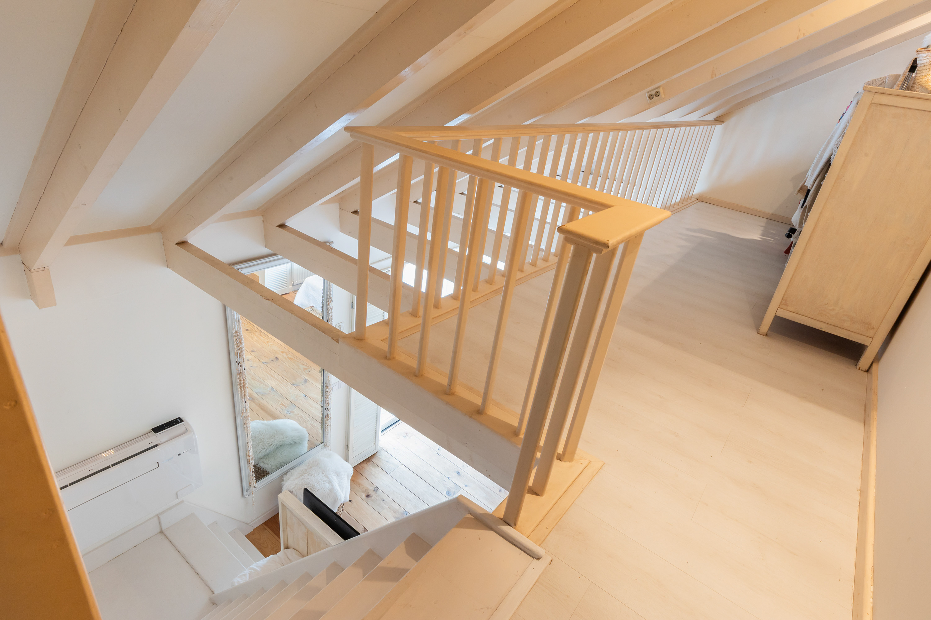 Throughout this level the original beams, sloping ceilings, wide dormer windows and wooden floors have been preserved, giving the spaces a warm and authentic character.
