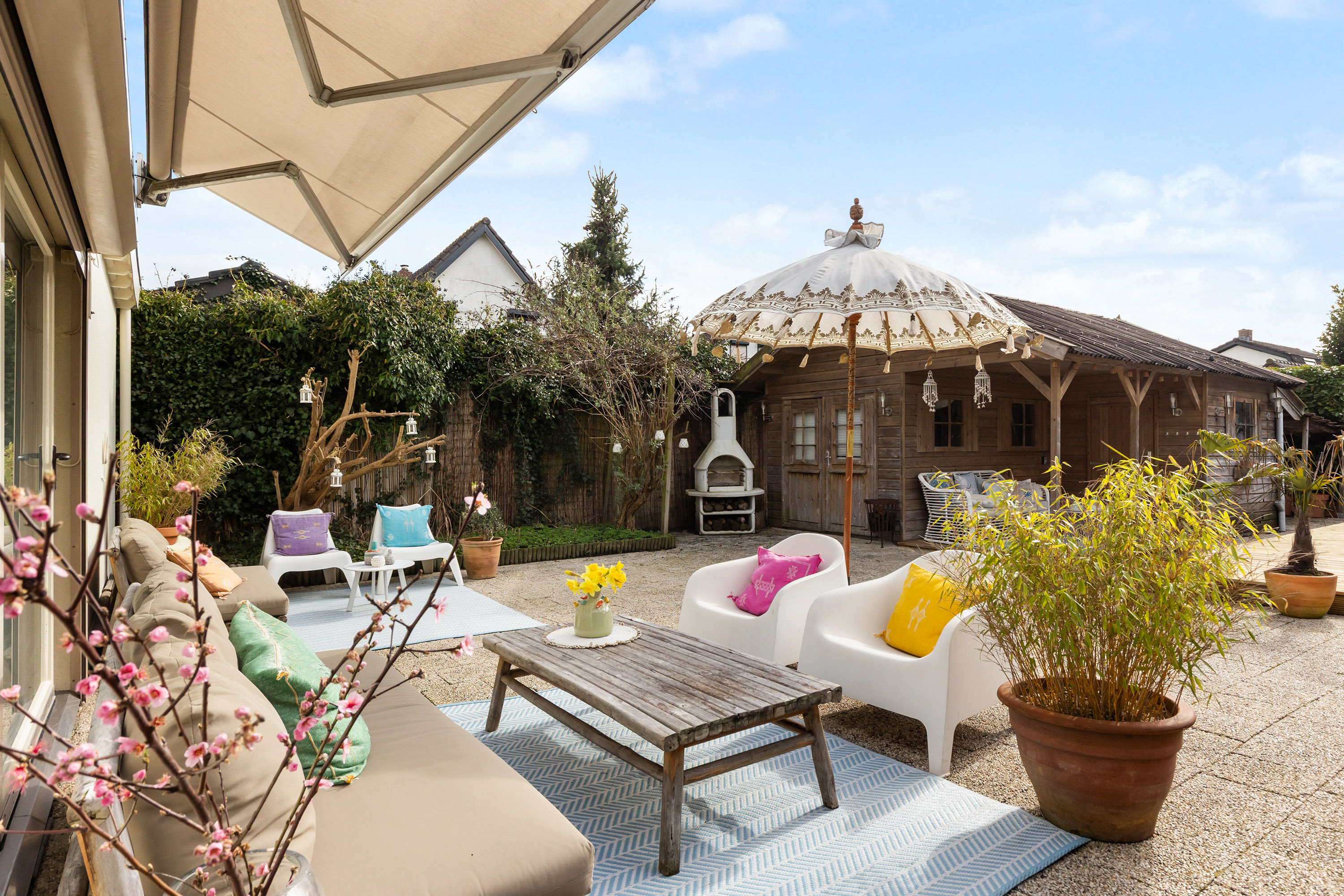 There is ample space for a large dining table with eight chairs, and the double French doors connect the kitchen directly with the veranda in the side garden. This creates a seamless transition between indoor and outdoor living. The veranda has a sunny appearance thanks to the wooden decking and wooden louvre screens which also serve as sun protection. It is an ideal place for outdoor dining and enjoying time with friends and family.
