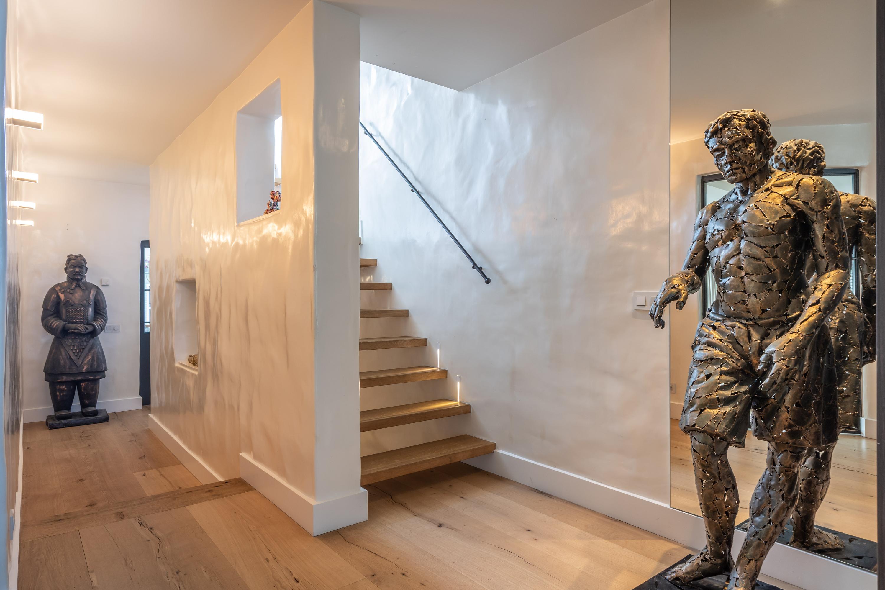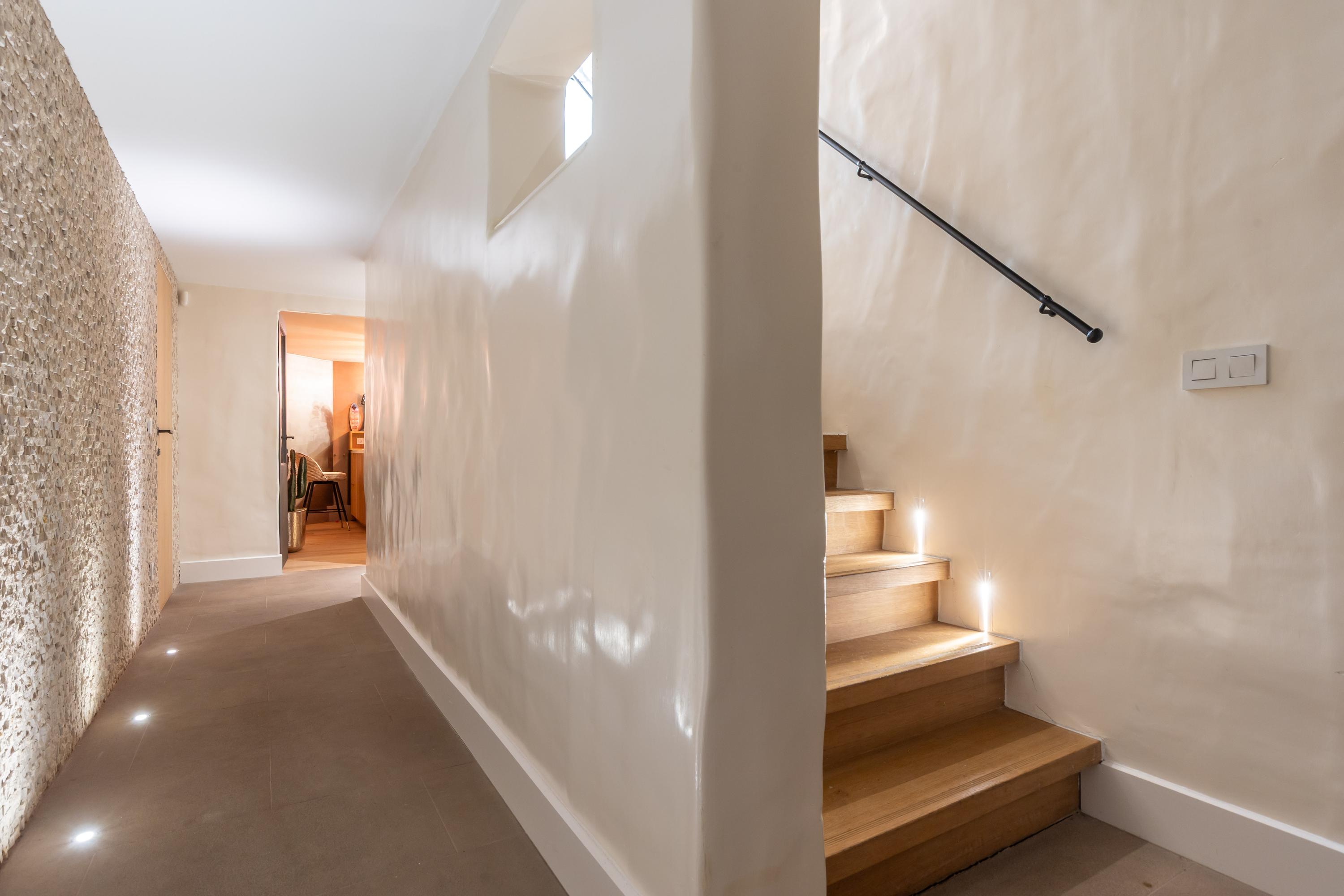 All walls are finished with exclusive puddingstuc in modern Ibiza style. Puddingstuc is a traditional and highly refined plastering technique for walls and ceilings, renowned for its soft, velvety appearance and subtle sheen. The name derives from its creamy, smooth texture, reminiscent of pudding. Applied by hand in multiple layers and carefully polished, it results in a seamless, luxurious finish. Warmer than standard plasterwork and richer in feel, puddingstuc is often chosen for exclusive villas and boutique hotels for its authentic Mediterranean character and its balance of crisp design with natural, elegant charm.