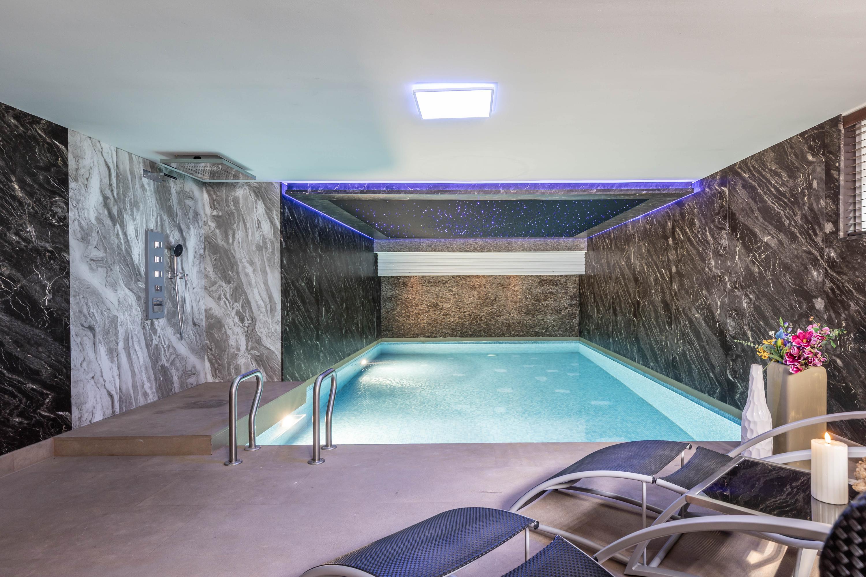 The lower ground floor is home to a wellness suite of exceptional calibre. A heated swimming pool with solar cover and counter-current system forms the centrepiece of this relaxation zone. Behind smoked glass doors, a hammam, sauna, shower and changing area provide ultimate comfort and seclusion. The pool is fully automated, heated by its own boiler and equipped with a modern filtration and dehumidification system.