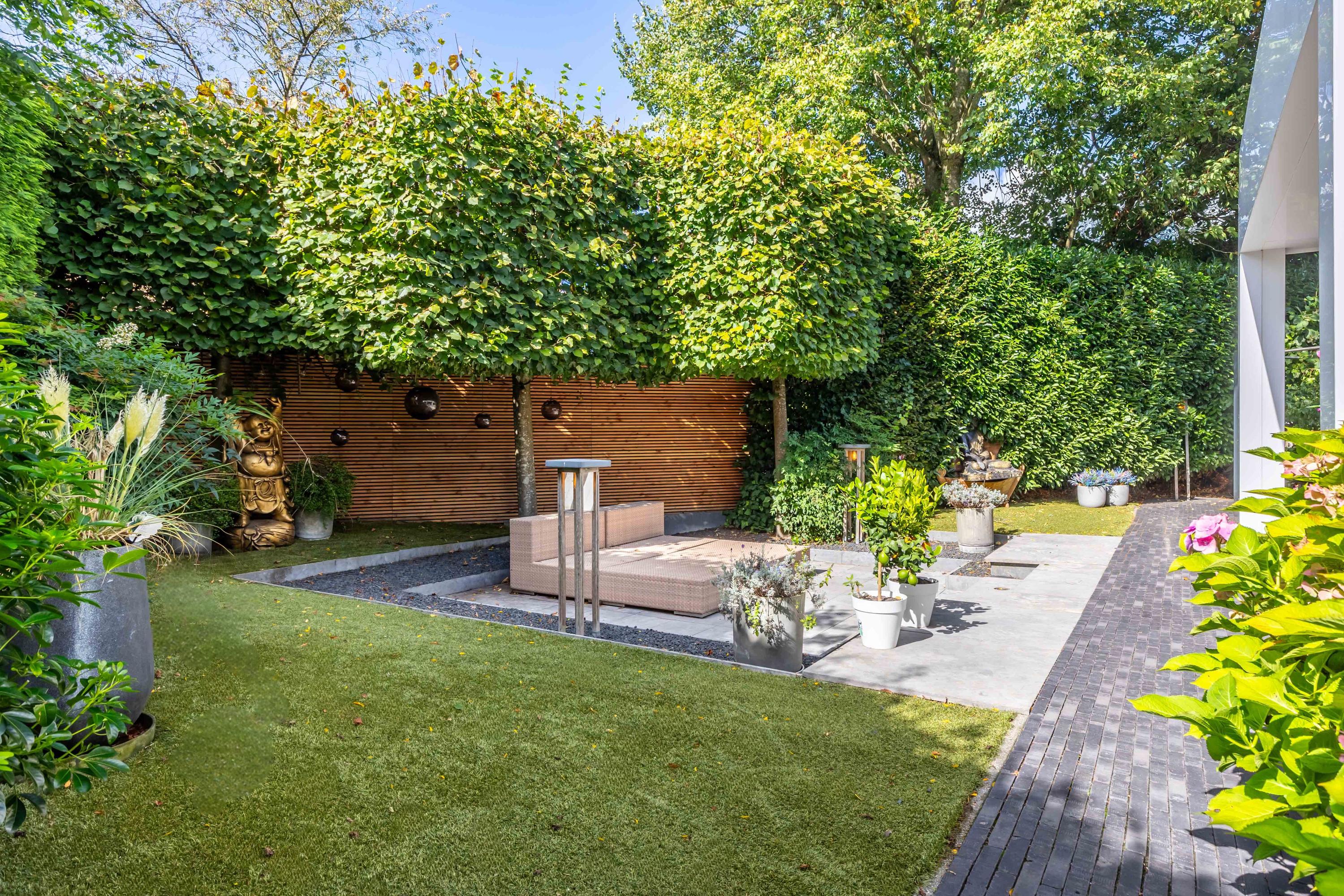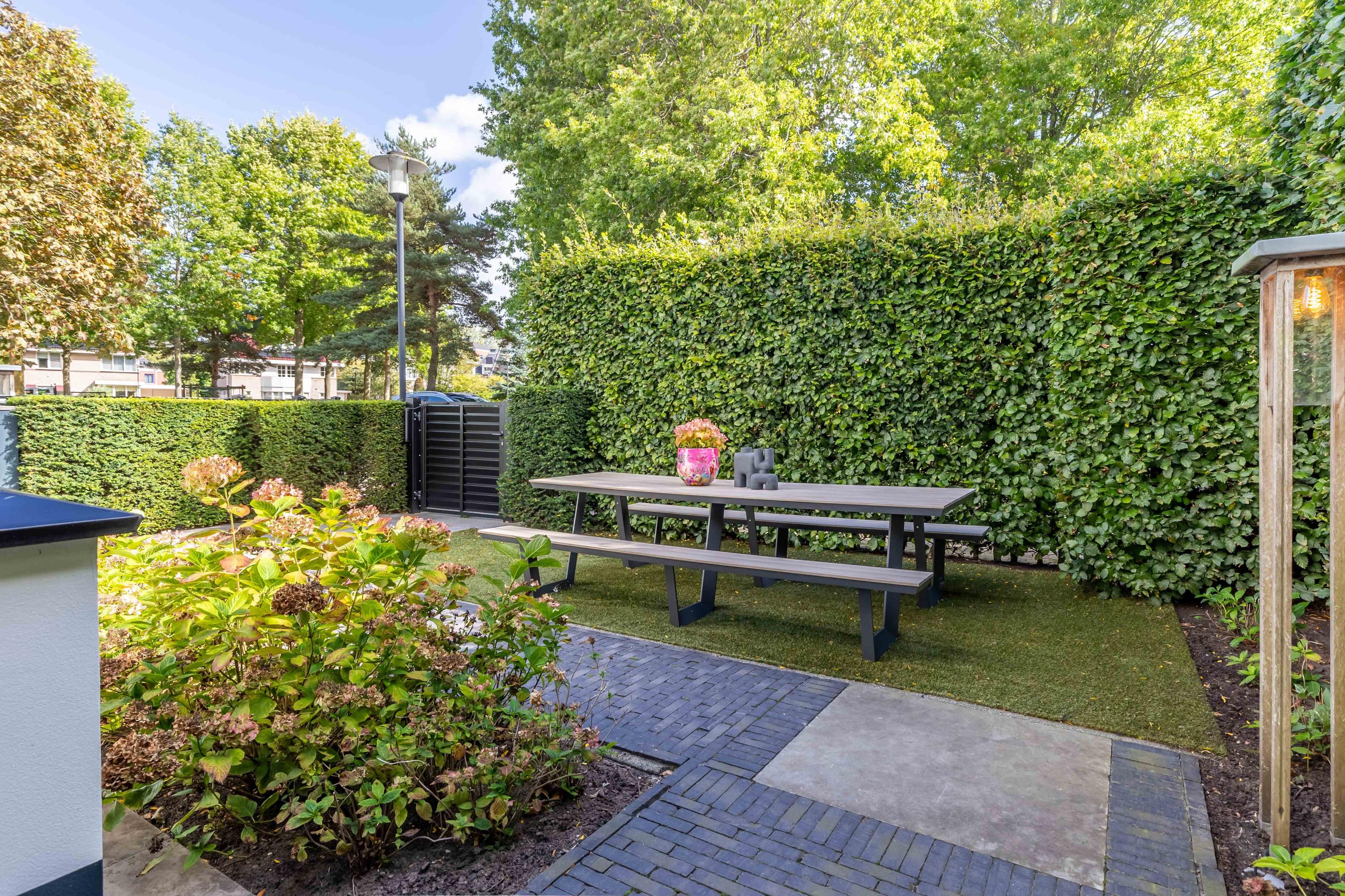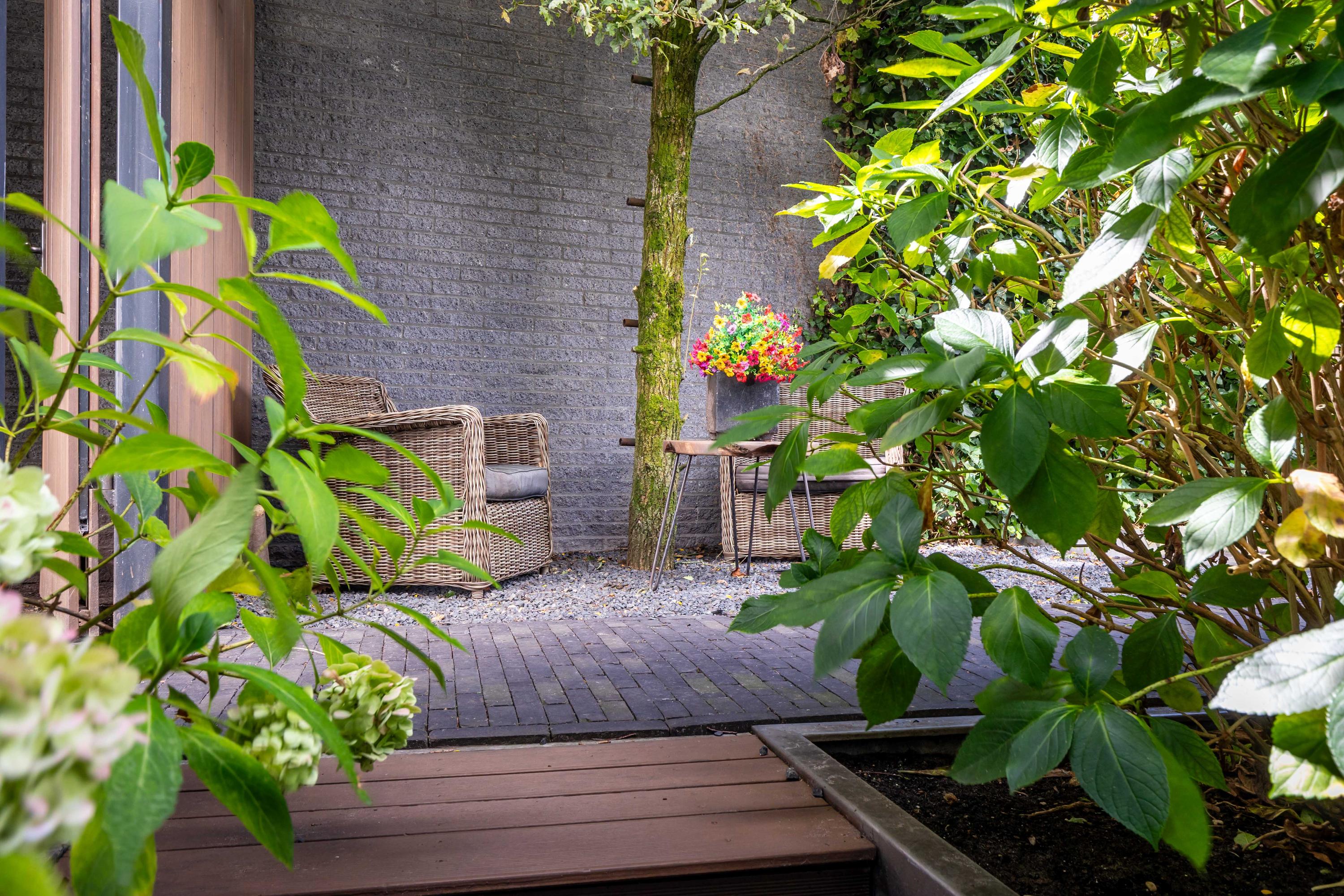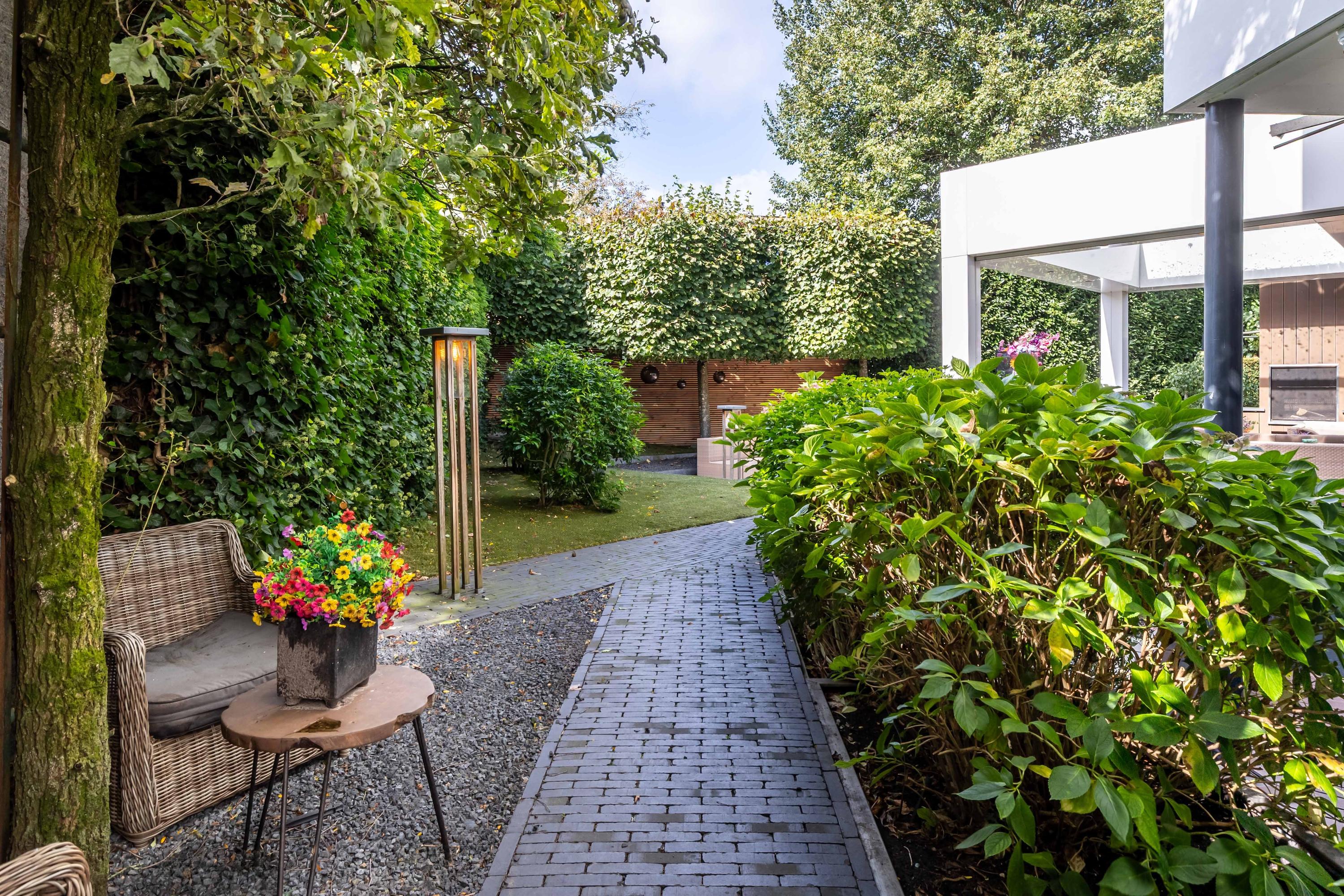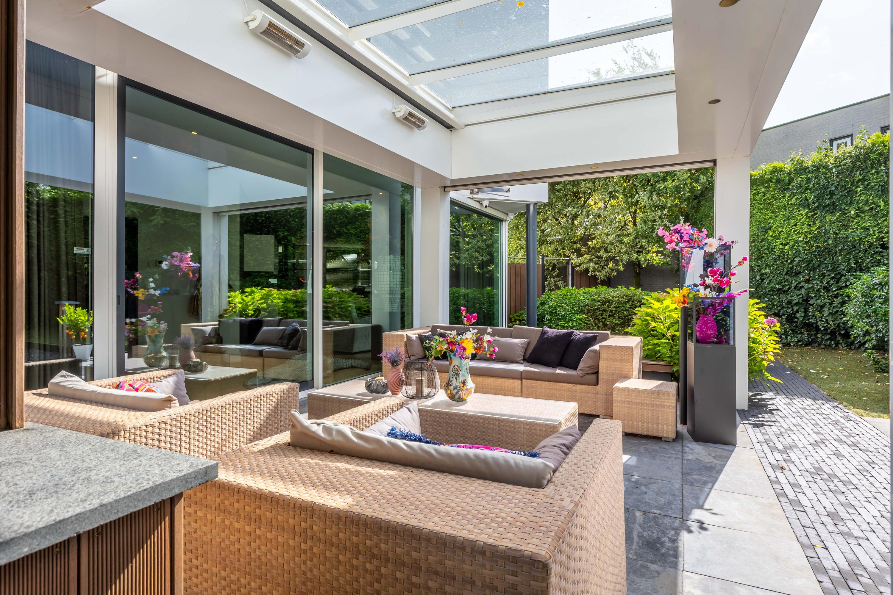 The garden, fully redesigned in 2025, is a true oasis of privacy and greenery, ideally positioned to the south-west. Multiple terraces offer different ambiences throughout the day. The veranda, with its lofty ceiling and large roof light, ensures an airy, bright atmosphere.