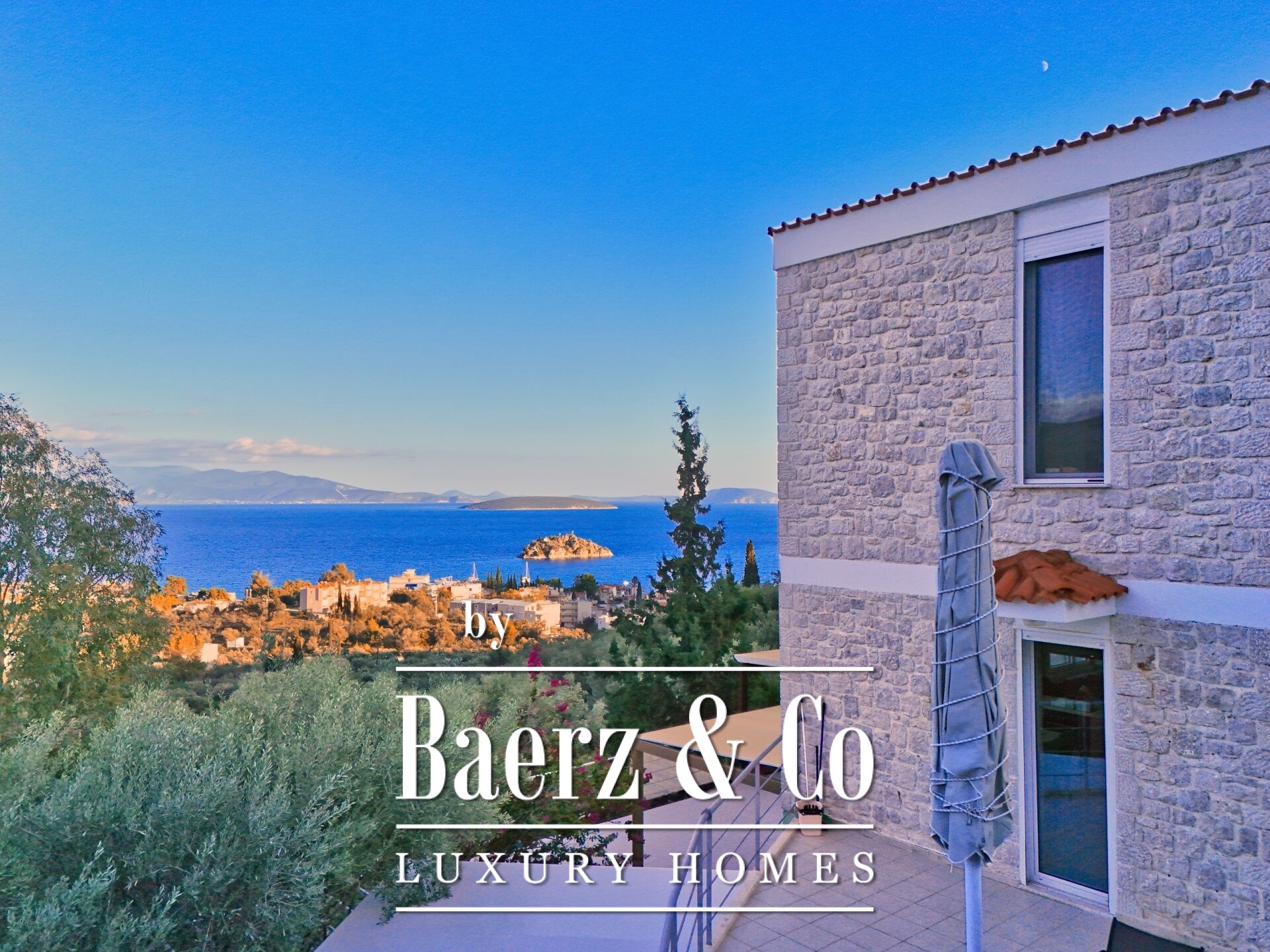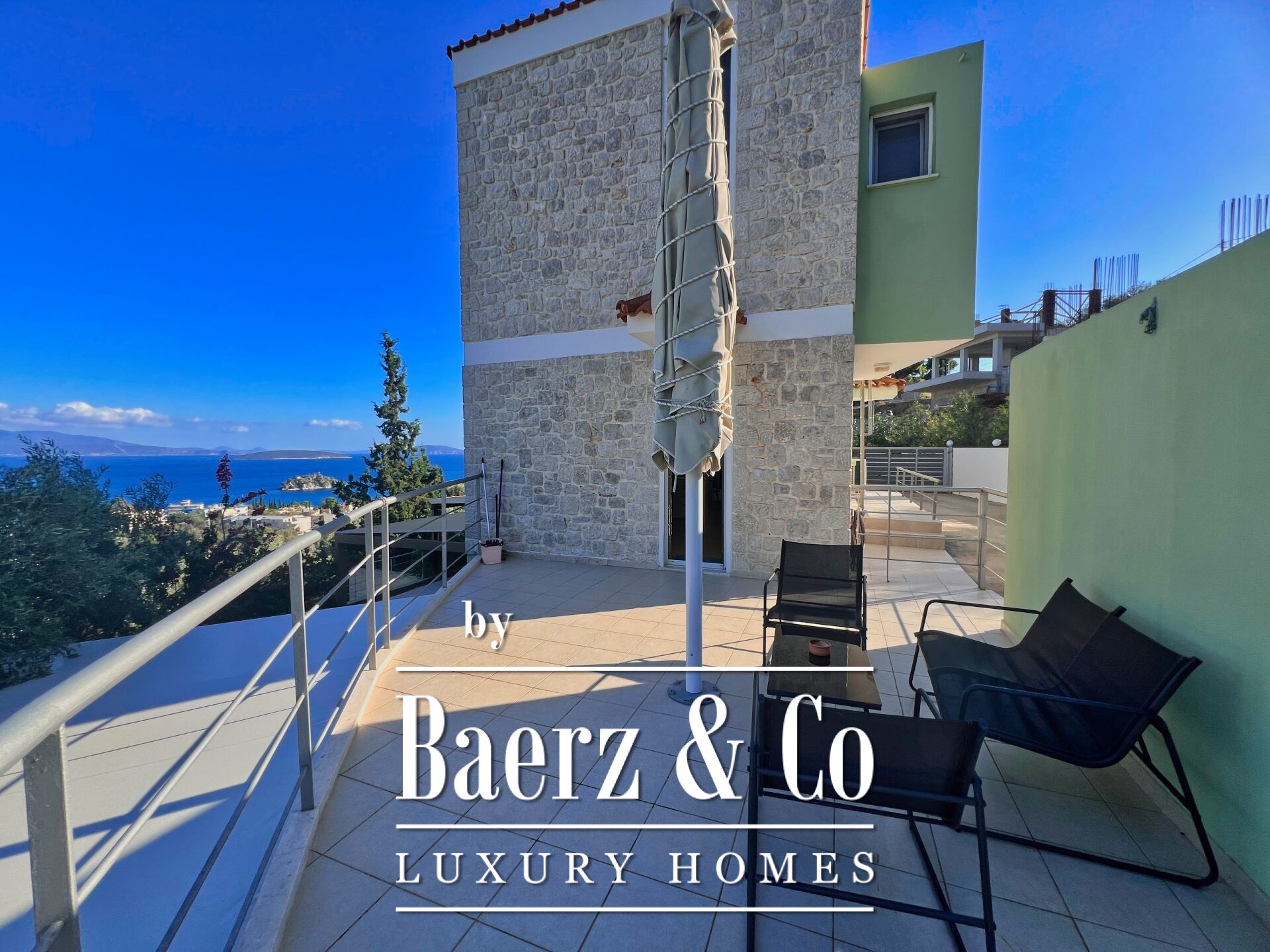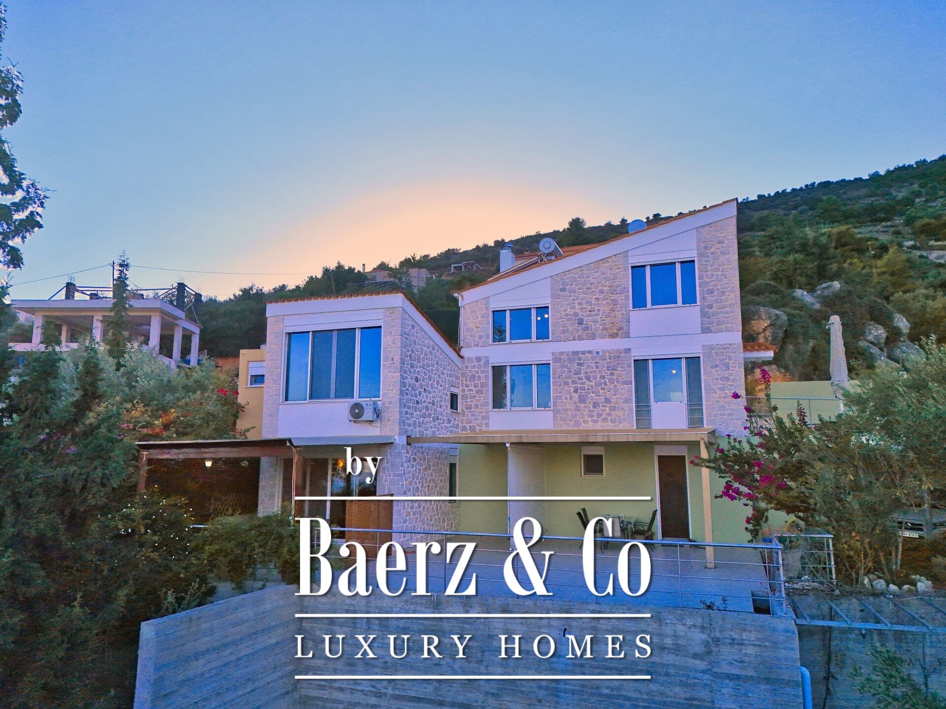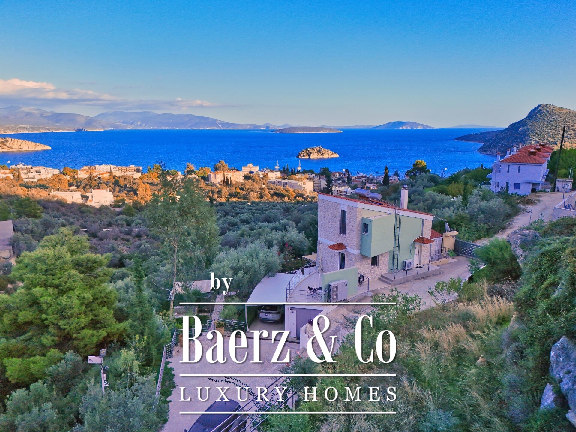 Stone residences Asini are introduced as an exclusive opportunity, set on a tranquil hillside above Tolo and offering far-reaching 180° panoramic views over the Argolic Gulf and surrounding mountains. The property forms a discreet complex of three autonomous homes, totaling 158 m² of living space on a 2,410 m² plot, harmoniously grounded in the landscape through the use of local stone and wood.