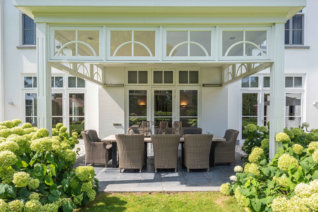 Through the neatly landscaped front garden, you reach the stately entrance of the home. Upon entering, it is immediately clear that careful thought has been given to the sightlines in and around the property. The hallway features a meter cupboard, a guest toilet, a cloakroom, a staircase to the upper floor, and provides access to the living areas.