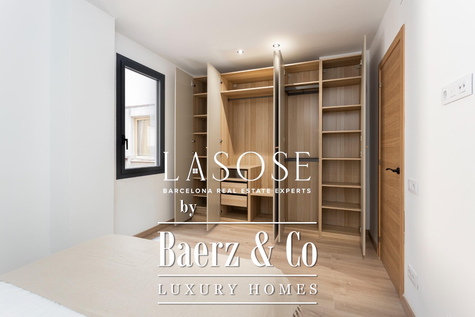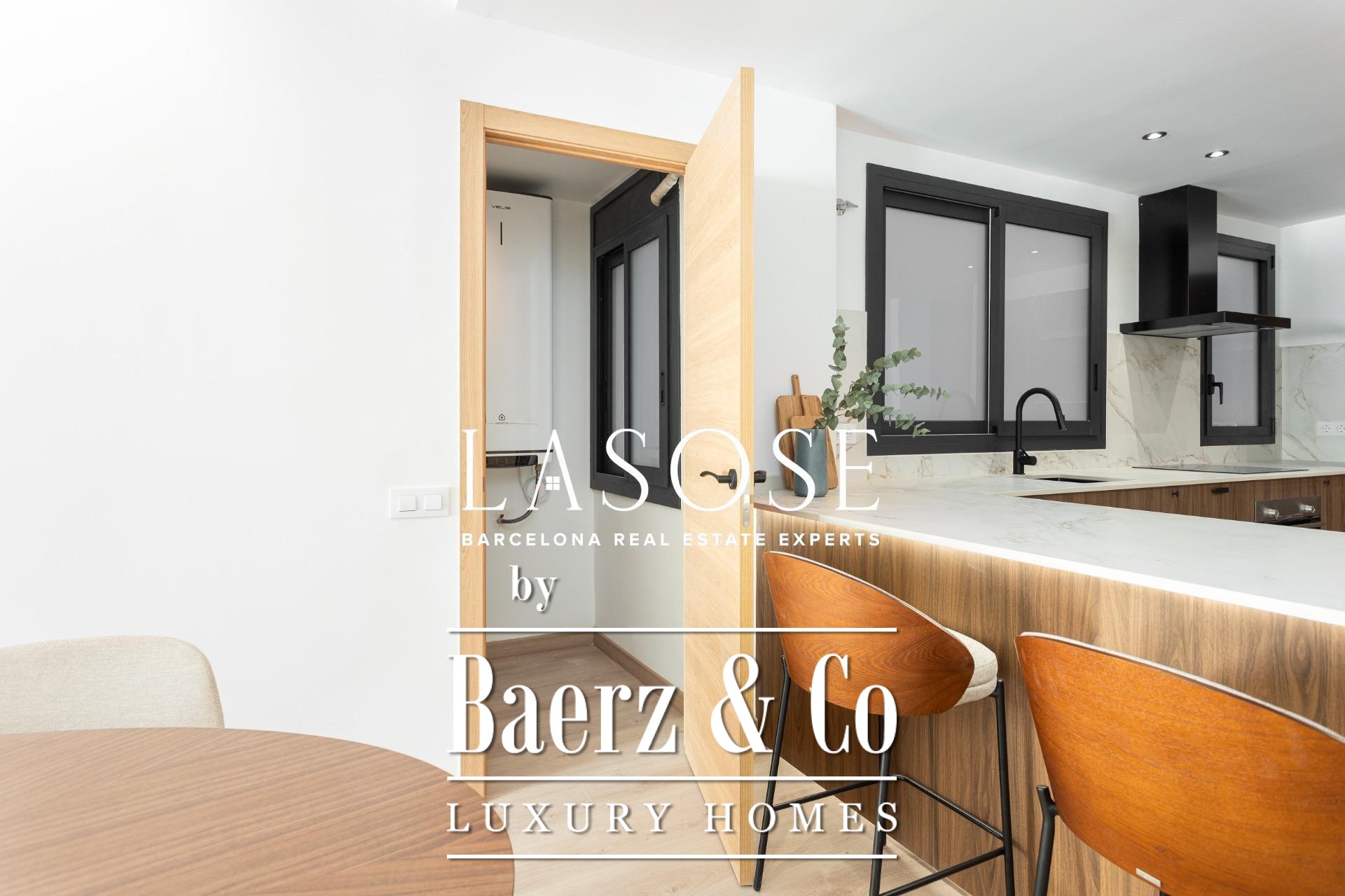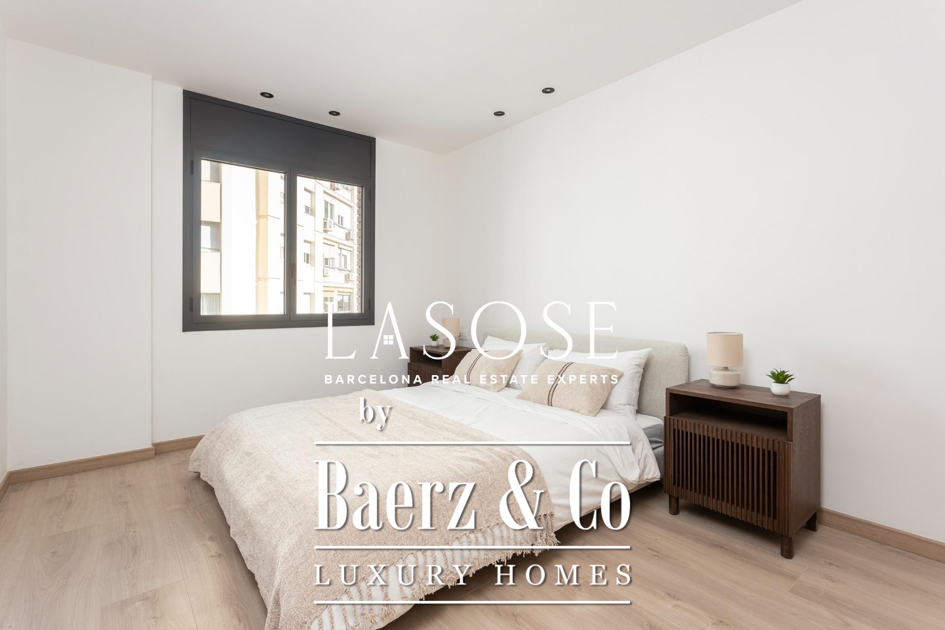 Three bedrooms include a main suite with terrace access, fitted wardrobes, and a private bathroom, complemented by a double and single bedroom. Both bathrooms feature concealed taps, LED illumination, and porcelain detail. Amenities include ducted Mitsubishi air conditioning, advanced insulation, laundry room, and a parking space in the building for a small car or motorbike, offering discreet comfort in the core of Barcelona. This luxury apartment for sale in Barcelona presents the equilibrium of modern design and metropolitan lifestyle.