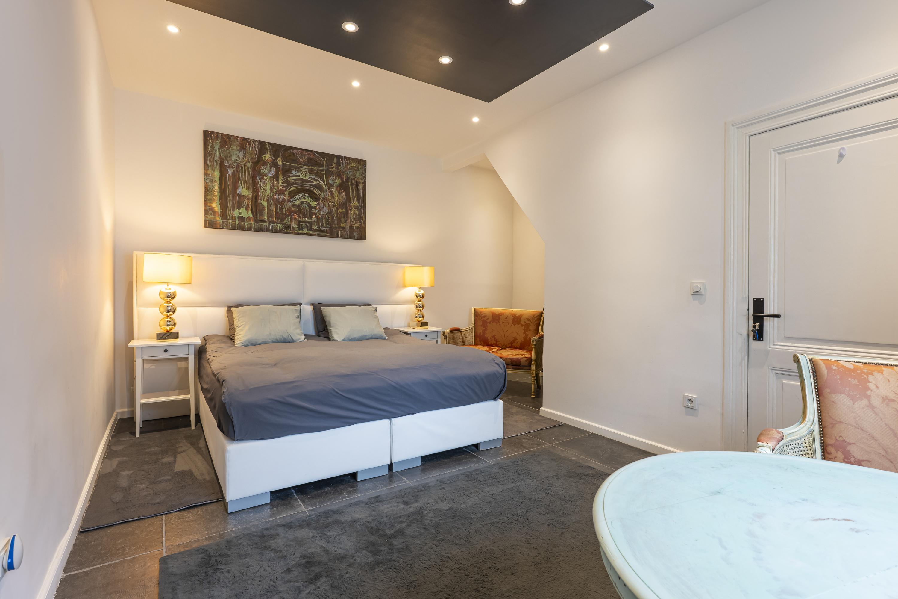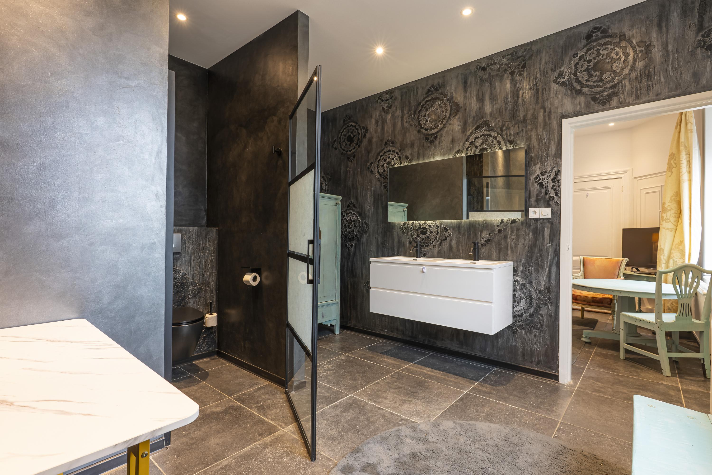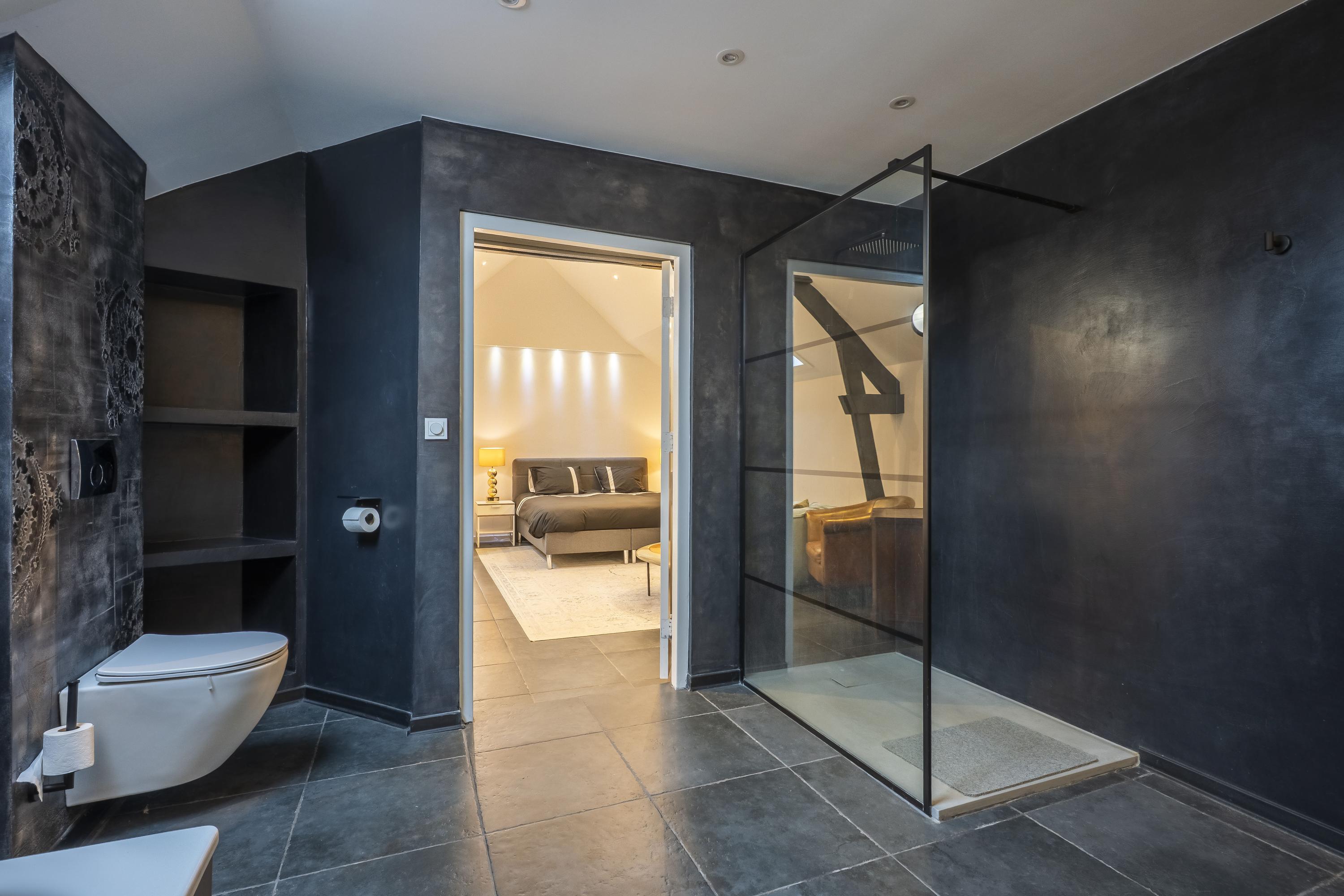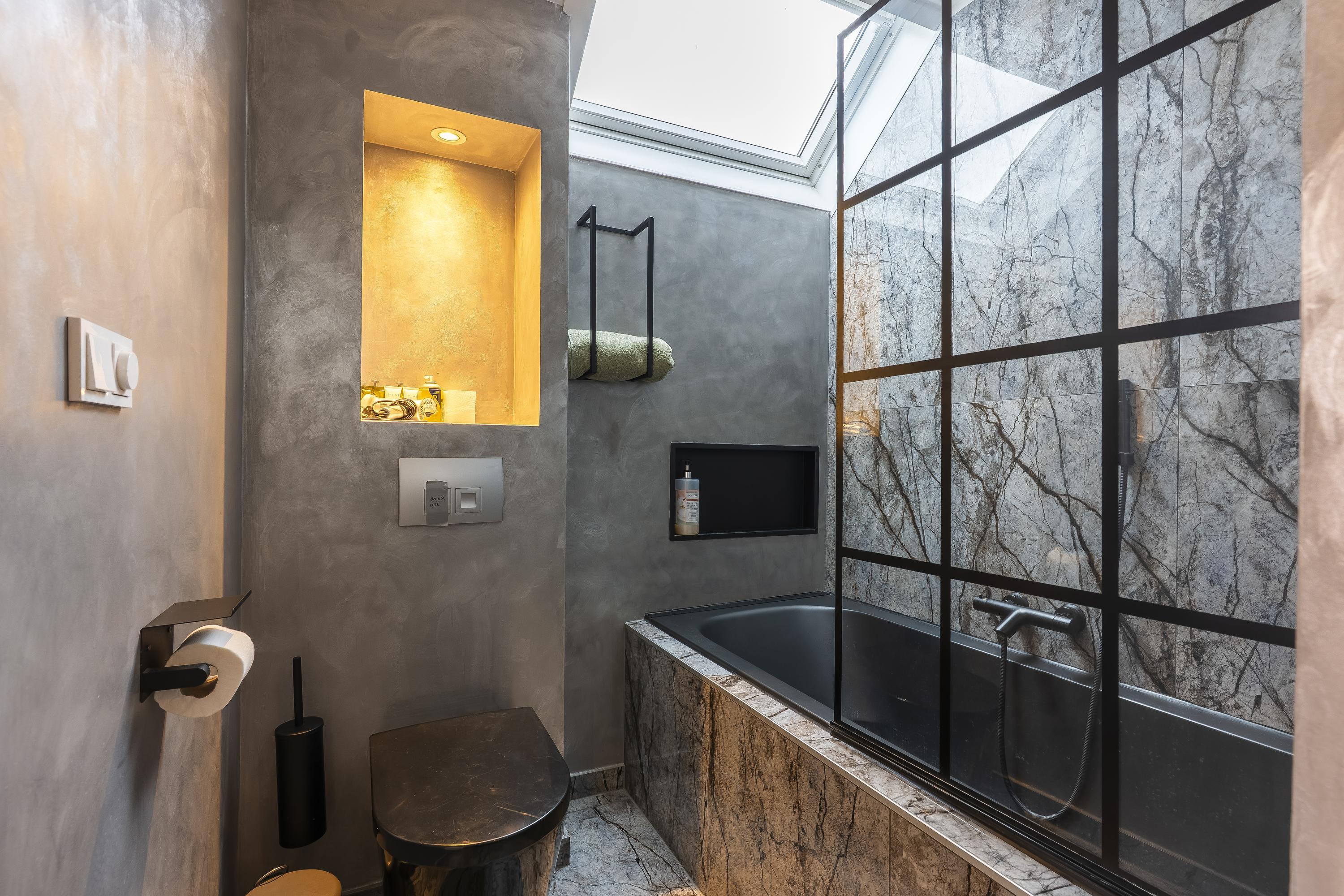 The main residence is conceived around light, proportion and a strict architectural consistency. The spacious living kitchen, fitted with Gaggenau appliances, forms the heart of the home. The adjoining living area exudes understated luxury with generous windows, a modern wood stove, and direct access to both the courtyard and the garden terraces. Large anthracite tiles extend seamlessly outdoors, creating a unified interior–exterior composition. A study (or additional bedroom) on the ground floor and the elegant Golden Bathroom complete the ground level.