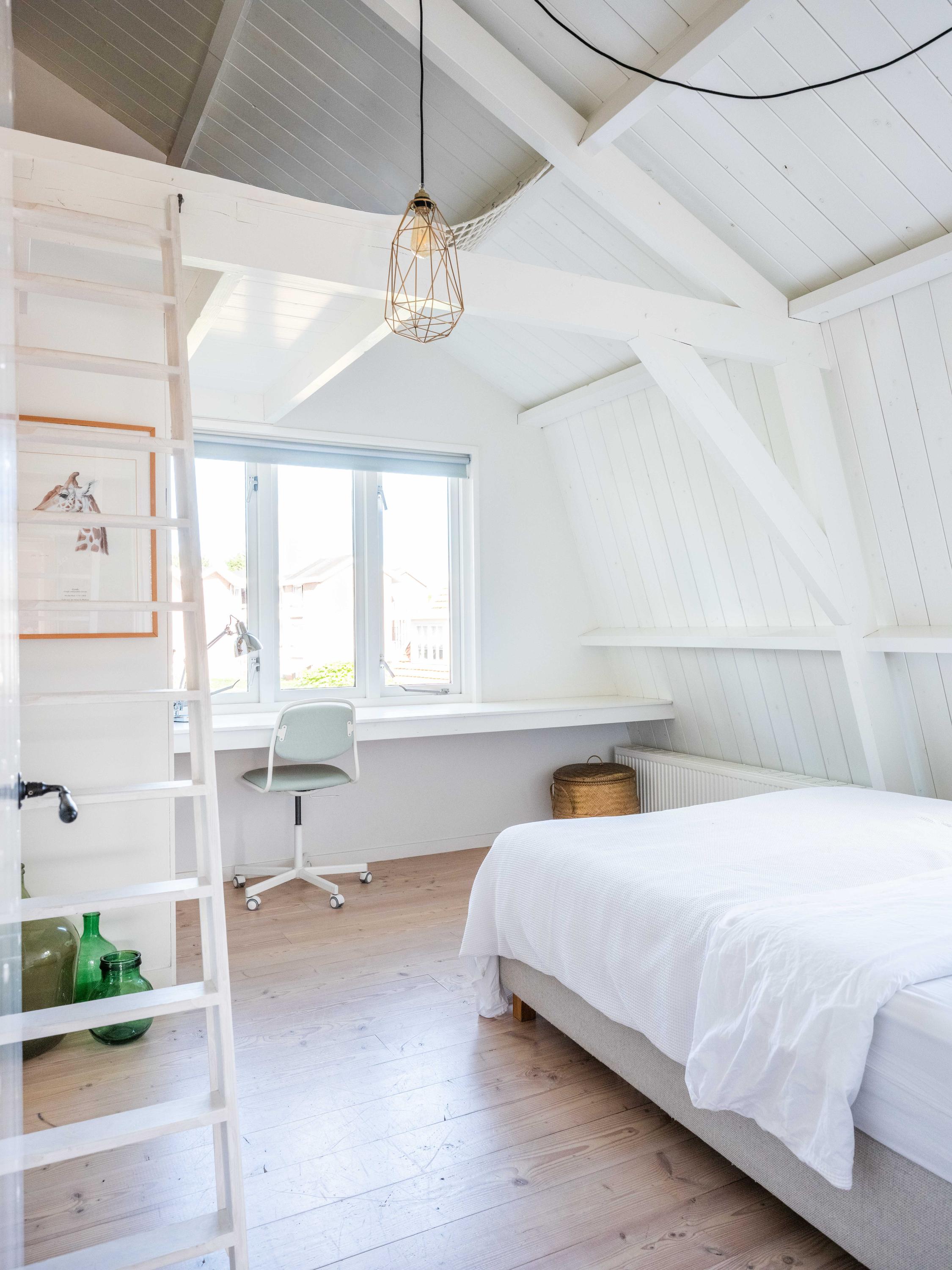 The upper floor offers a spacious landing with high ceilings and built-in eaves storage. The generous master bedroom features a small balcony, and the luxurious bathroom boasts double sinks, a walk-in shower, a toilet, a bathtub, and underfloor heating. In addition, there is a walk-in closet and two more bedrooms, divided by a sliding door, each with its own mezzanine.