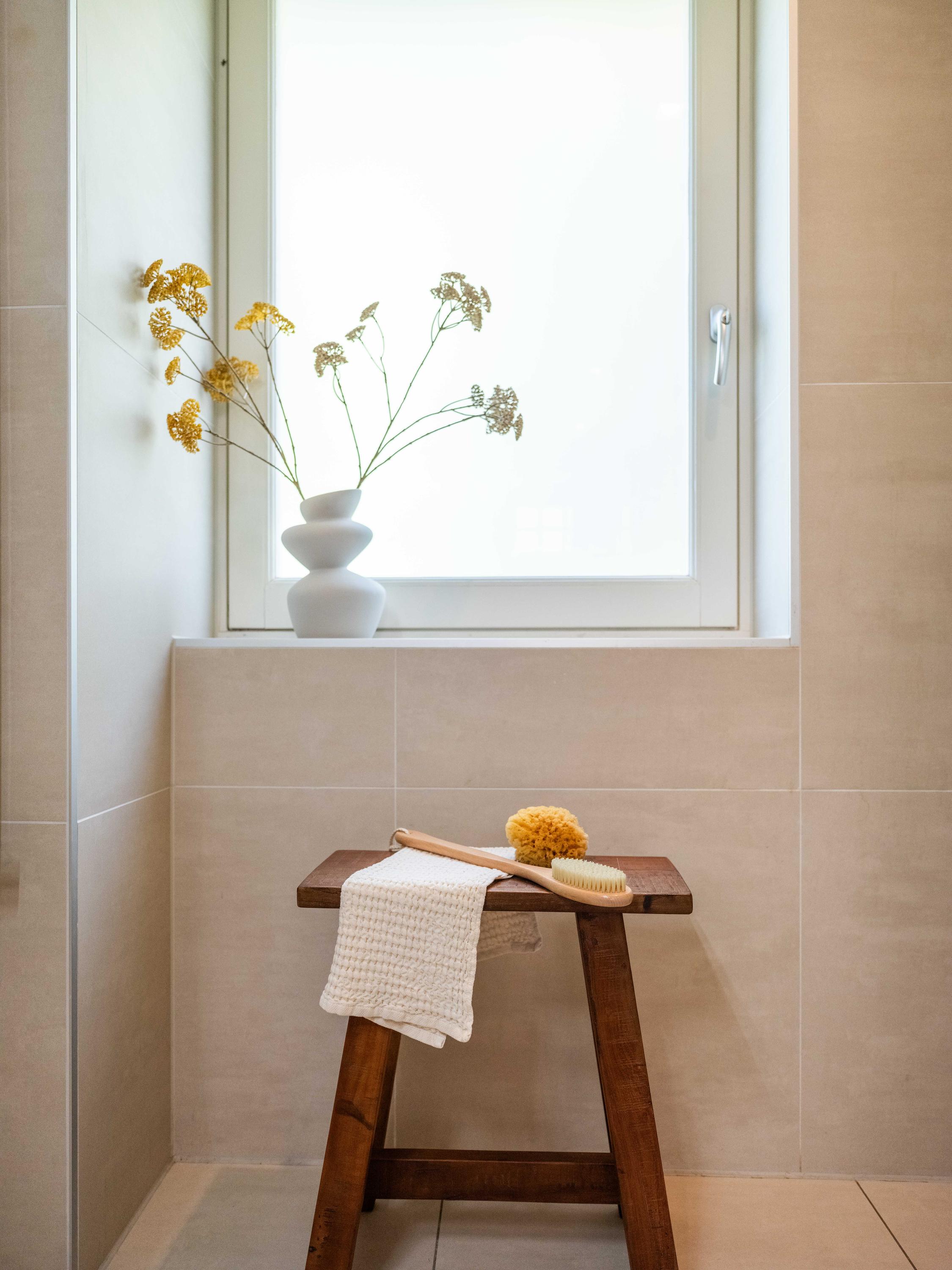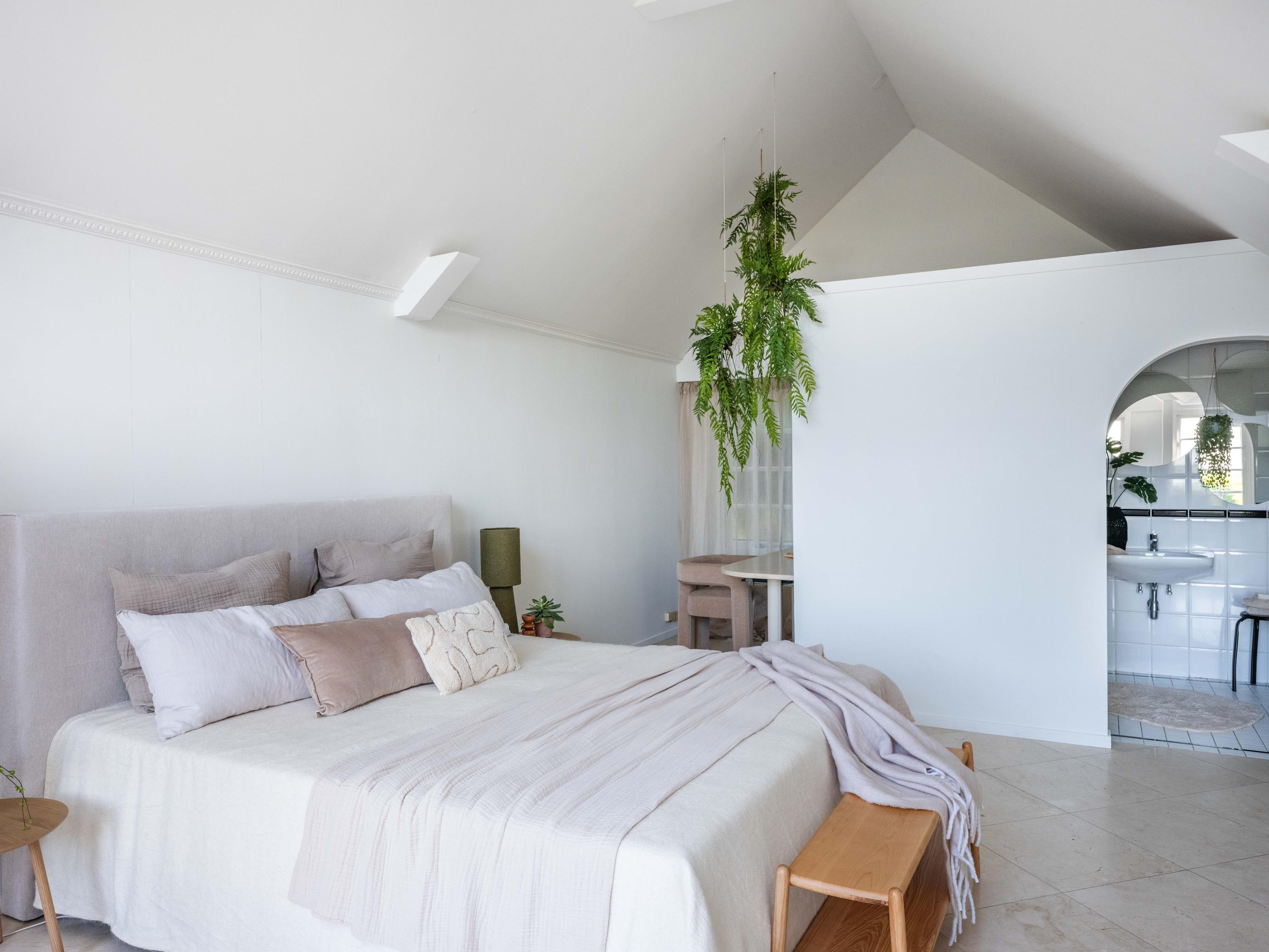 On the second floor, we walk across the loft to the bedroom. This room has closets and provides access to a spacious roof terrace. From the terrace again a great view. The bathroom on this floor is surprisingly spacious and modern (2018). This bathroom has a bathtub, walk-in shower, double sink and toilet.