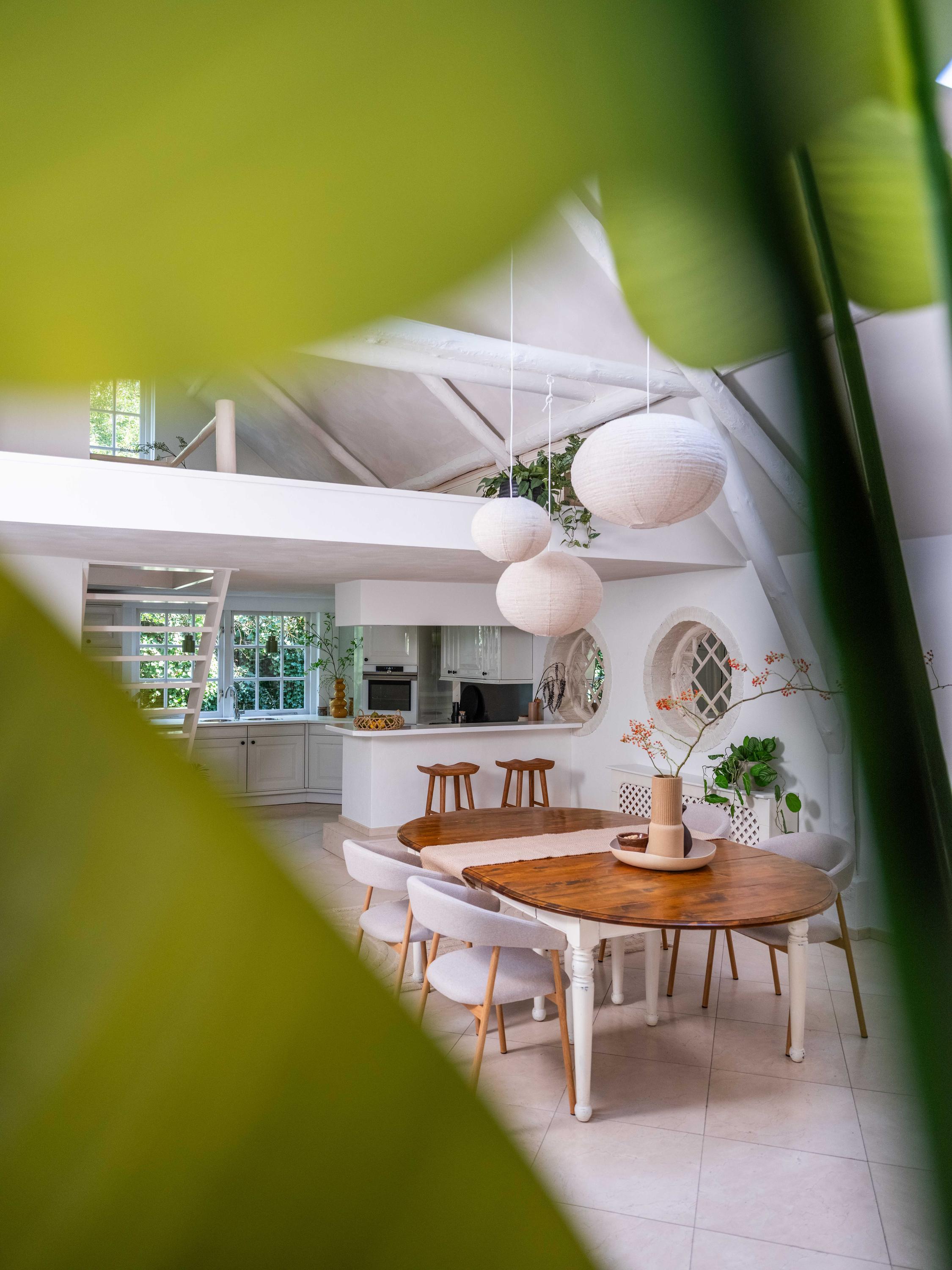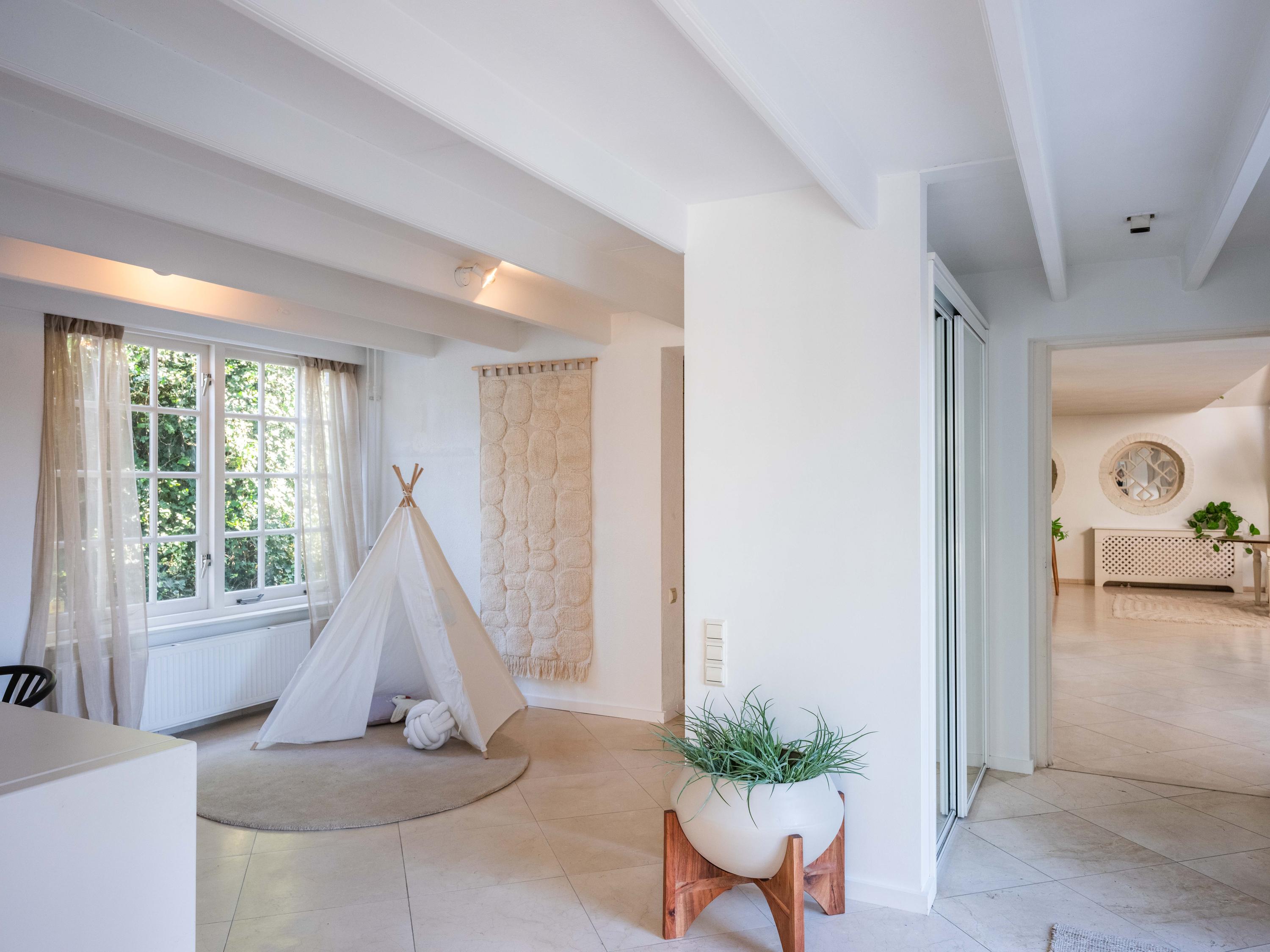 The spacious living room has a cozy gas fireplace (formerly fireplace) in the center of the room. The room is cozy with many authentic details. Think of the wooden beams in sight, a high ceiling up to the ridge and round stained-glass windows. At the back left we find the open kitchen with built-in appliances. From the kitchen we enter the utility room with the connection for the washer and dryer, the central heating system and a door to the outside.