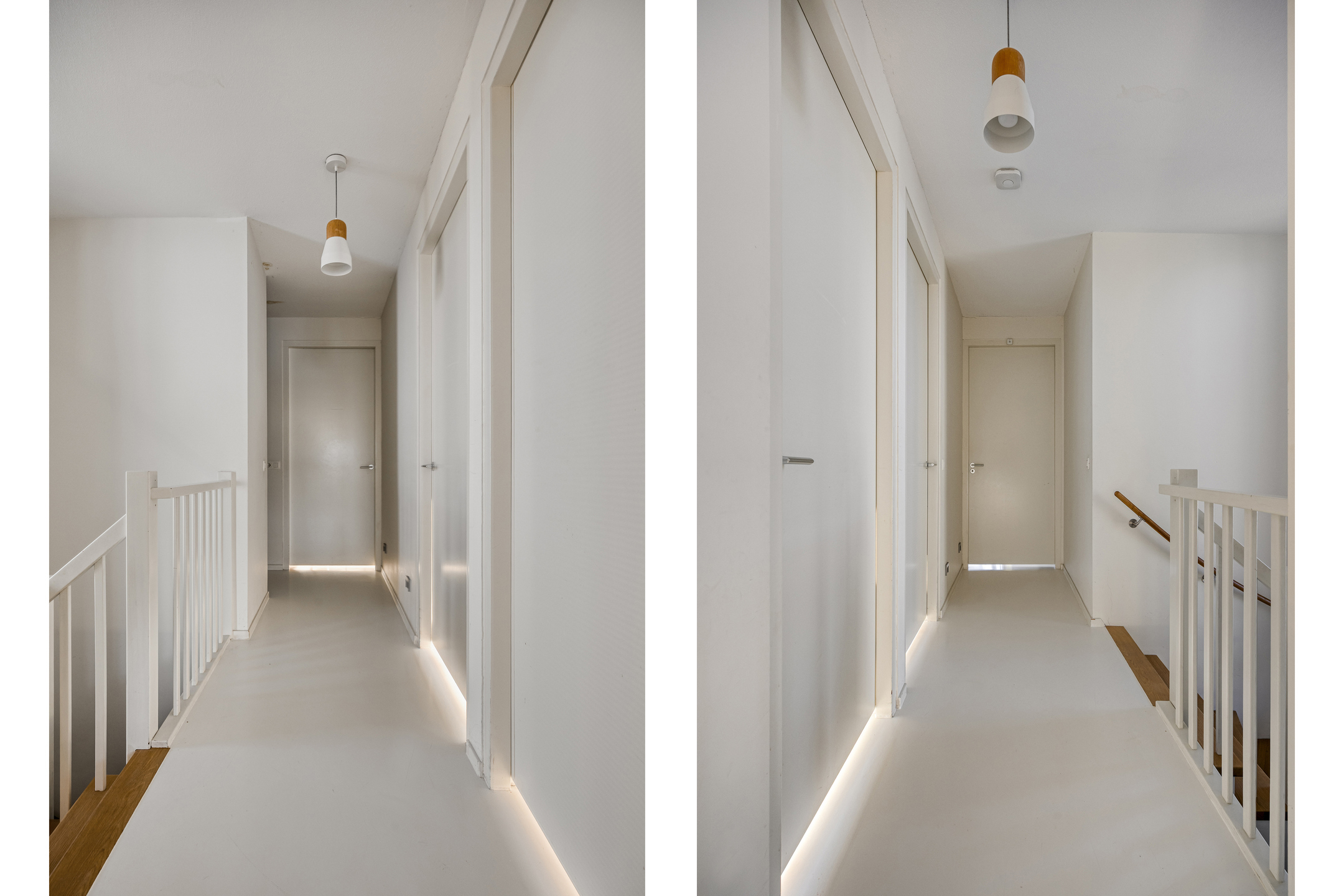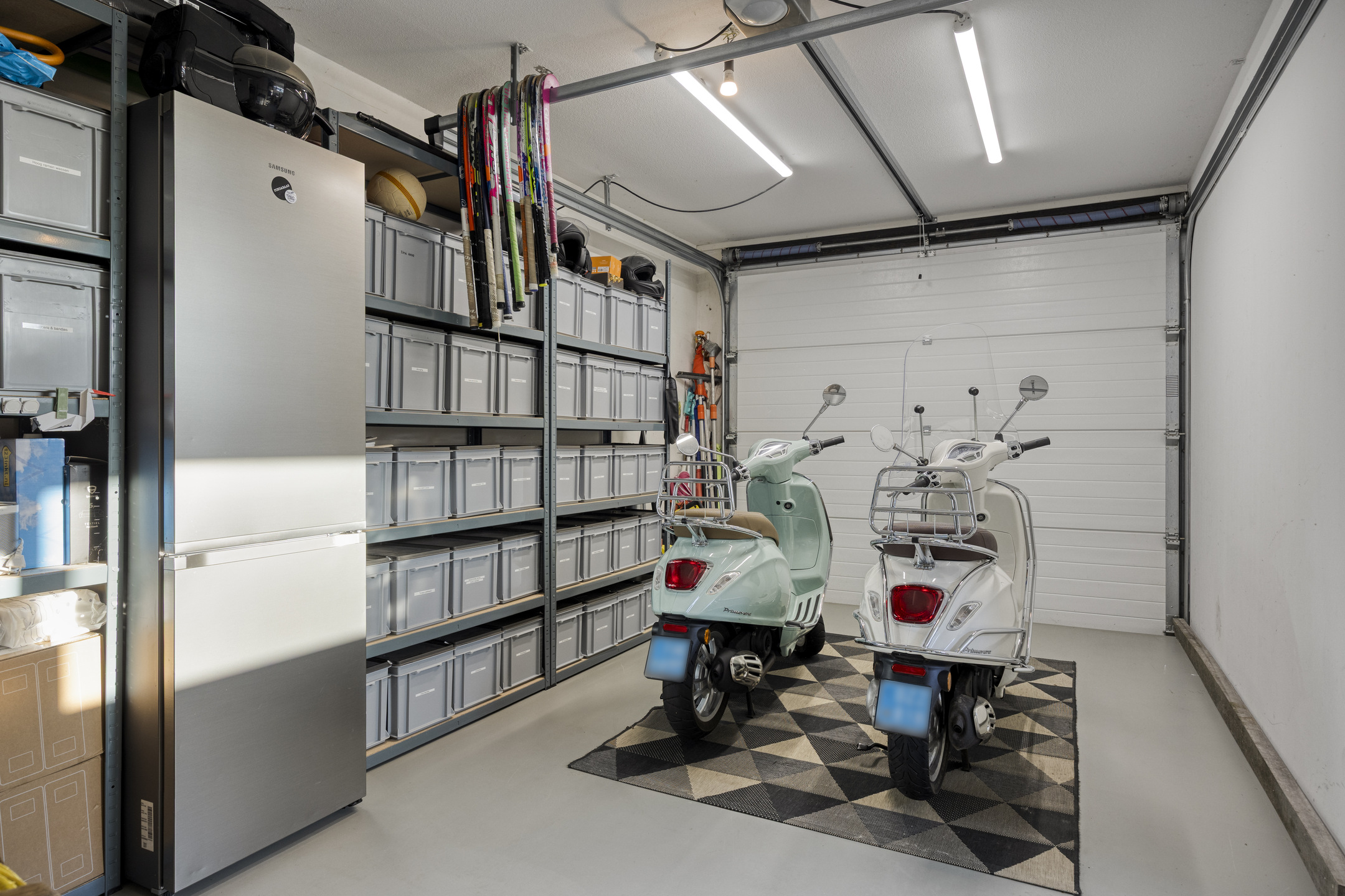 Behind the kitchen lies a transitional space currently used as a home office. From here you have access to the basement level, the garage, and the storage room. The garage and storage area can easily be divided, making it perfect for a home office or professional practice. The basement offers numerous possibilities as well—such as a hobby room, fitness area, or studio.