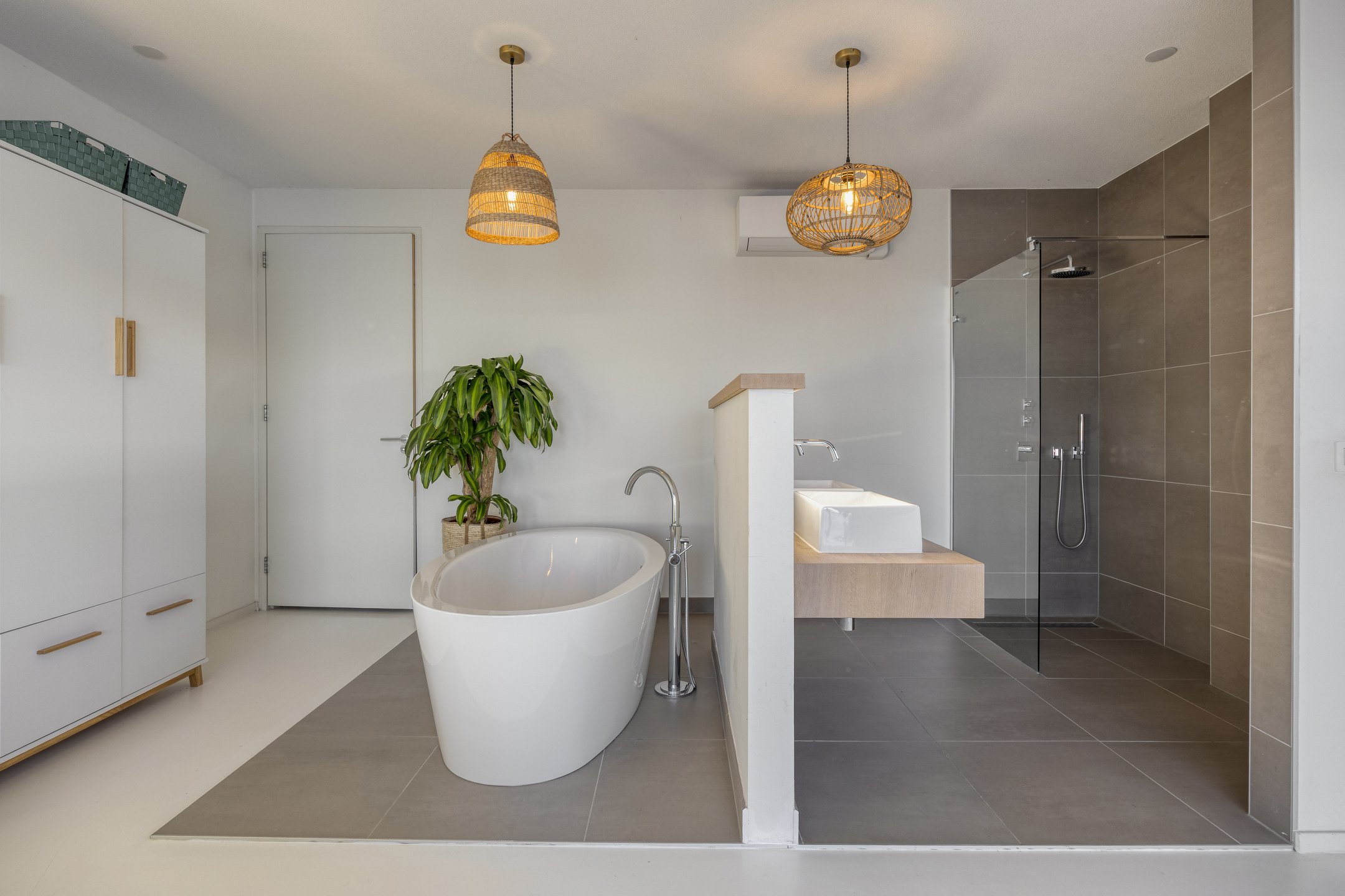 Main bedroom (approx. 34 m²) at the rear: with walk-in shower, freestanding bathtub, double washbasin, sliding doors with French balcony, and air-conditioning unit (2025).