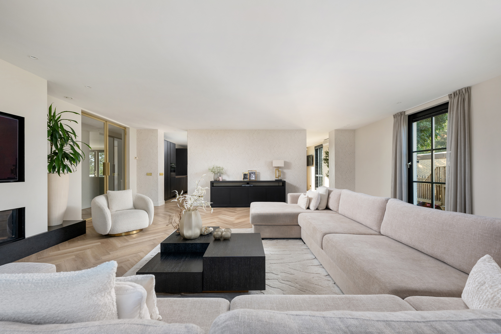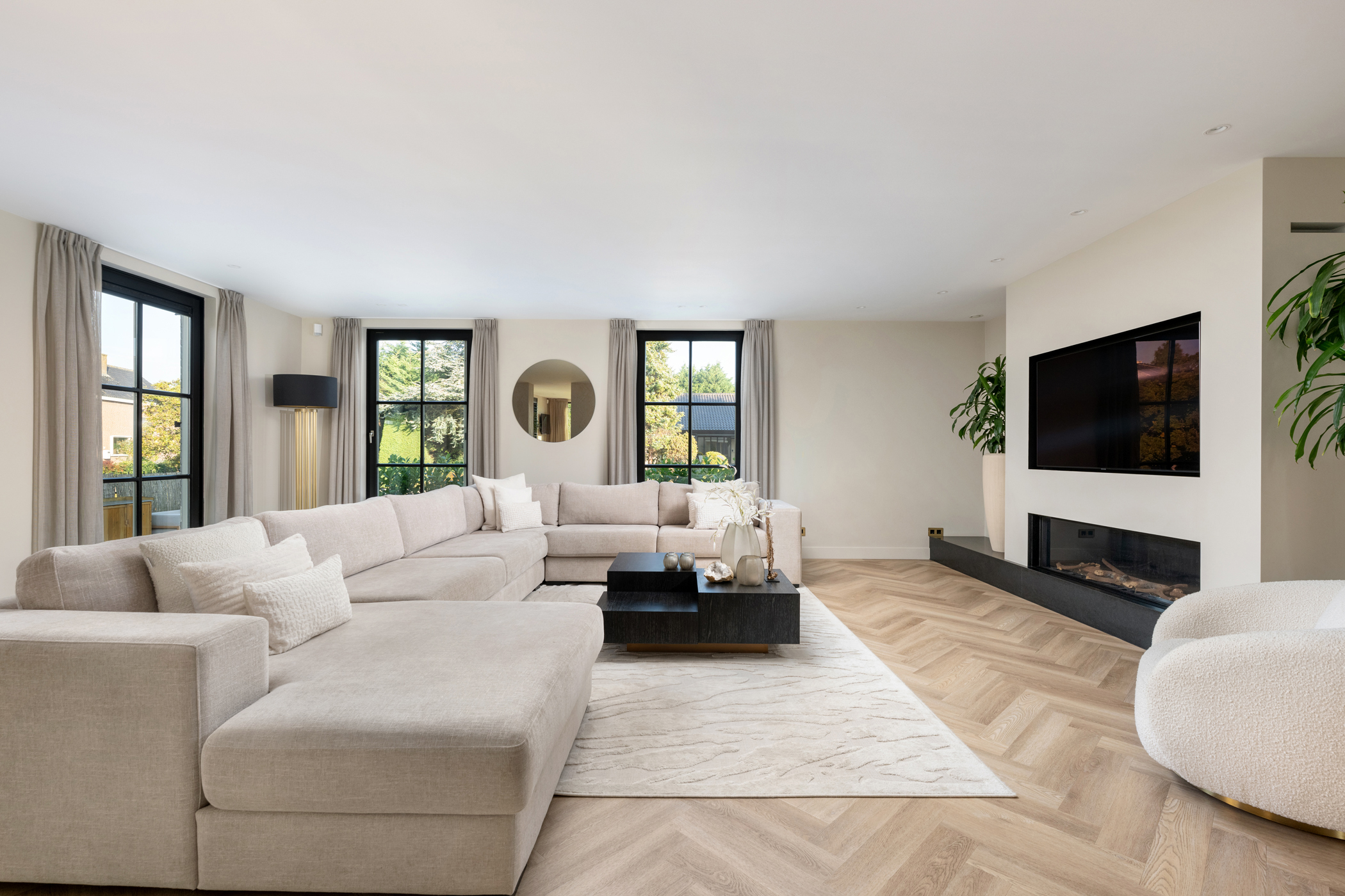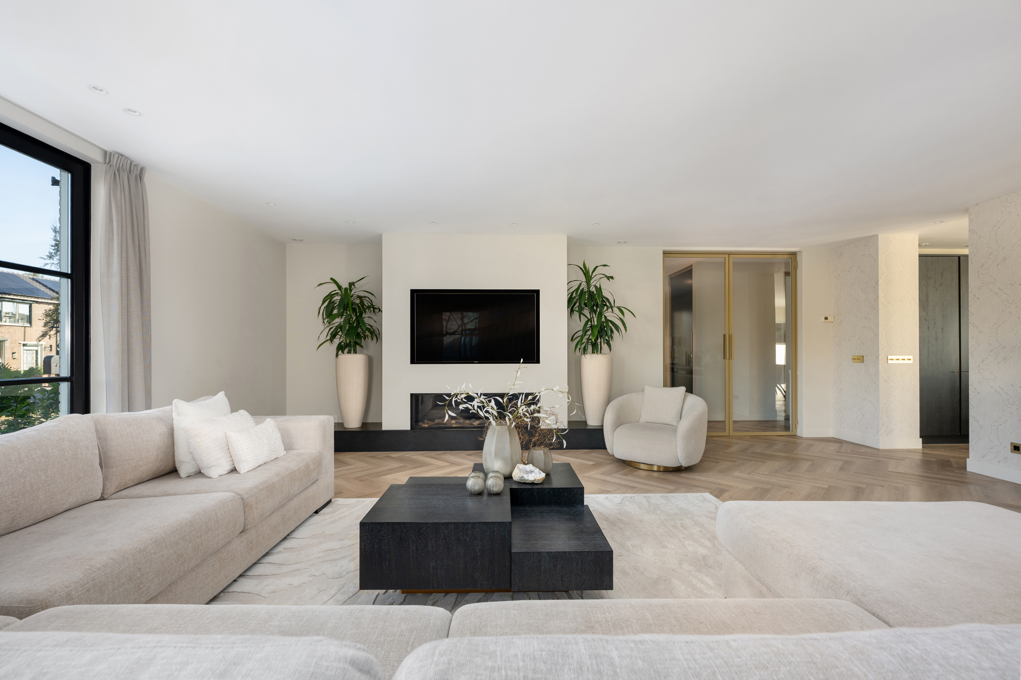 The generous living room features a modern electric fireplace, screens, roller shutters, and air conditioning, as well as a PVC herringbone floor with underfloor heating. Large windows ensure the space is filled with natural light and feels bright and airy.