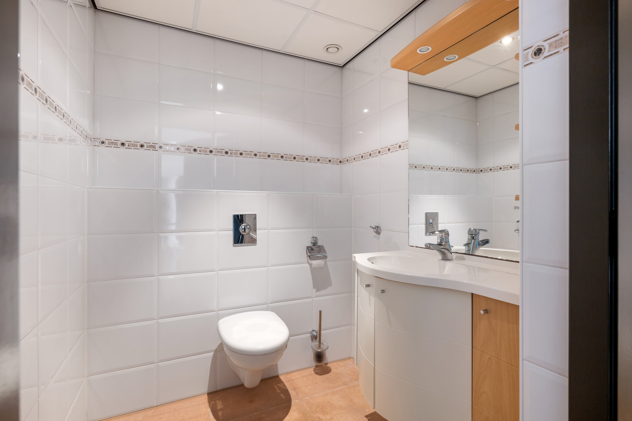 At the end of the landing is the second bathroom, fitted with a toilet, washbasin, and shower cabin.