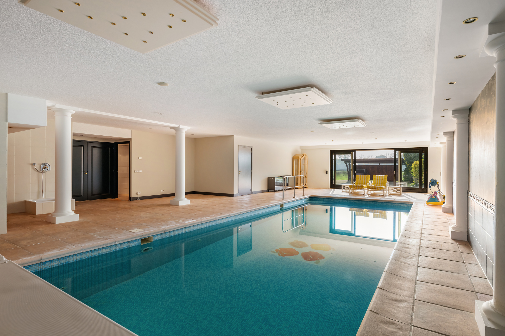 Through French doors, you enter the wellness area, which includes a technical room, pantry, sauna, toilet, and a luxurious indoor swimming pool. Sliding doors from the wellness area lead to the rear garden and the detached garage, which has a hobby greenhouse attached to the back.