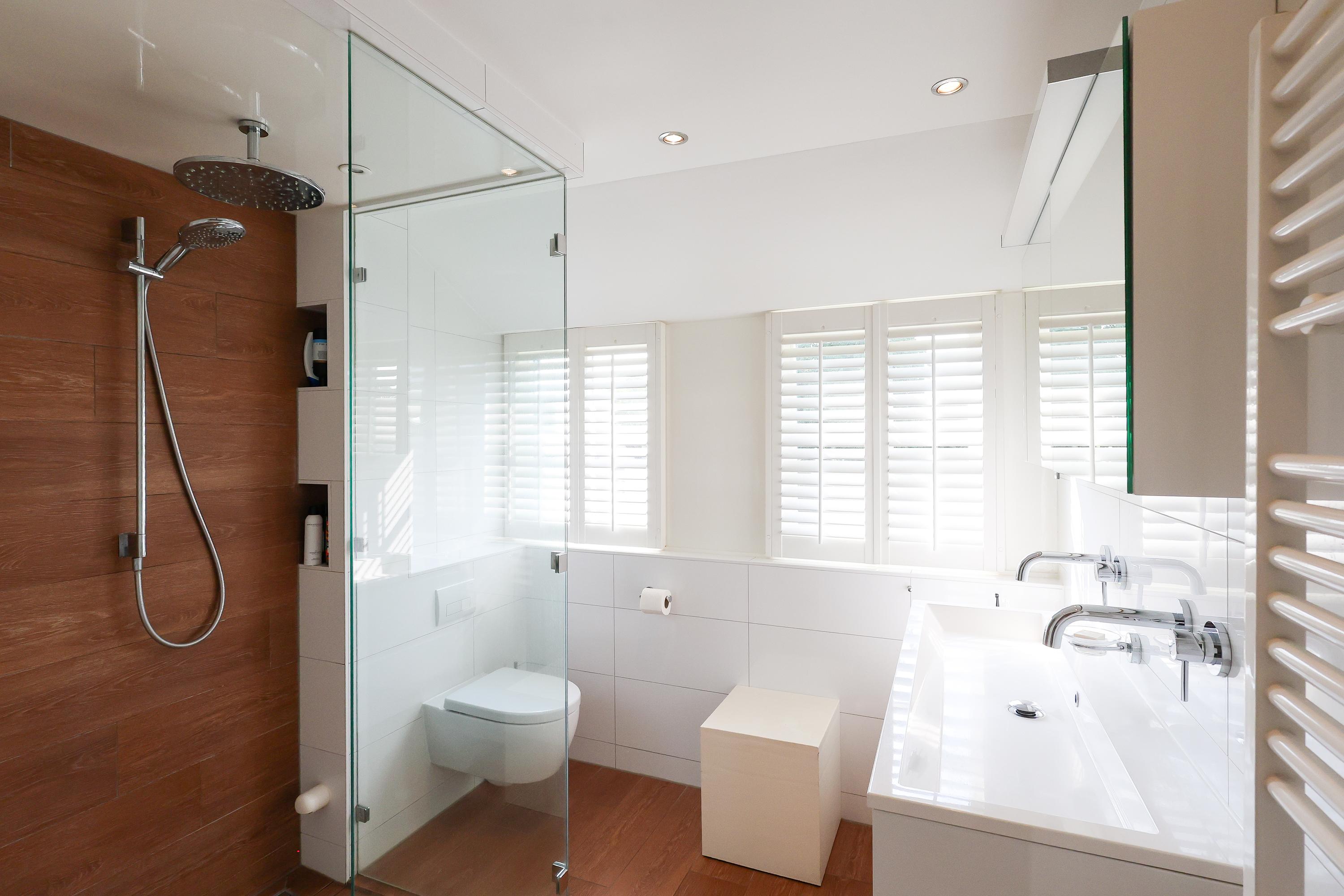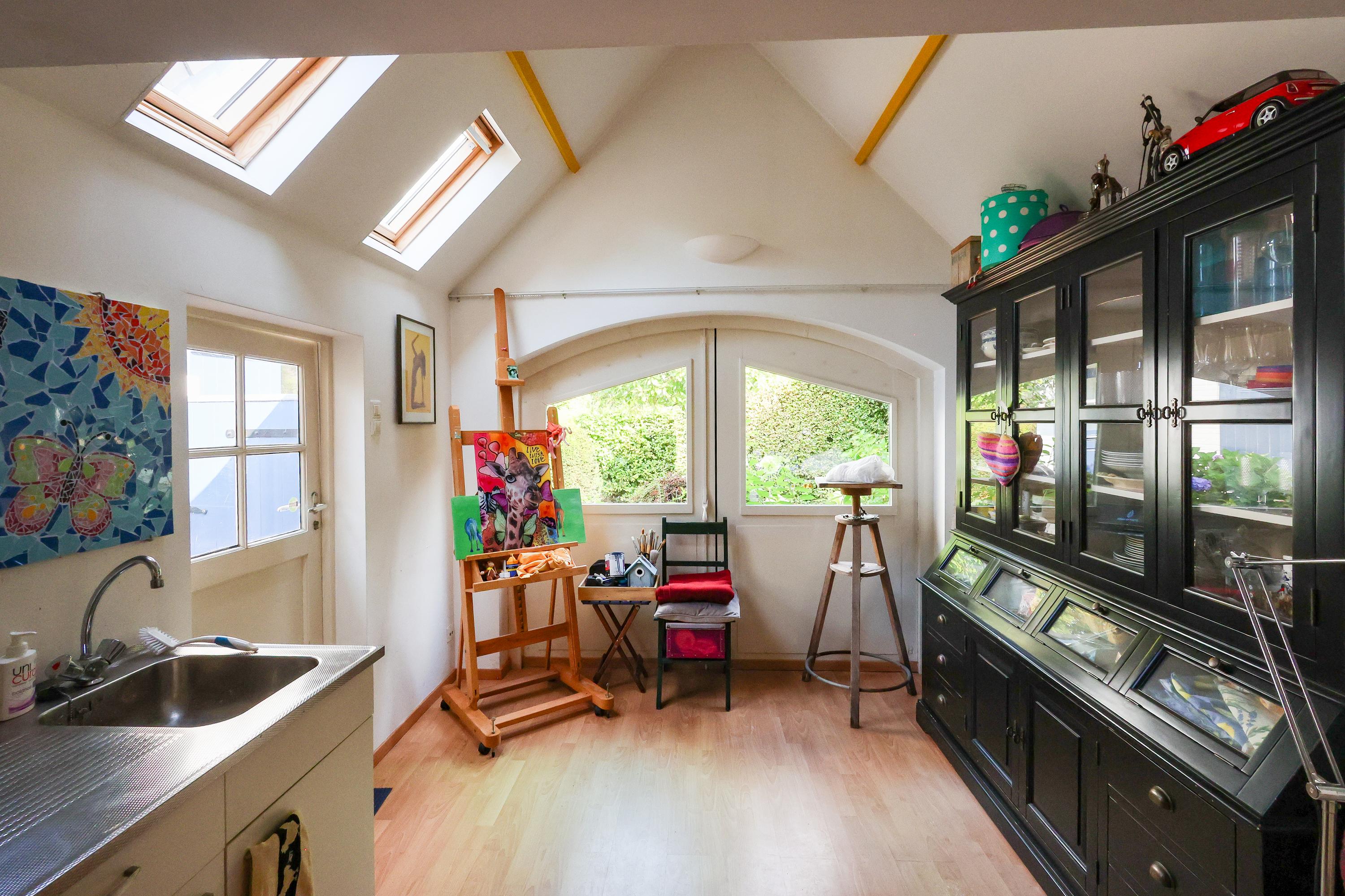 Upstairs, the master suite is noteworthy for its vaulted ceiling and balcony, accompanied by two additional bedrooms, a study, and a modern bathroom with underfloor heating, walk-in shower and a steam cabin. The former garage, now a 16 m² detached studio, offers heated, light-filled workspace with water and electricity.