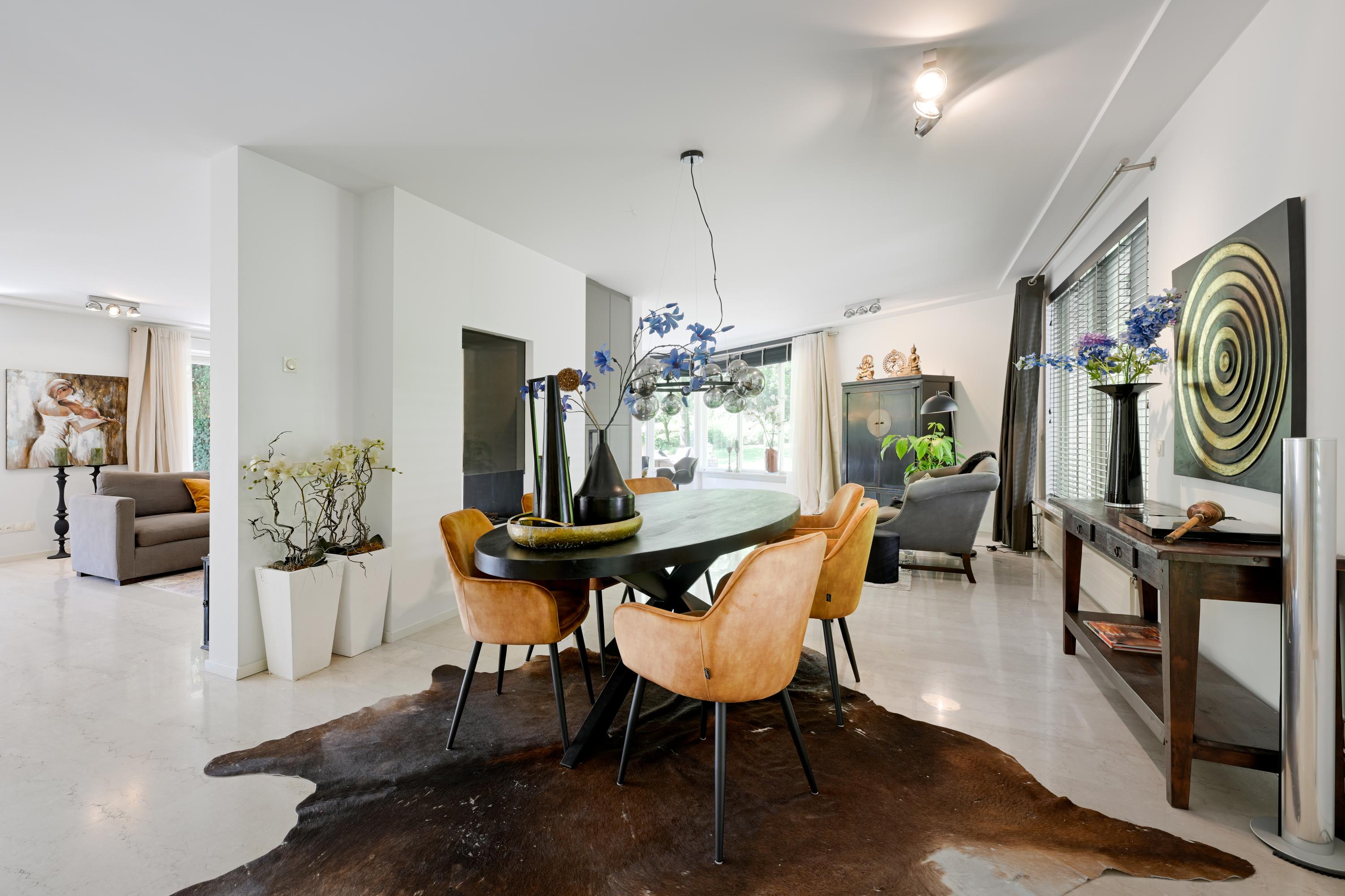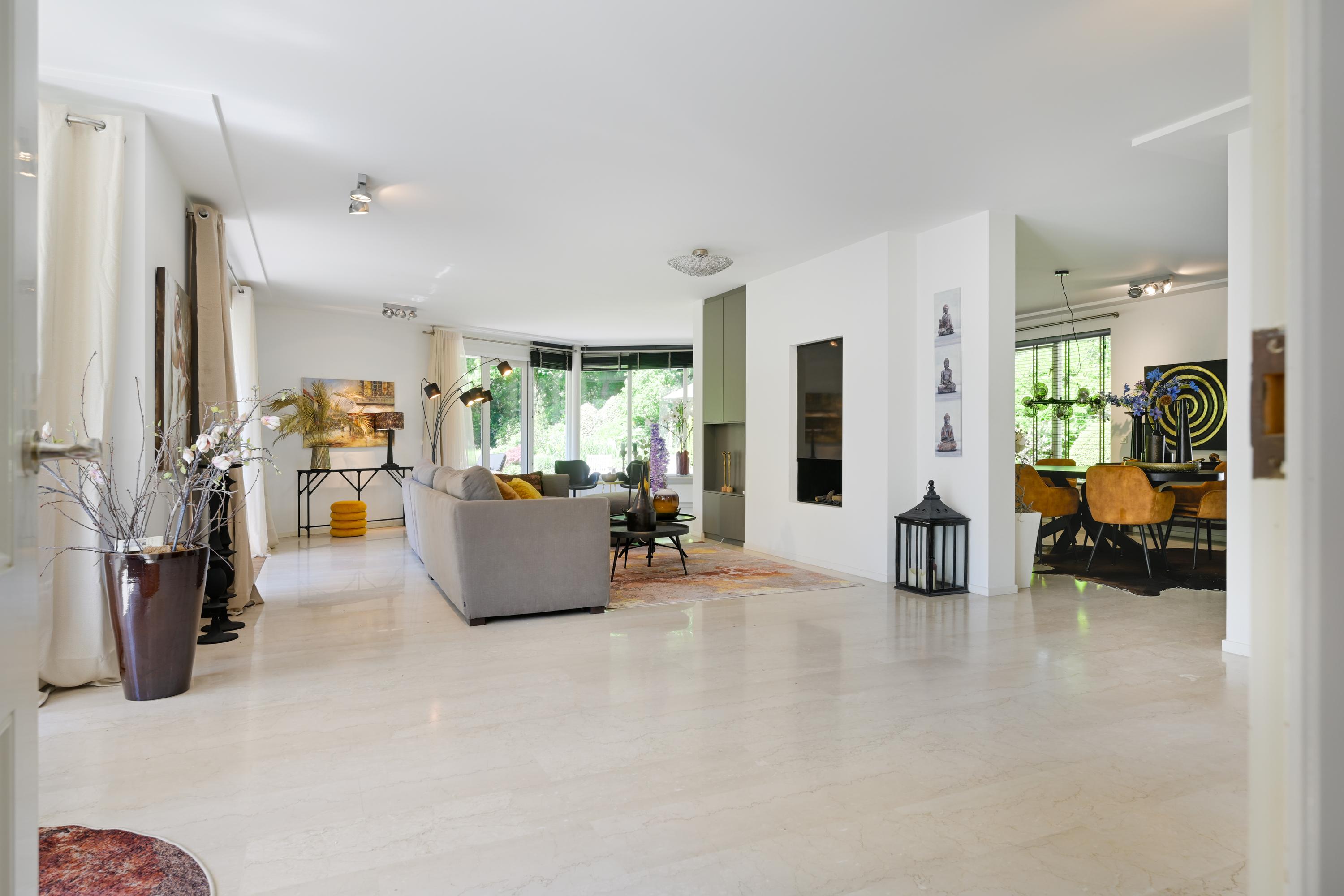 Spacious hall with staircase and lift, modern toilet and cloakroom, double doors to bright, spacious living room with round bay window, cosy living room with (gas) fireplace and garden-facing bay window with French doors to the terrace (southwest), from the hall and living room access to the spacious, bright kitchen with multiple built-in appliances, utility room with connections for washing and drying appliances, door to the garden. Next to the hall is a study/workroom with custom-made curved cupboards and a bay window at the front.