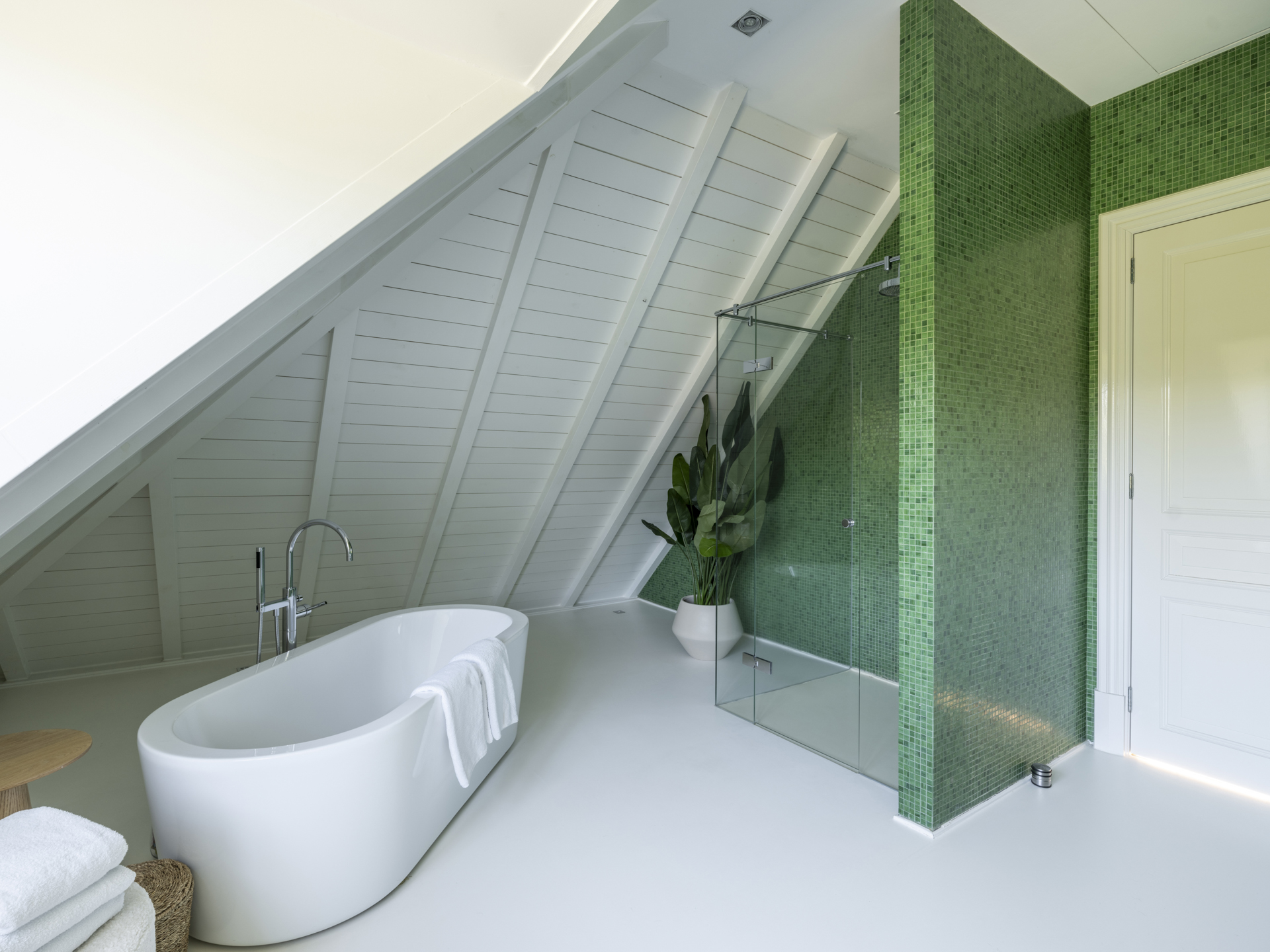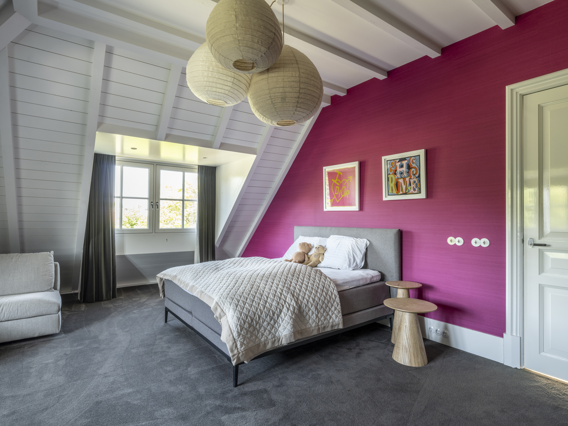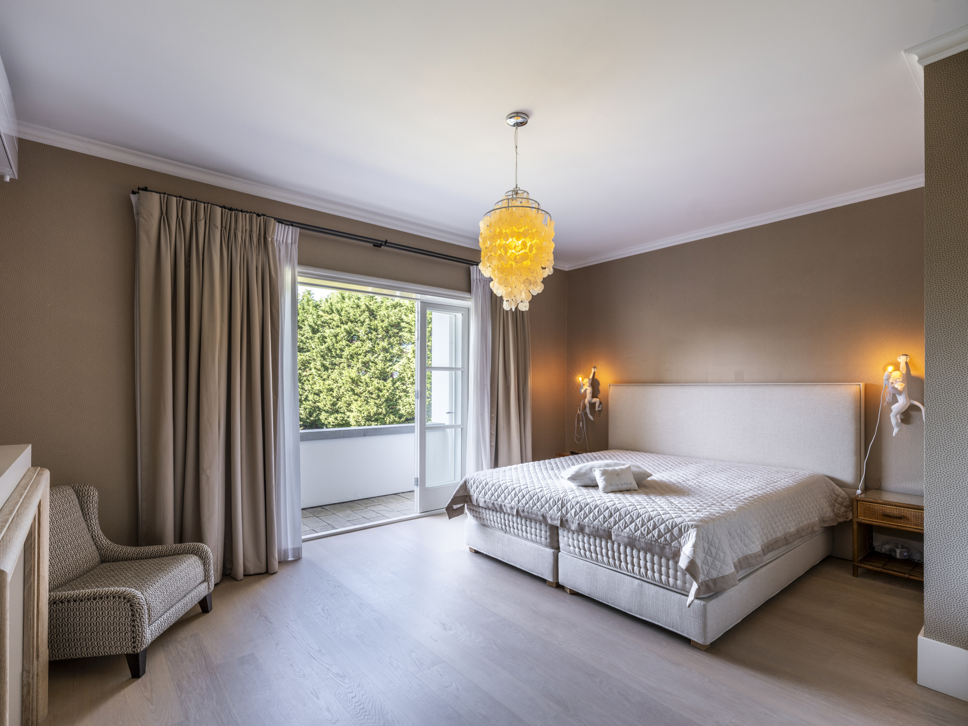 The main level flows from a stately entrance into luminous, open-plan living and dining spaces, anchored by a luxury kitchen whose glass walls draw the garden inside. A covered veranda with an open fireplace extends this sociable core into the landscape, while a quiet study and dedicated TV/work rooms balance retreat and connection. All seven bedrooms are air-conditioned, with the master suite offering both a garden-view balcony and a spacious dressing room adjacent to a double bathroom. The upper floors and attic grant additional bedrooms, private guest suites, refined bathrooms, and tailored storage throughout.