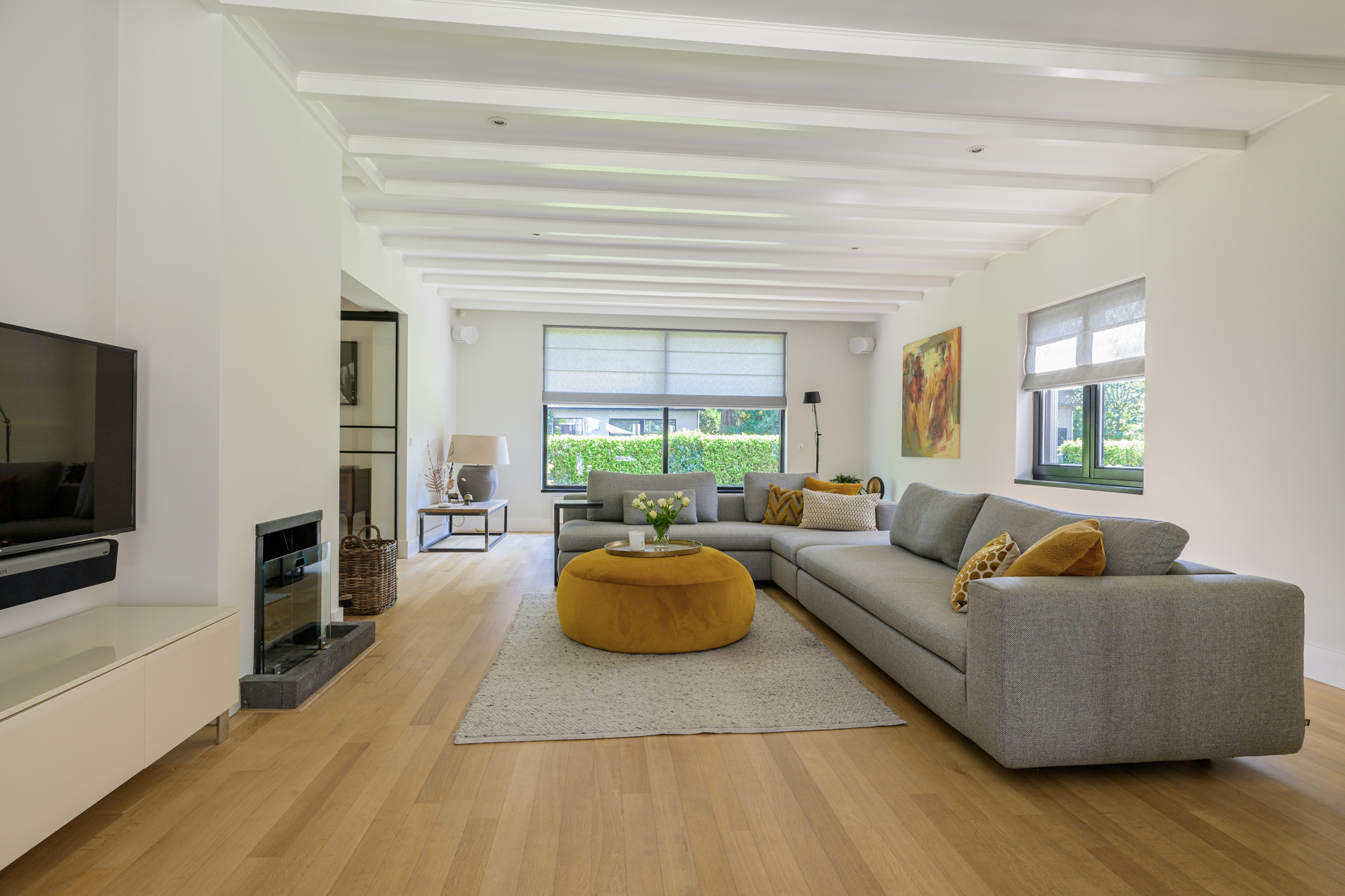 Living room with beautiful natural light and a view of the front garden. The living room is equipped with a fireplace, built-in cupboards, and a (solid) wooden floor.