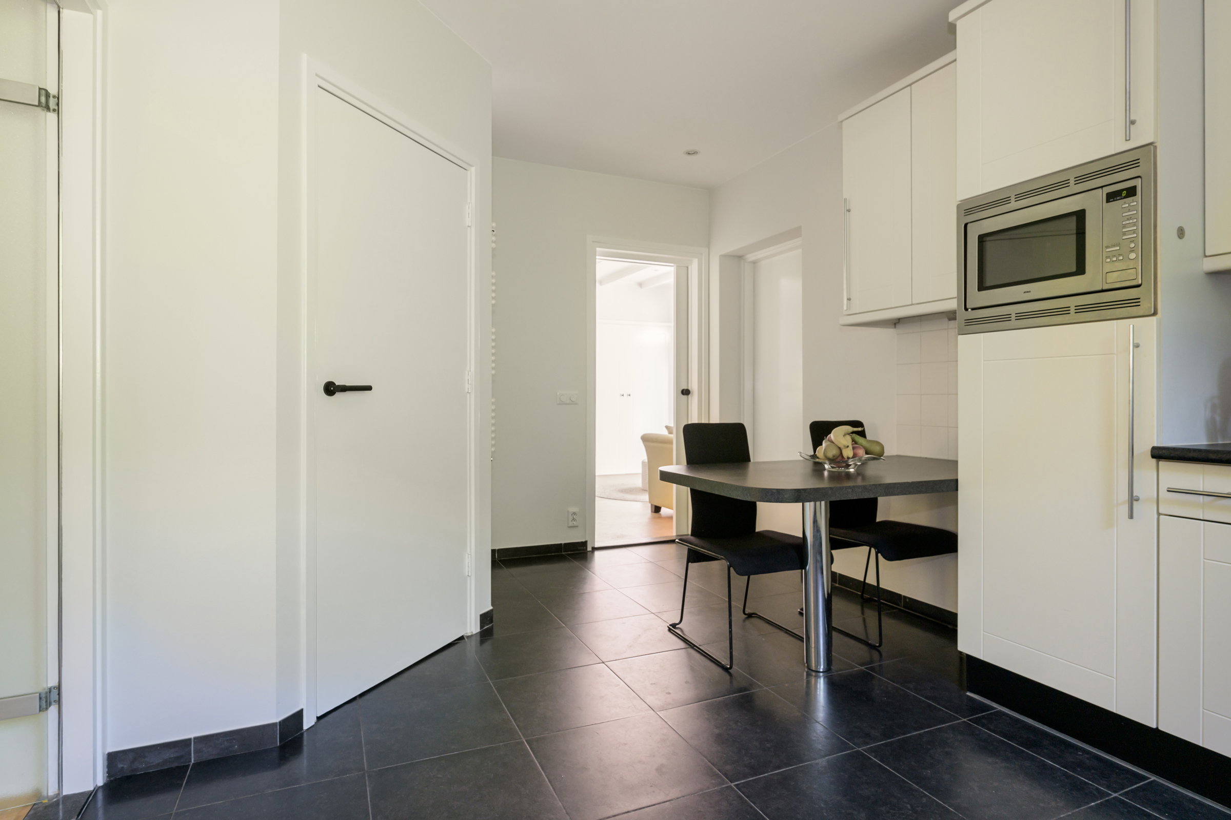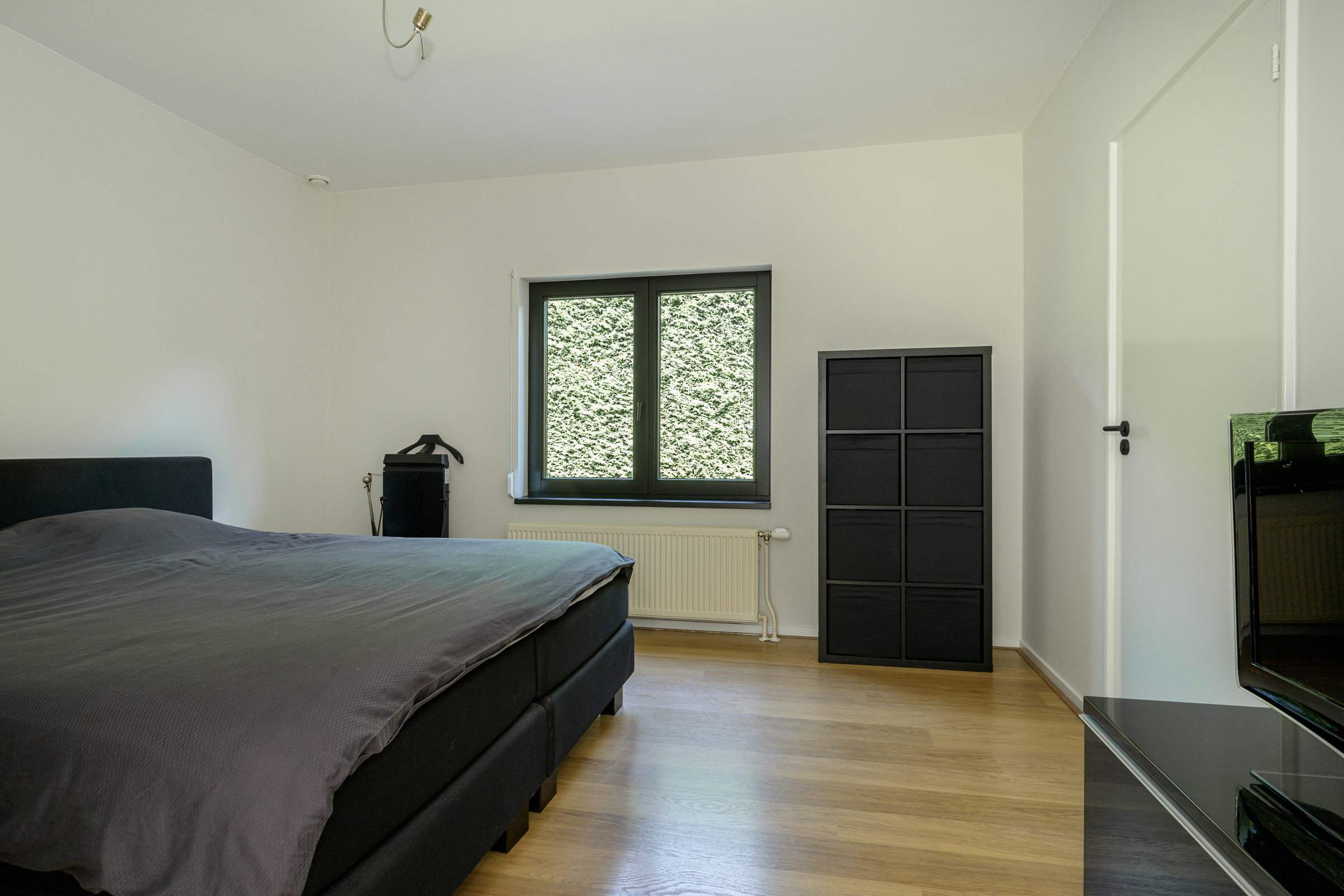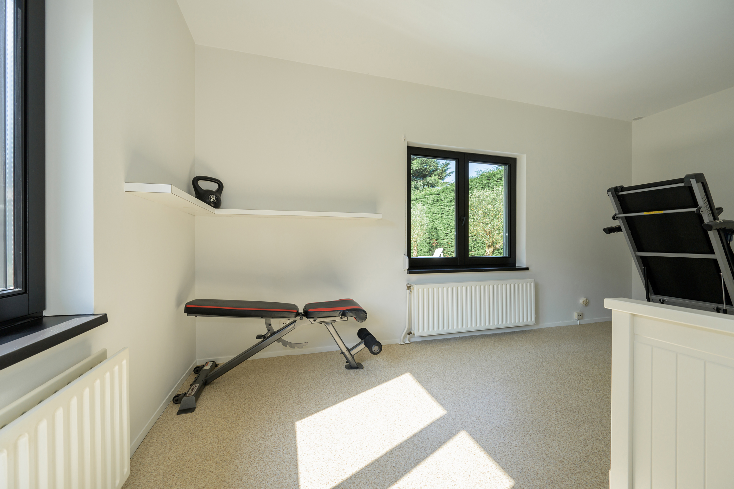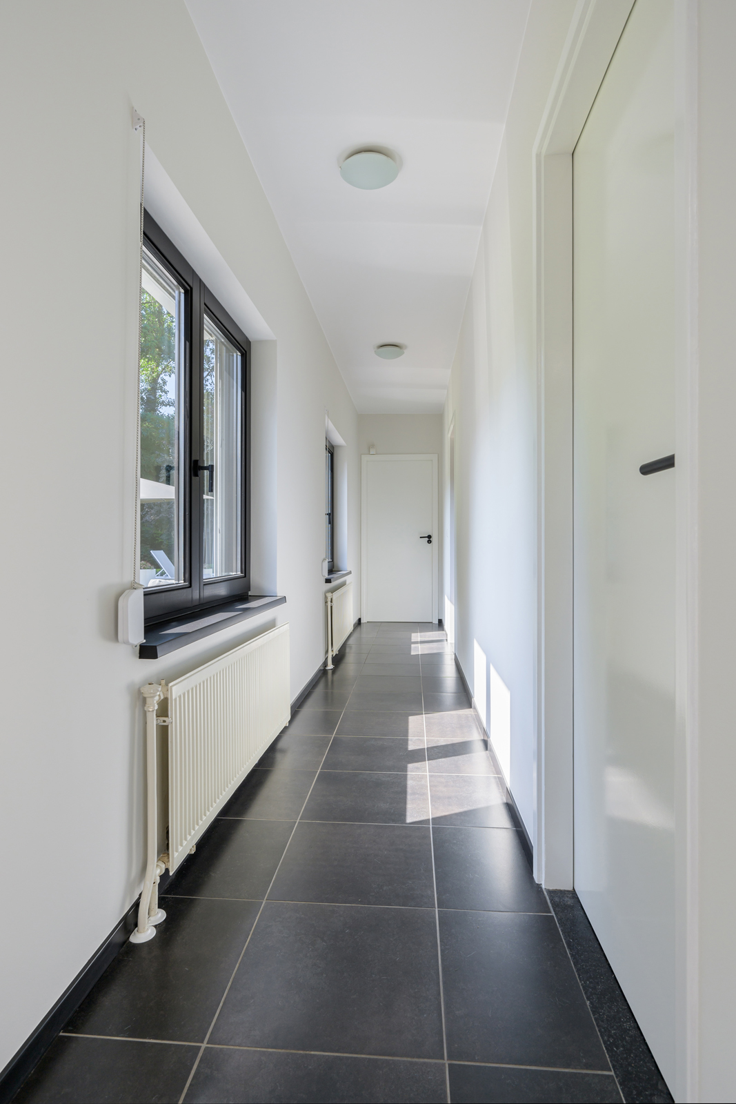 You enter the house through the spacious entrance, which features a slate tile floor. In the hall, you will find the meter cupboard (16 groups + 2 residual current circuit breakers and provisions for an electric car) and the wardrobe.