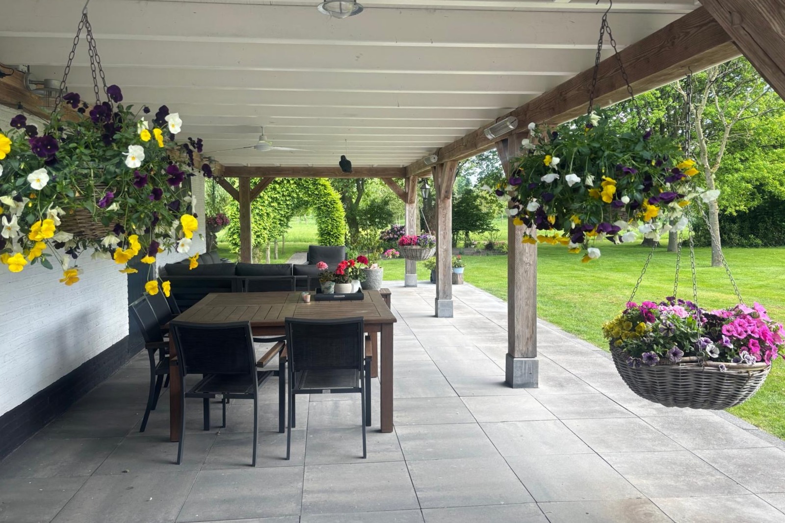 The beautiful, fully enclosed garden surrounds the home, offering maximum privacy and blending seamlessly into the natural surroundings. Several terraces have been laid out around the house with clean-lined concrete tiles. A veranda is situated between the house and the outbuilding and continues alongside and behind the outbuilding, offering wonderful views of the garden. Part of the veranda is equipped with patio heating. The garden includes a large lawn, a fruit orchard, and various trees and hedges. A lovely pond is located next to the house. The driveway, finished with decorative paving, leads to both the carport (space for two vehicles) and the large barn.