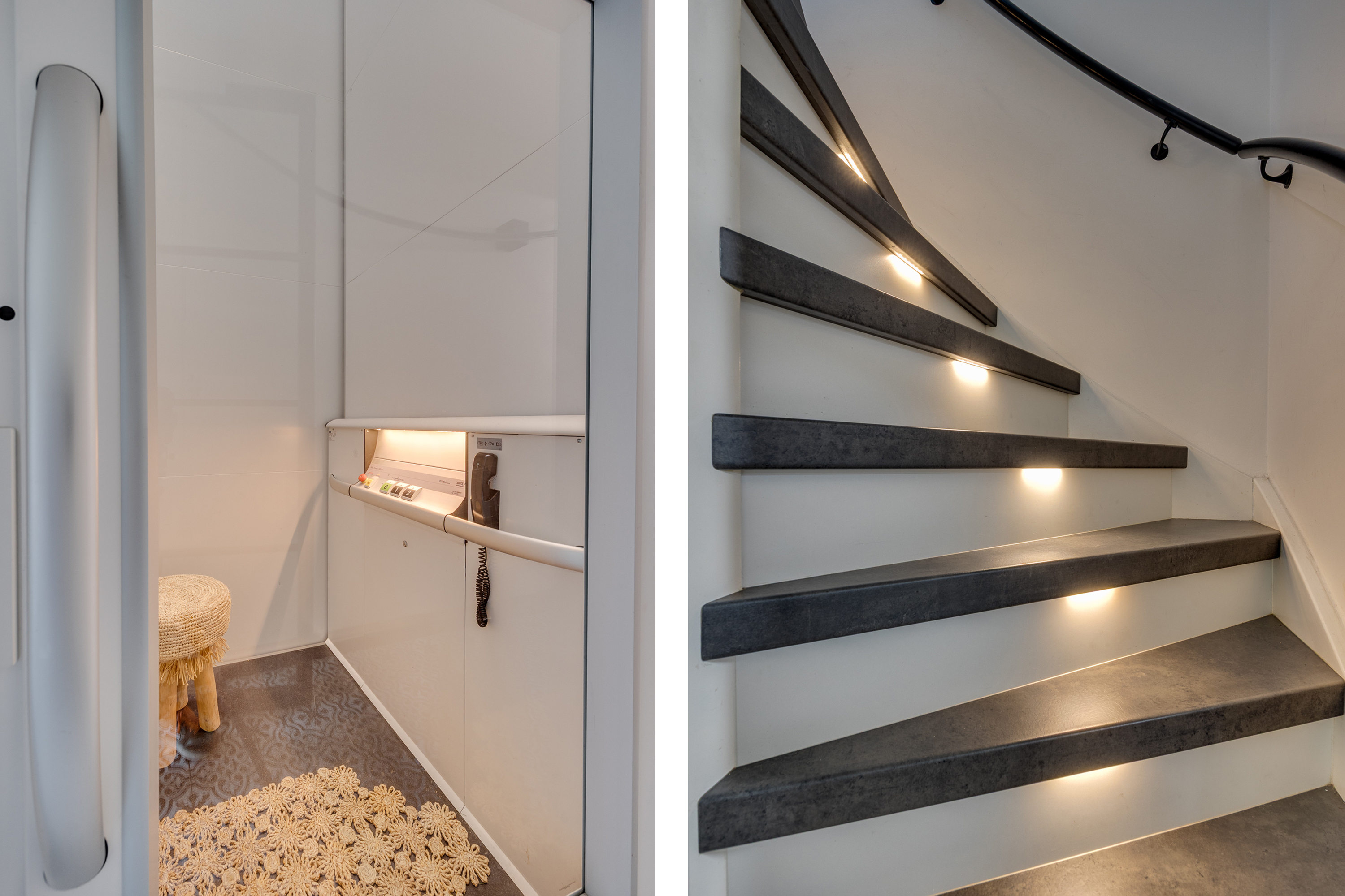Layout ground floor: Through the private front door on Kerkbrink, you enter the beautifully finished entrance hall, with a stunning Moroccan tile floor and elegant staircase with upstairs stair lighting. Here you can choose: take the stairs or use your own elevator (suitable for 5 people) that provides access to both floors, ideal for comfort and future-proof living. From the hall, you reach a spacious storage room, perfect for bicycles, storage, or seasonal items, with an additional exit via a right of way to the Hazeslinger. Ideal when you come home by bike!