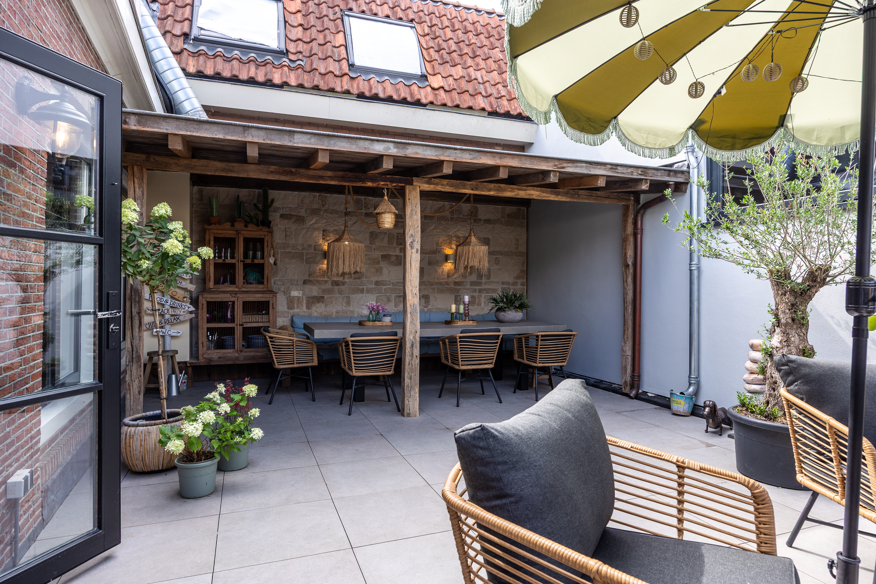 Through a hallway with built-in cupboards and space for an extra refrigerator, you step right onto the roof terrace. This spacious, sunny terrace is fully tiled and equipped with an attractive canopy, a fixed bench, and a custom-made table. Here you will experience complete peace and privacy, right in the center of town. A wonderful outdoor retreat, perfect for dinners, drinks, or a cup of coffee in the morning sun.