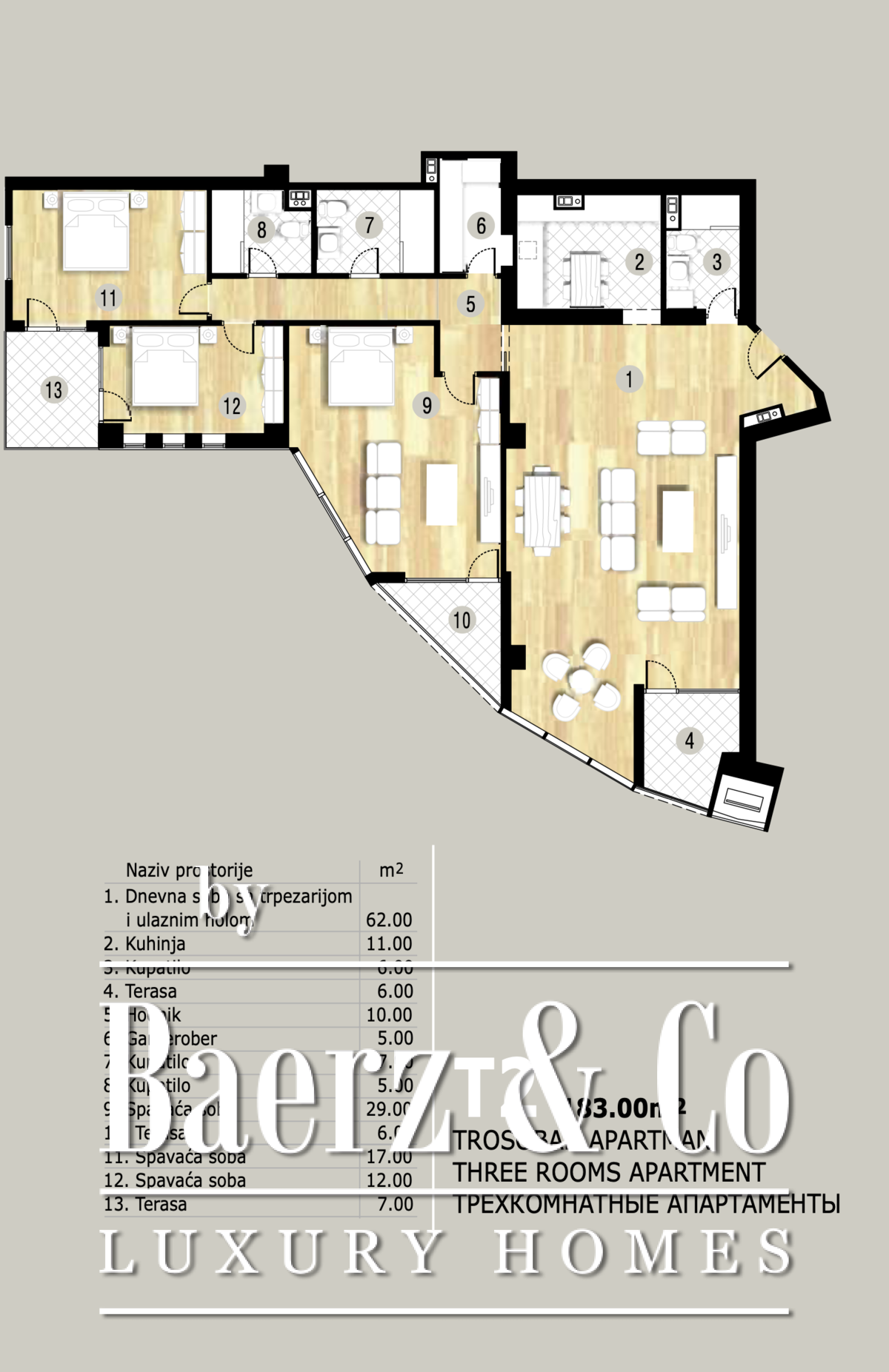 This premium spacious apartment is located in modern building, 100 m from the sea and 300 m from Budva Old Town. It has exceptional views towards Budva Old Town and the sea. Apartment is not furnished, it has 3 bedrooms and 3 bathrooms.