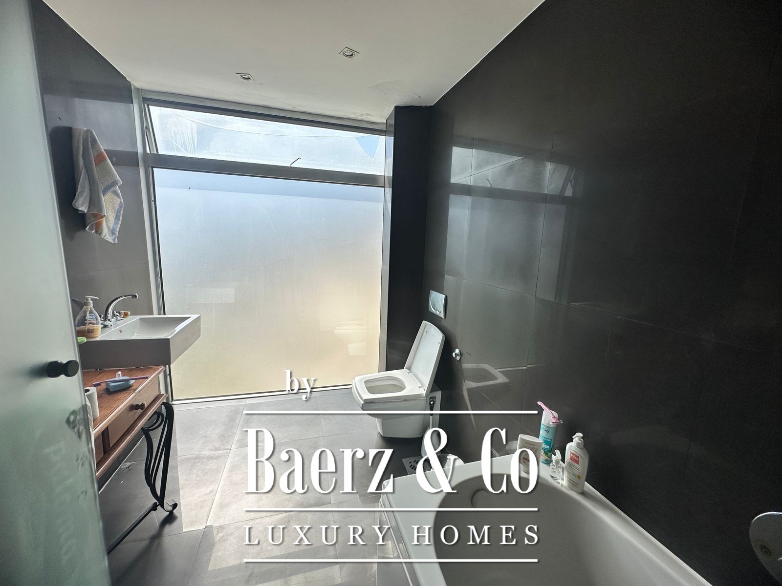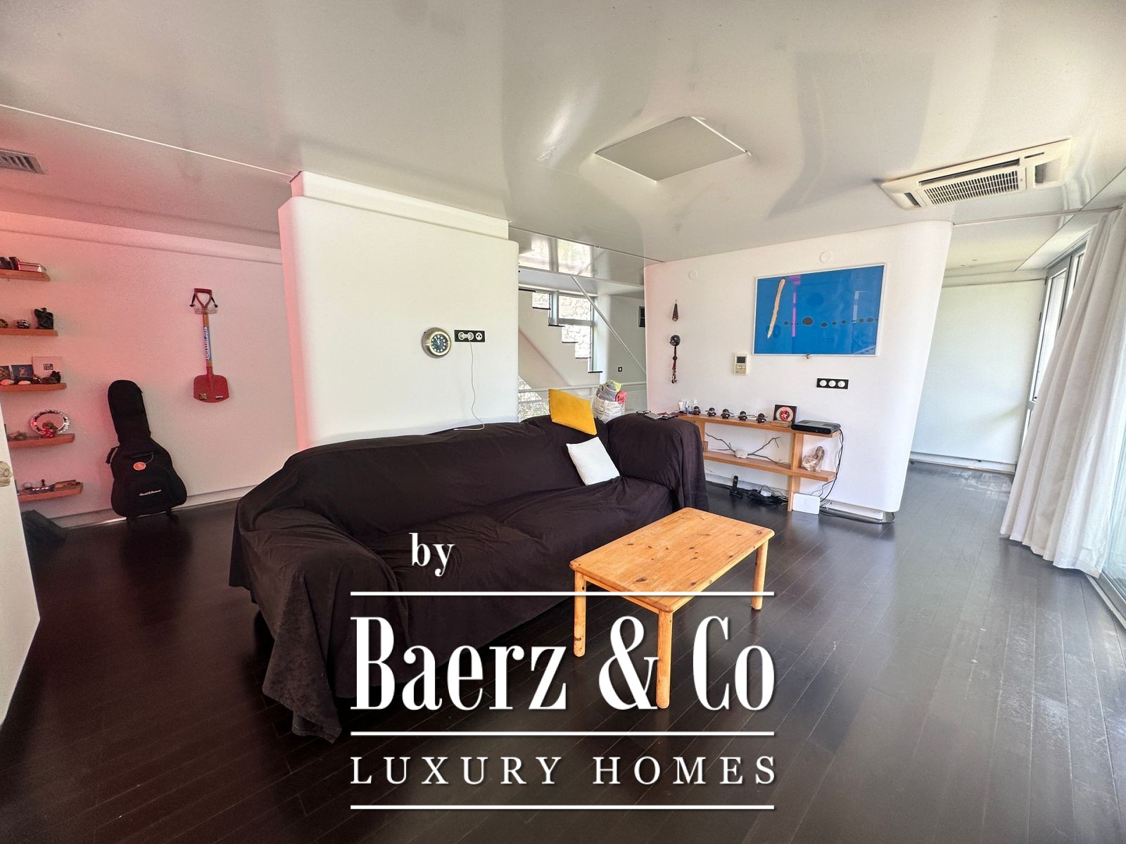 Additional info: the house was designed in the style of art brut, built of cast concrete without bricks and tiles. Around the house are 4 olive trees that are 250 years old, and palms. In front of the house there is a mold that is 4 meters deep, built for the future installation of the pool. The basement has 3 parking spots (130m2) with a commercial space (23m2 with direct entrance from the street) and a generator spot (6m2). The ground floor is constructed with round walls, barisol translucent ceiling, black bamboo parquet and handmade furniture made out of full black wood. The roof terrace has a solar panel and a seaview - a summer kitchen could be built. The ceiling has installations for "smart house" system and air conditioning.