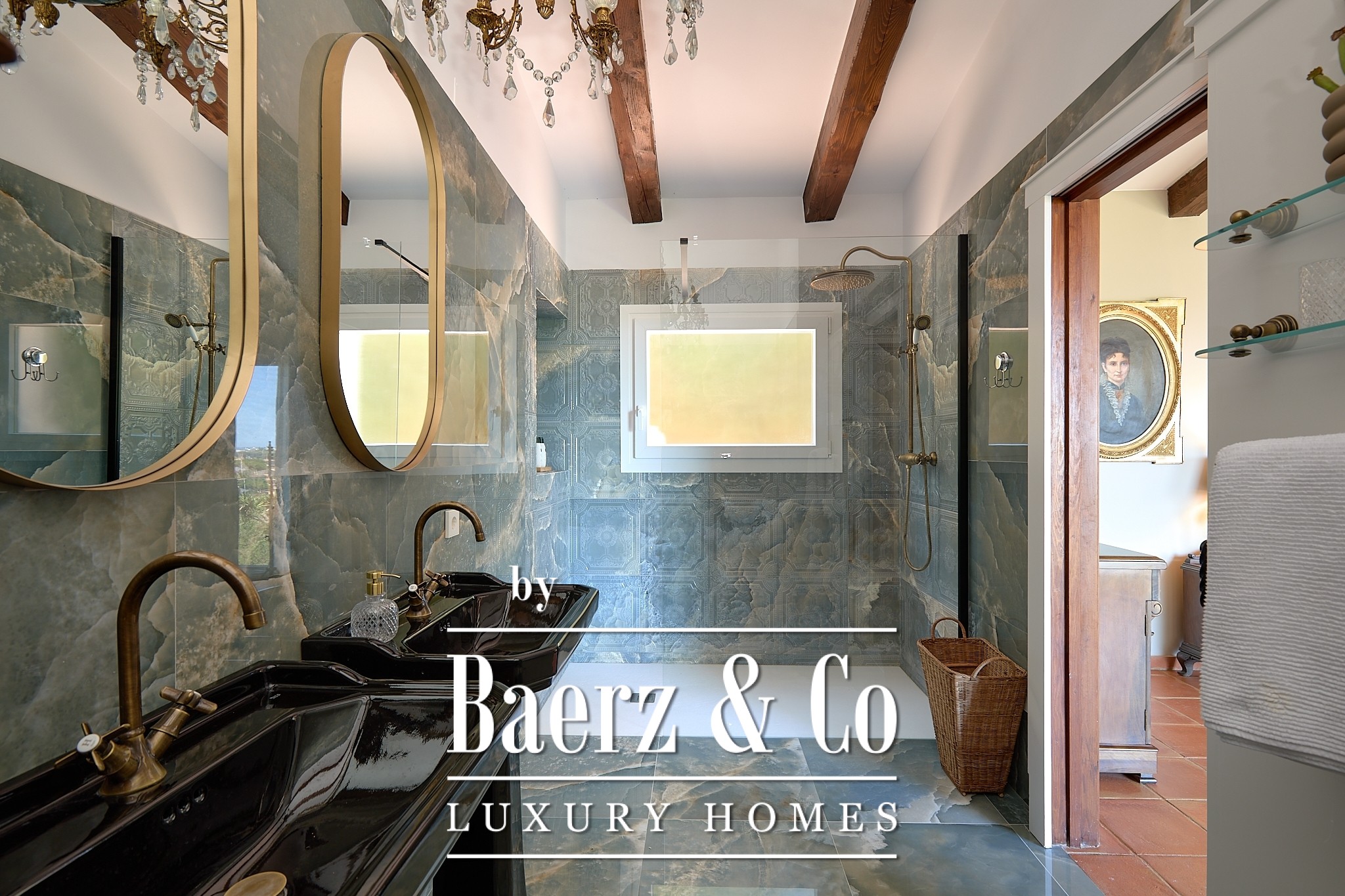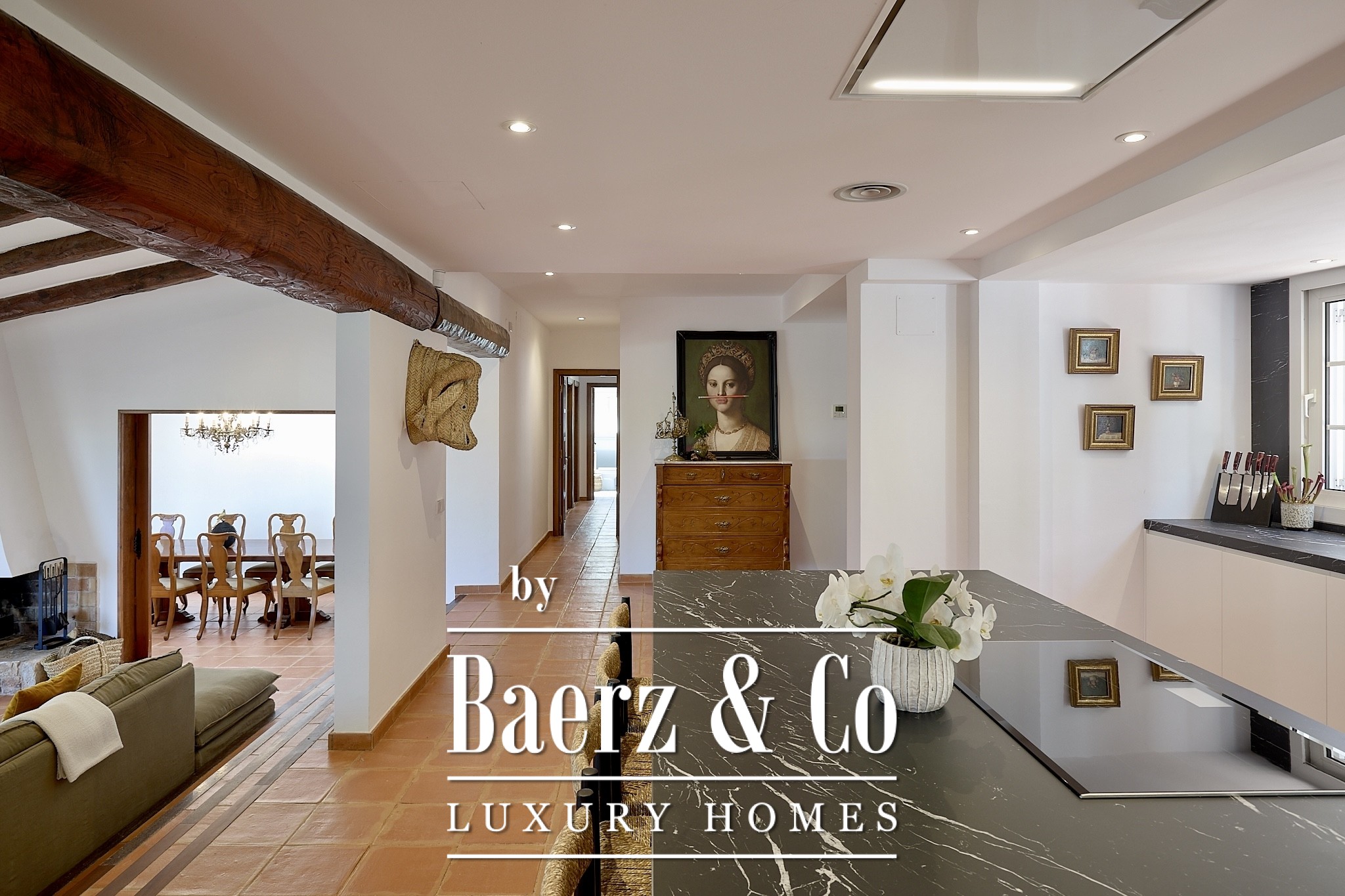 A separate loft-style guest house provides guests with complete autonomy, including its own kitchen and bathroom. Outside, a new swimming pool, solarium, landscaped gardens, and a covered dining and barbecue area evoke authentic Mediterranean retreat. A large private garage accentuates practical luxury.