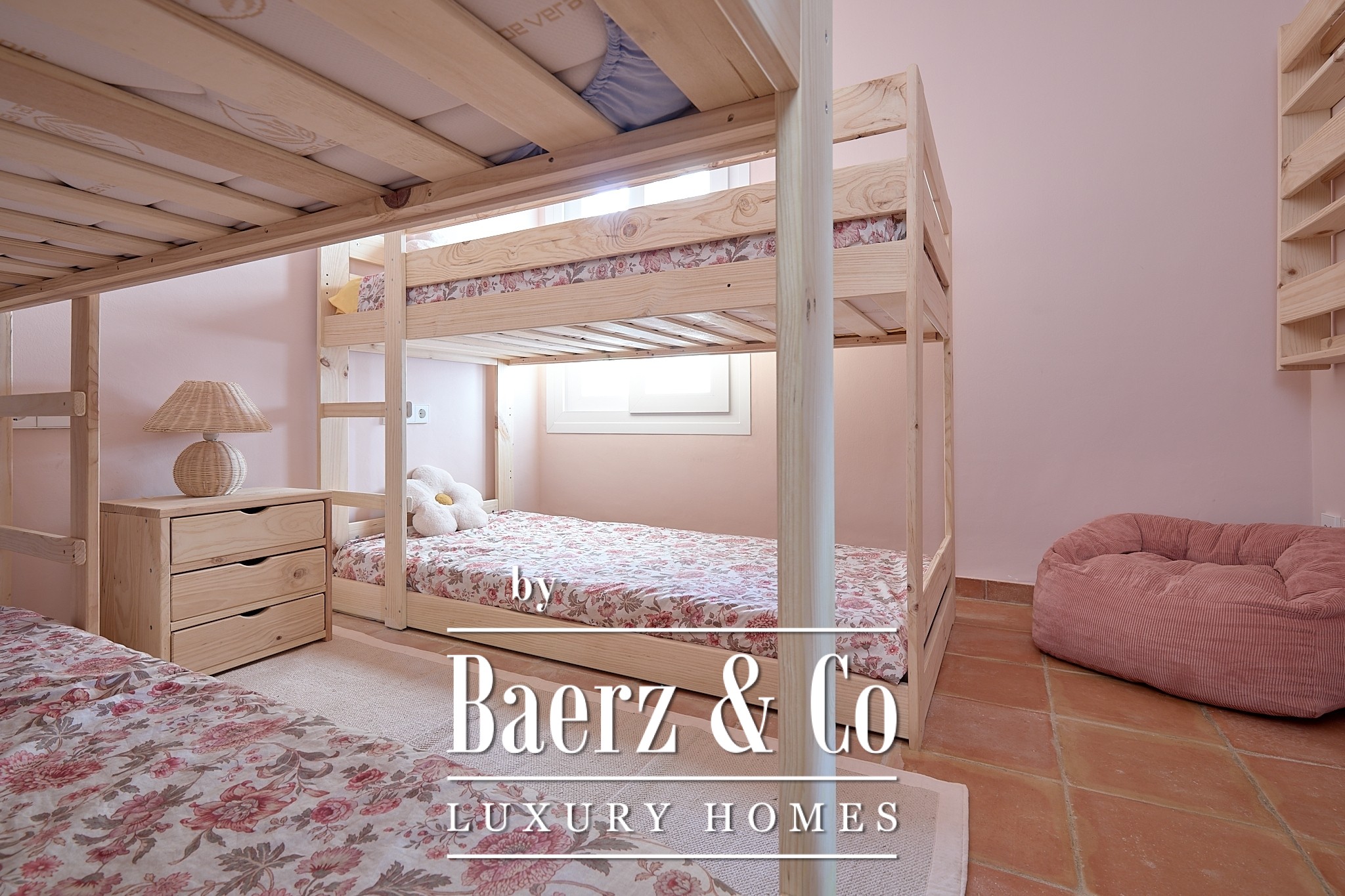 Oriented for expansive sea and mountain views, the residence embodies the spirit of Costa Brava—natural beauty seamlessly joined with understated elegance. The main house features spacious, light-infused living and dining areas, united by a fireplace, flowing directly outdoors for an effortless indoor and outdoor lifestyle. The fully equipped kitchen acts as the gathering point for daily life and entertaining. Private quarters include a principal suite with dressing room and en-suite, four additional bedrooms, and two more bathrooms. Additional spaces, such as a laundry room suitable for office use, offer adaptability.