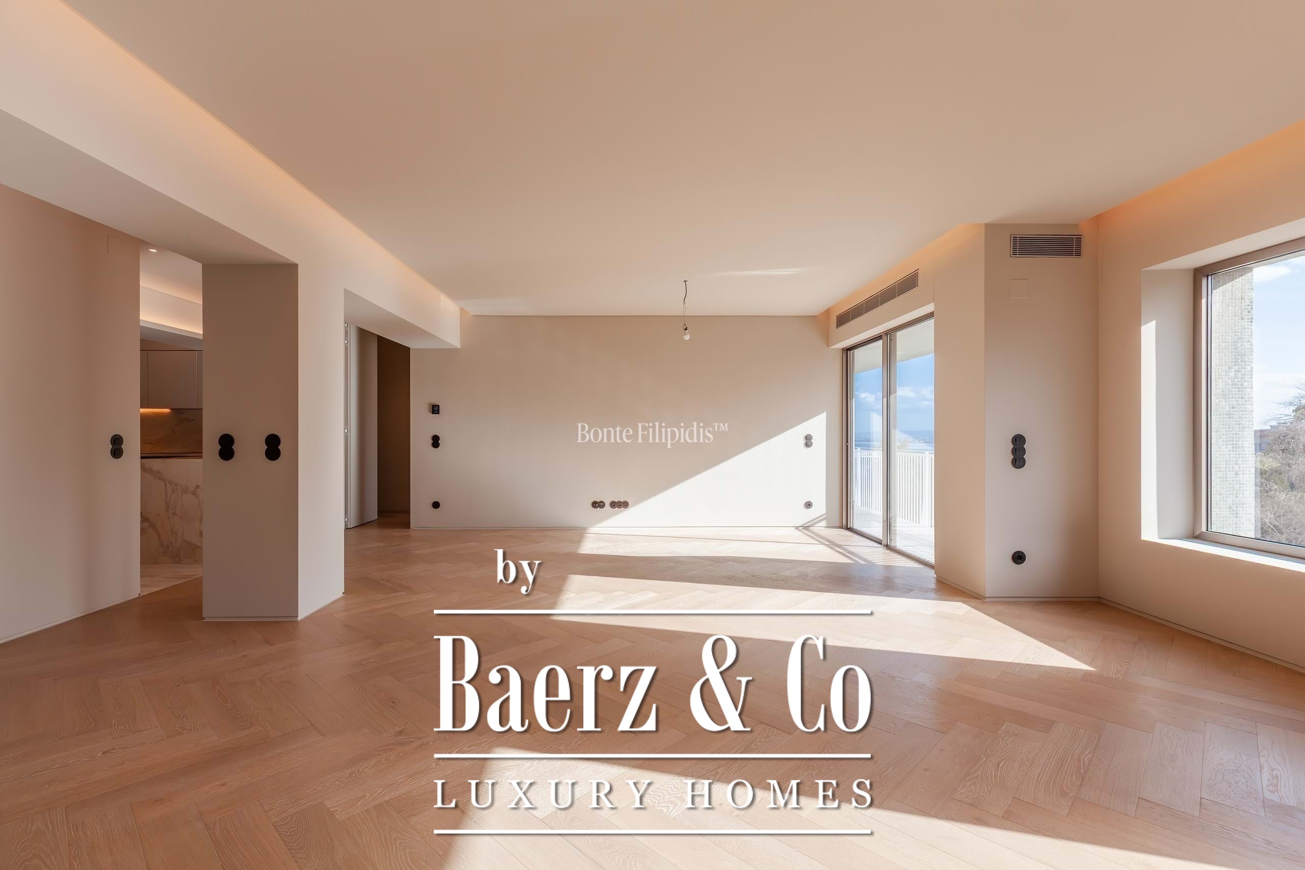 A grand entrance hall introduces a generous 48 m² living room, capturing abundant natural light and river views from an inviting balcony. The space flows seamlessly to a modern kitchen of 15.4 m², fitted with Smeg appliances, perfect for both daily living and quiet gatherings. Underfloor heating and air conditioning bring year-round comfort, complemented by double glazing throughout.