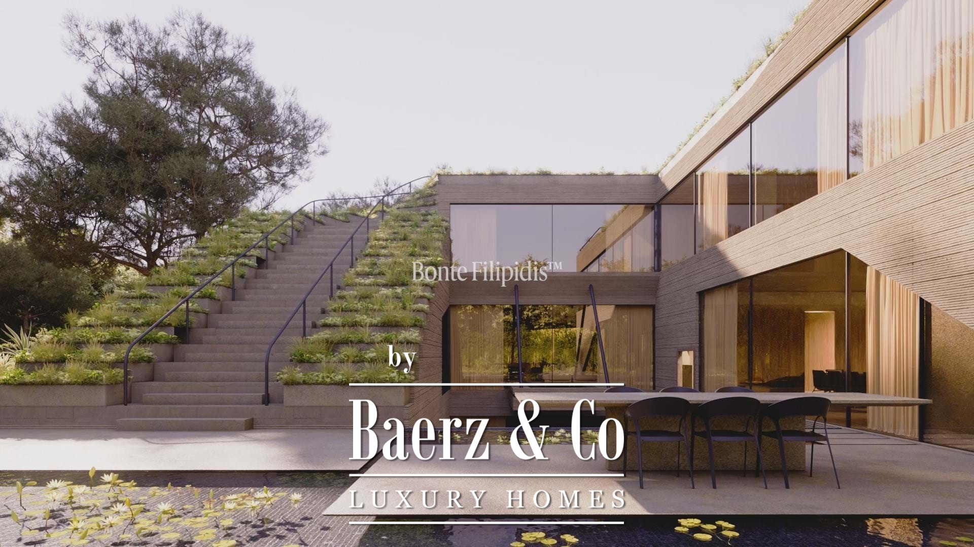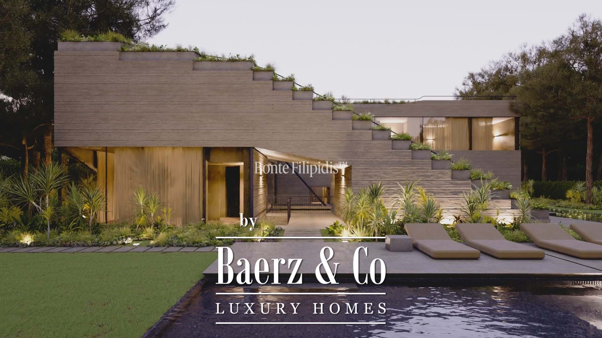 Multiple terraces frame a private black-tiled pool, outdoor lounges, and al fresco dining settings. Photovoltaic panels, recyclable steel, and certified wood signal a commitment to sustainable living, while home automation ensures comfort and peace of mind.