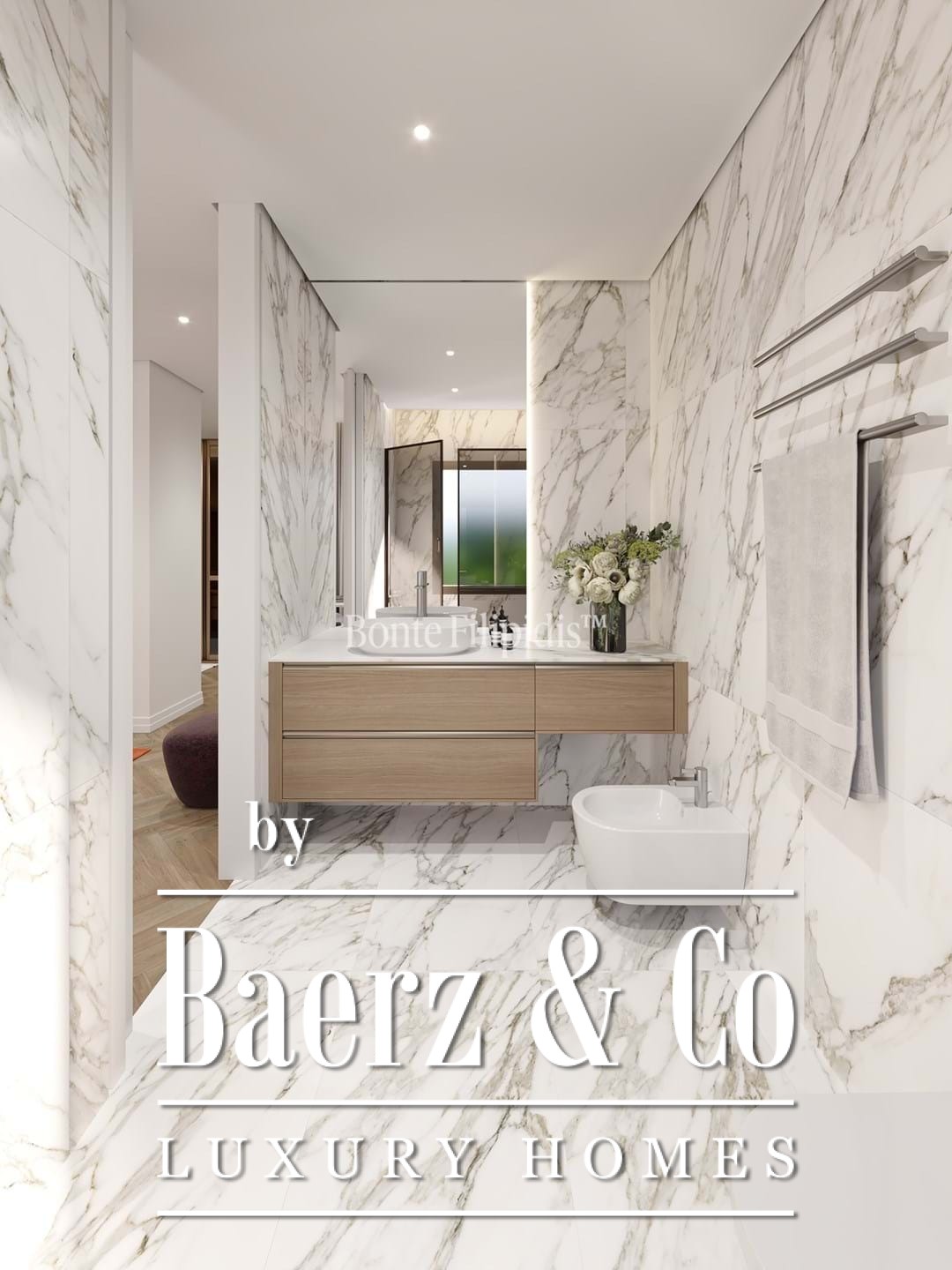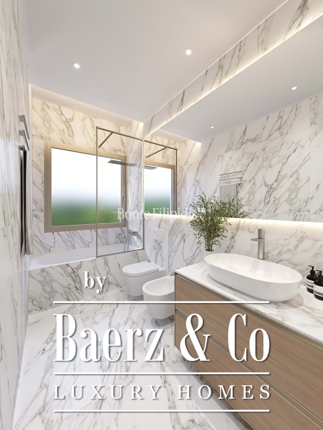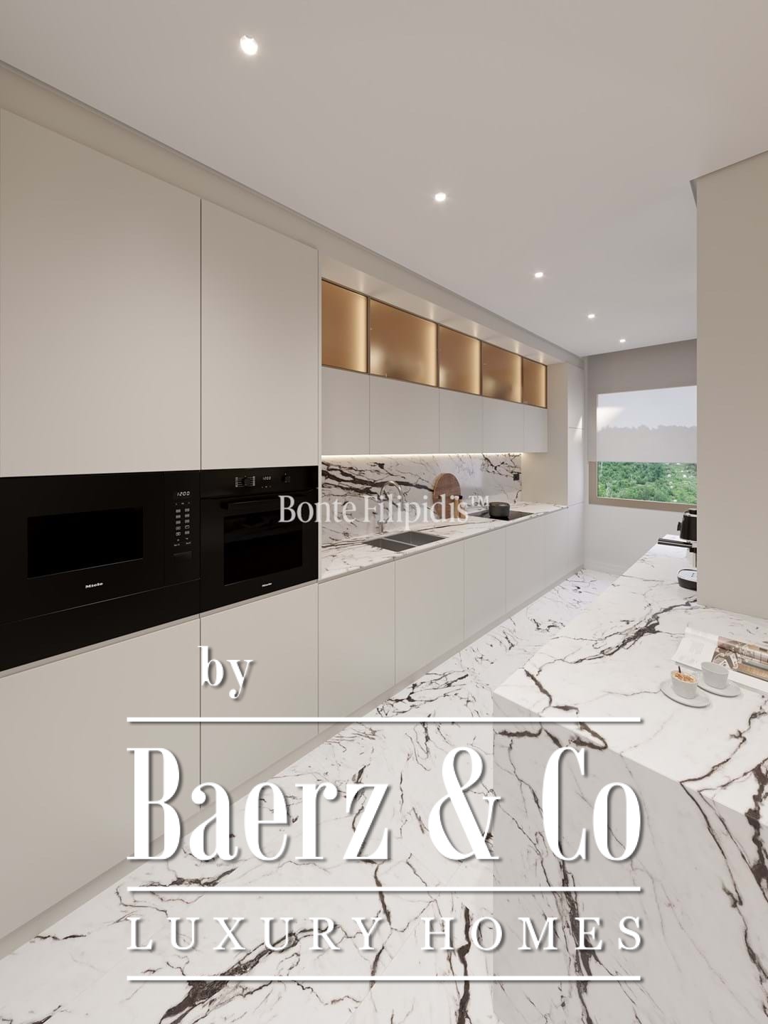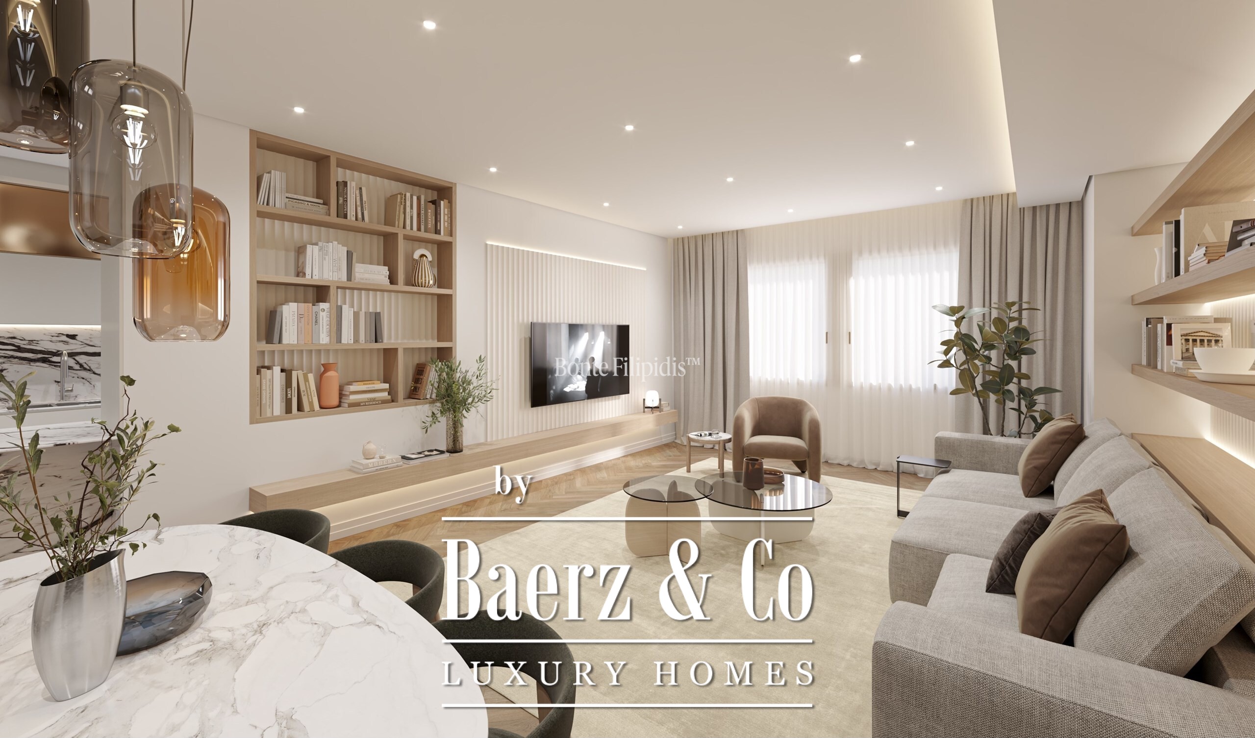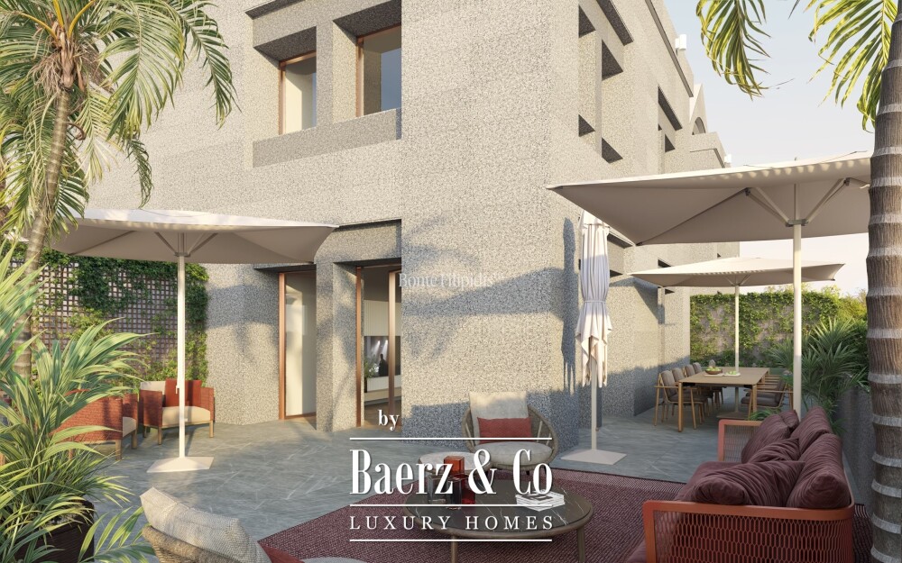 The kitchen features bespoke cabinetry, integrated appliances and marble finishes, merging functionality with restrained elegance. In the private wing, three bedrooms offer ample comfort, including a suite with a walk-in closet. Every bathroom is crafted with contemporary fittings and marble, underscoring the commitment to quality materials throughout.
