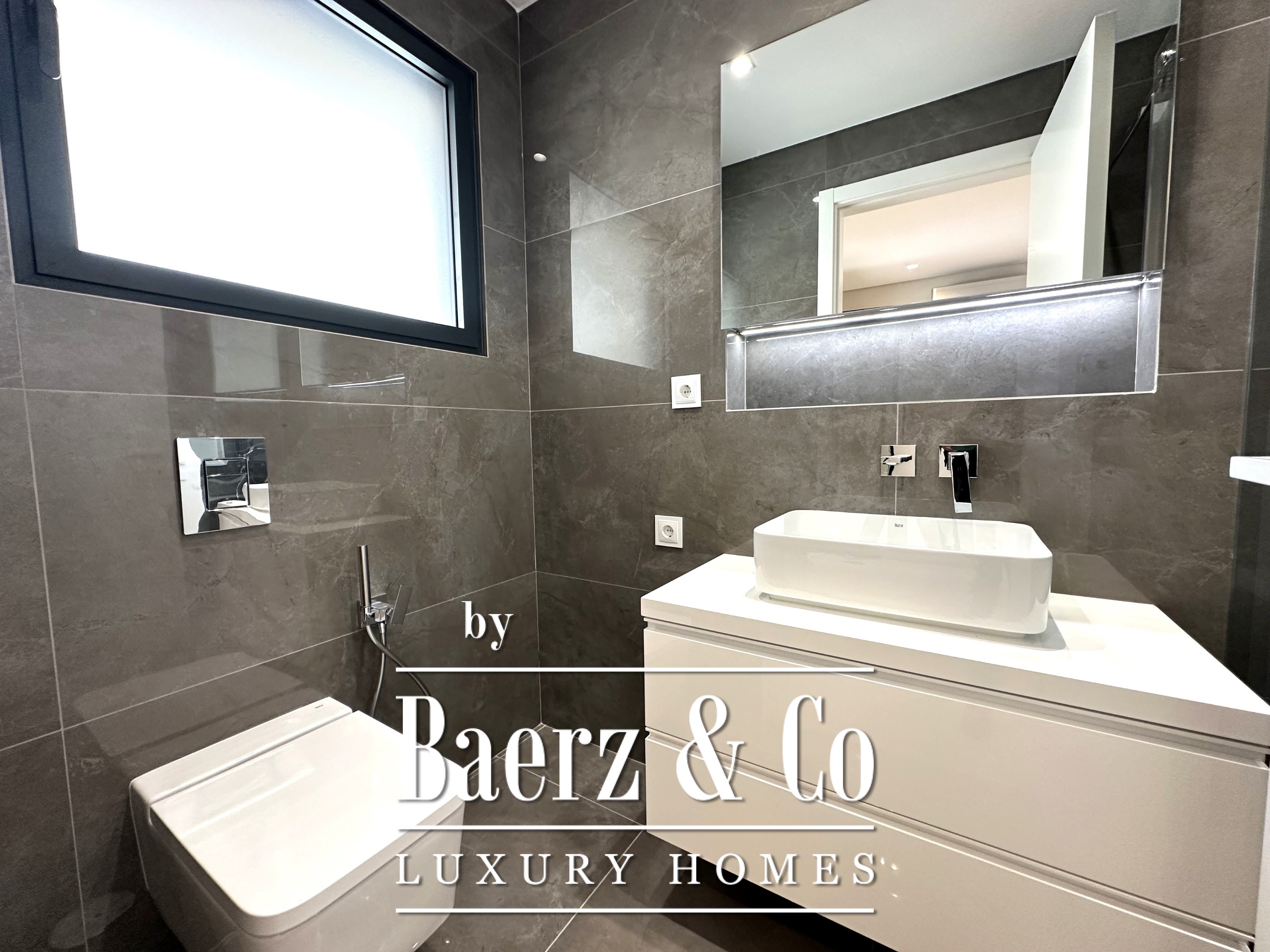 The architectural flow leads to an impressive 106 m² rooftop terrace, inviting quiet outdoor leisure, complemented by a technical area of 27 m². A private pool, set against 124 m² of terrace, is surrounded by lush gardens and fruit trees, designed for serene living. State-of-the-art smart home and garden solutions provide seamless control and efficiency, underscoring the villa’s forward-thinking spirit. Features such as a 72 m² private garage, 8 m² laundry, and air conditioning heighten daily comfort, while an energy class A rating reflects a commitment to sustainability.