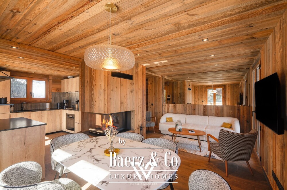 Chalet Combloux facing Mont Blanc is an exceptional residence reimagined with meticulous attention to detail and environmental responsibility. Renovated throughout using high-quality eco-friendly materials, the 147 m² chalet blends refined features with a palpable warmth, set on a plot of 785 m² in this renowned alpine setting.