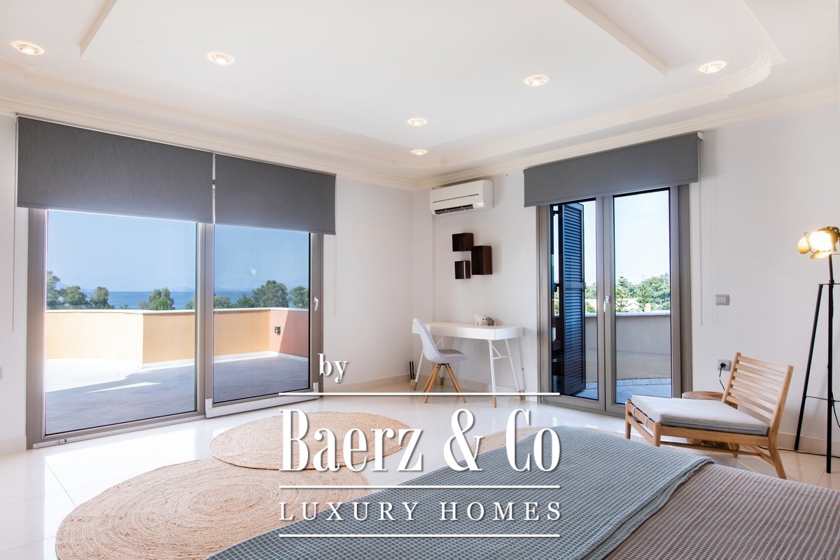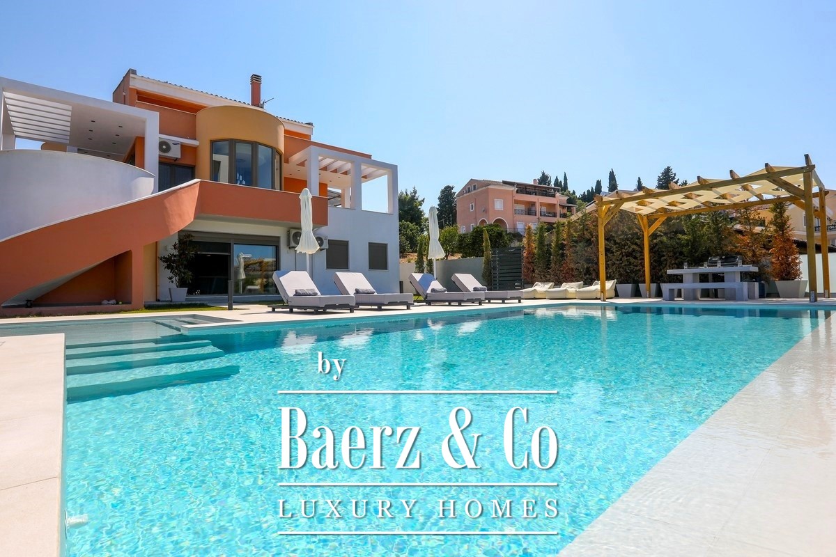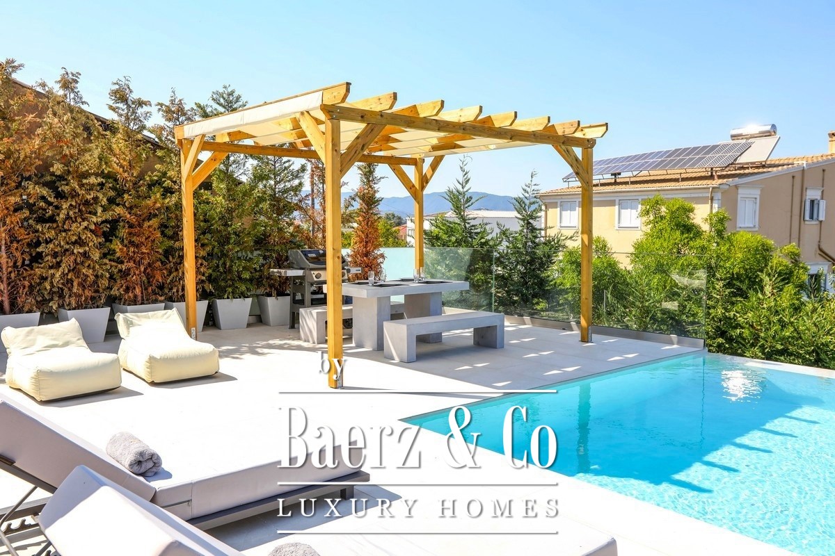 Attention to technical detail is clear: heat-pump heating and cooling, solar water system, energy fireplace, advanced security, and double glazing for insulation. The private pool is set within sculpted gardens and relaxation zones, accompanied by a covered pergola, outdoor dining, and fitted barbecue. Secure parking lies within the grounds. This villa Corfu represents the intersection of privacy, design, and timeless investment in one of Greece’s most globally recognized locations.