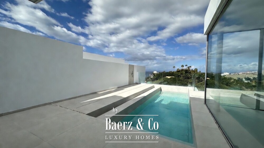 A private swimming pool of 7.5 x 3 metres, outdoor shower, and generous terrace provide an immersive indoor-outdoor experience. On the lower floor, a multi purpose room, two additional bedrooms, two full bathrooms, and a dedicated laundry room offer versatility and comfort. Green areas with exotic plants and palm trees envelope the villa, supporting a tranquil, refined atmosphere.