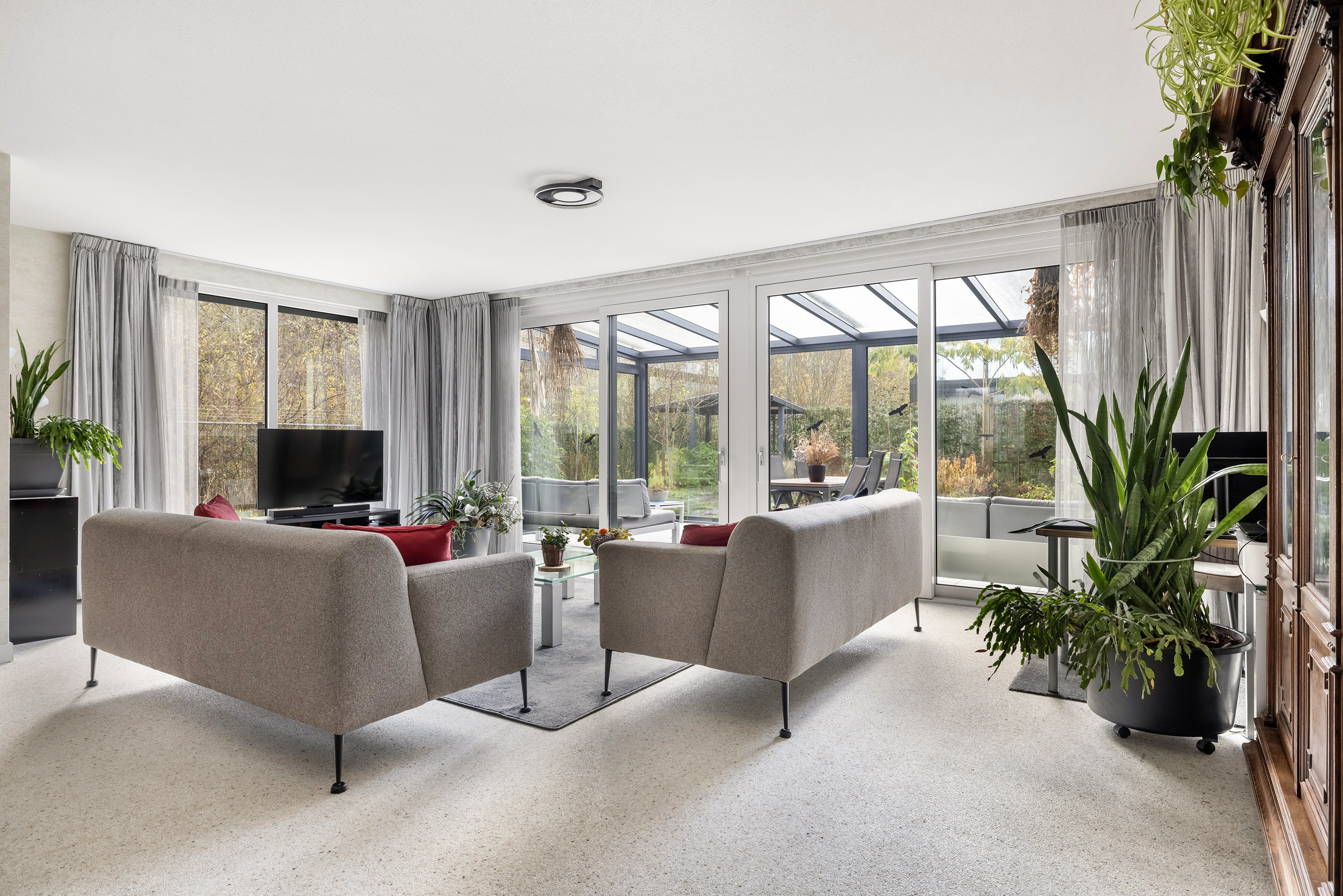 A wonderfully spacious and light-filled living room thanks to the large windows, with green views. The rear of the living room opens to a large conservatory via two sliding doors. The garage is also accessible from the living room. The space features a Carrara Italian marble-gravel floor and wallpapered walls.