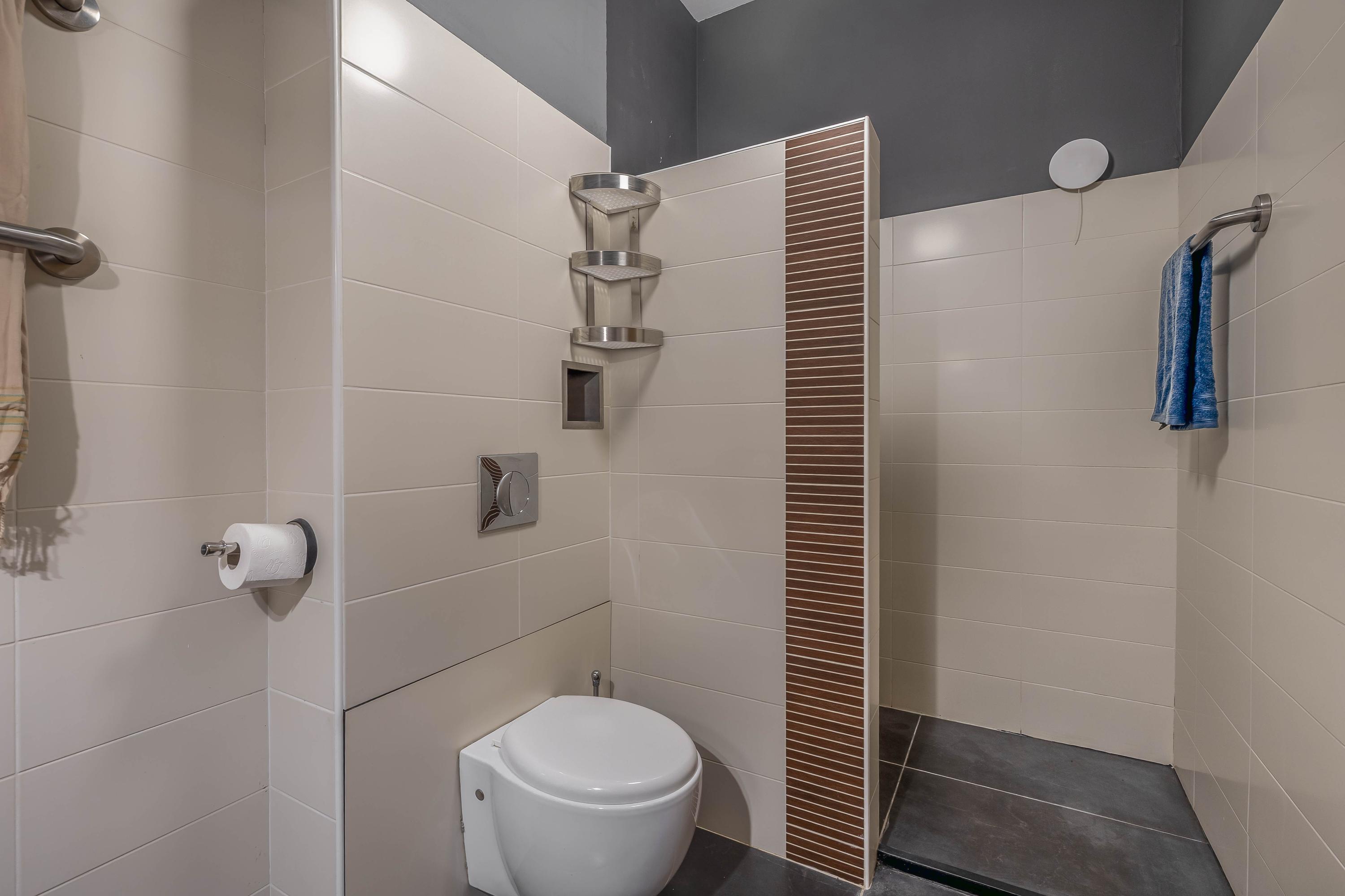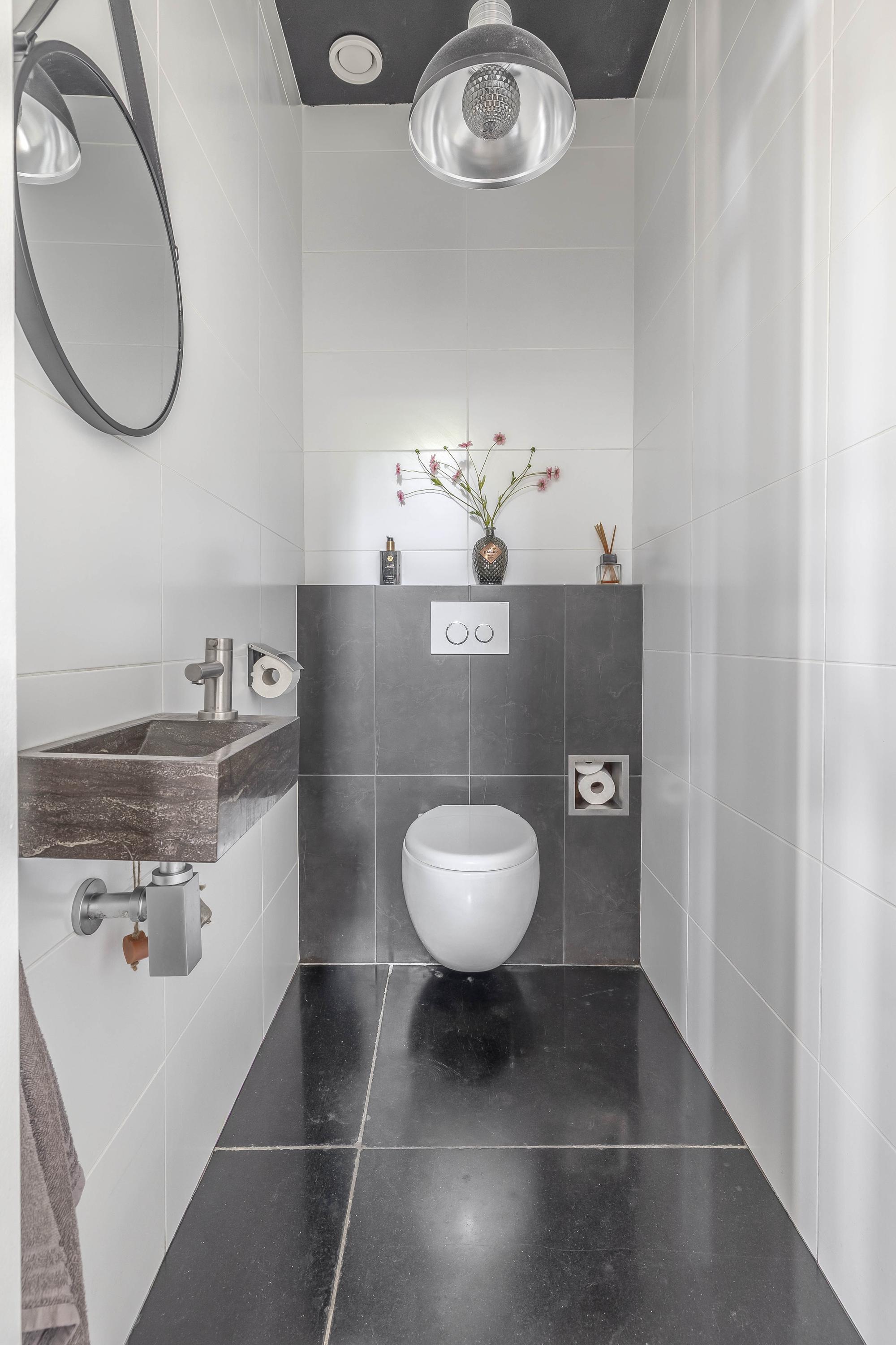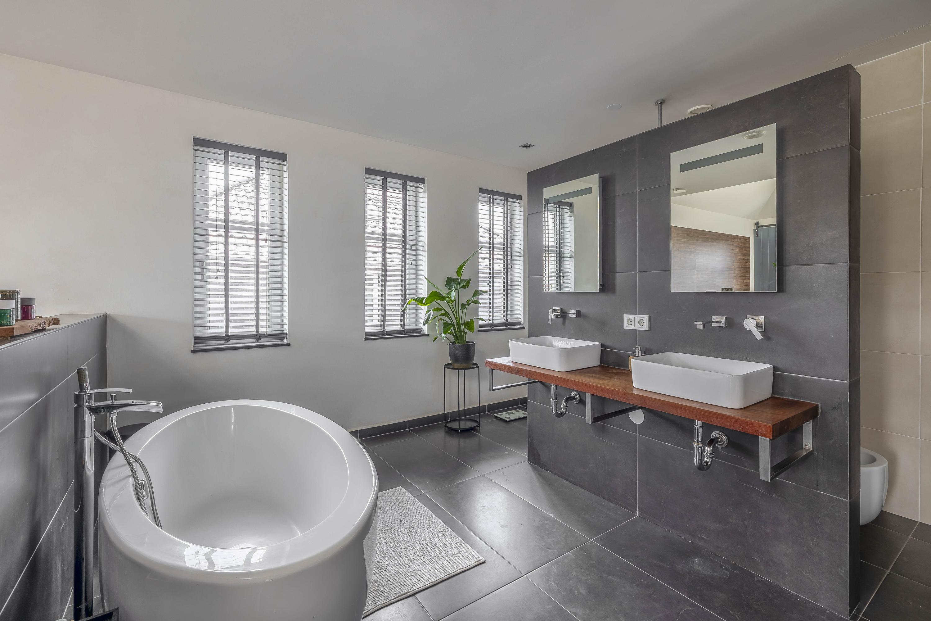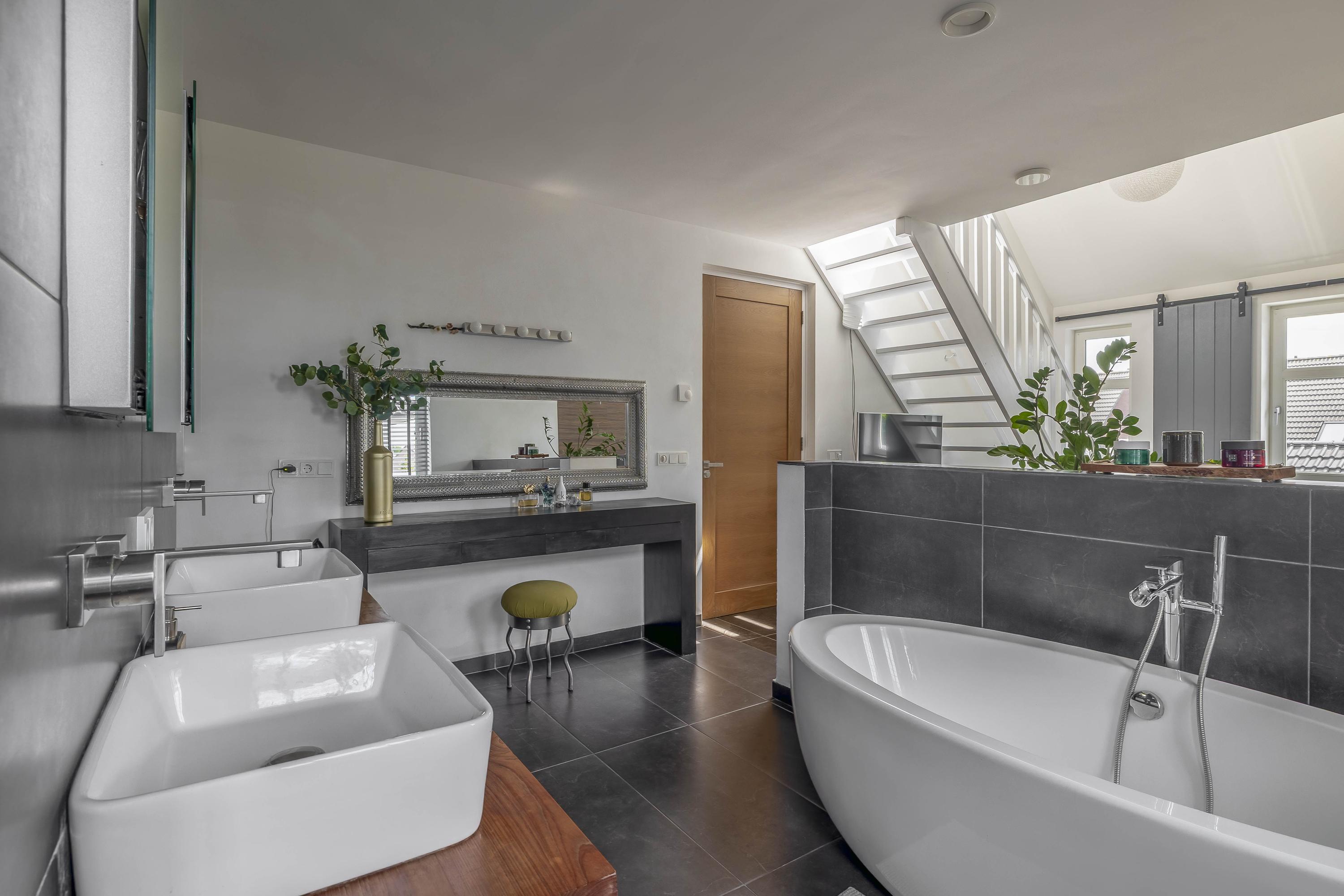 The interiors unfold across three levels of understated quality, from the kitchen’s elevated position overlooking the street, to a living room that soars to 3.5 meters, seamlessly connected to the private south-facing garden. Five bedrooms and four bathrooms, including en-suite master quarters and two additional luxurious baths, accommodate both retreat and gathering. Material choices—stone floors, stucco finishes, plastic window frames with HR++ glass—balance resilience with calm tactility, while underfloor heating and cooling in most rooms ensure effortless comfort.