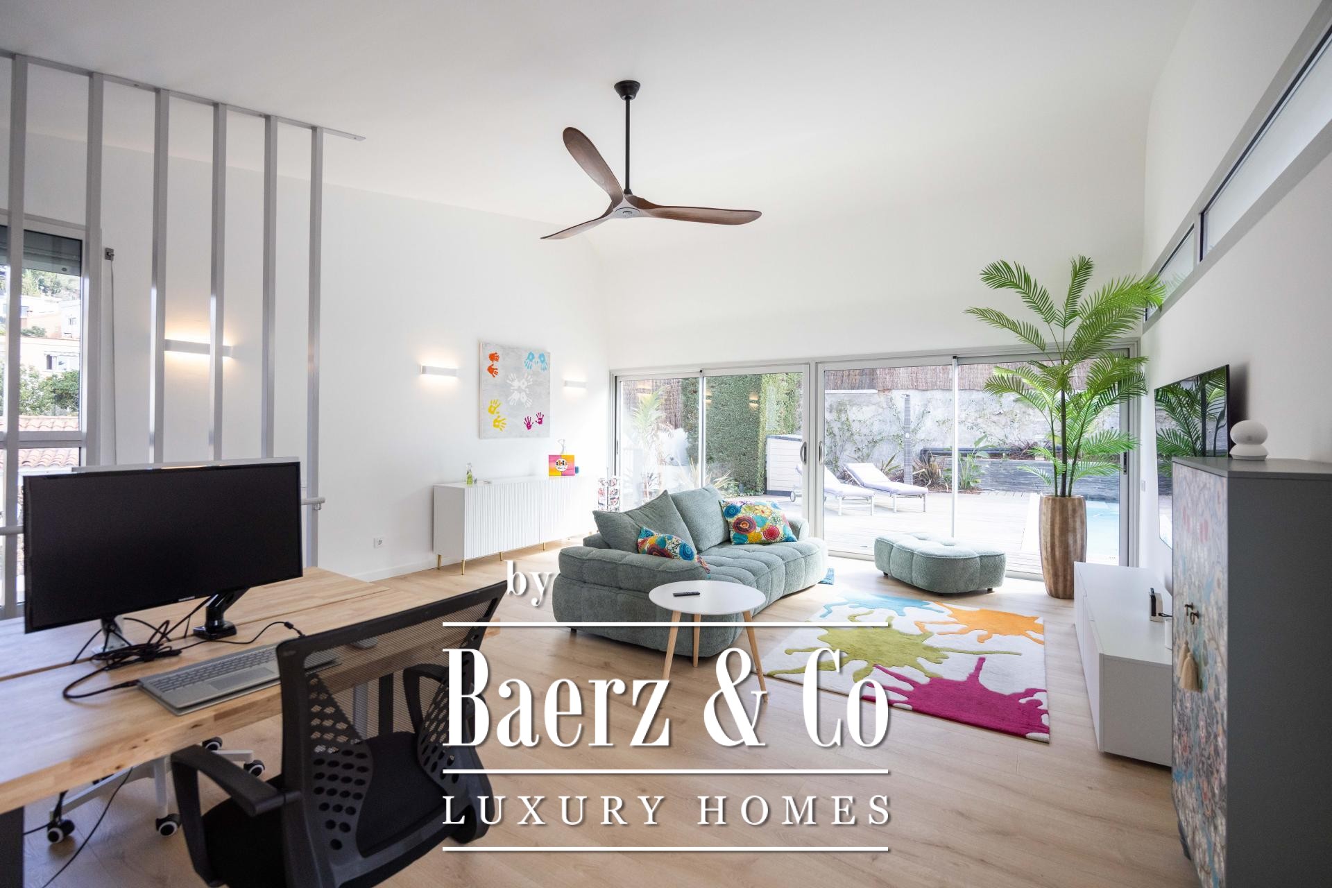 Four landscaped terraces, shaded by palm and banana trees, define an outdoor sanctuary. The 7 x 5 m swimming pool, bordered by a sunlit wooden deck, provides privacy and relaxation, while a pergola and summer kitchen nurture Mediterranean conviviality. Six bedrooms include a master suite with walk-in wardrobe, private wooden terrace, and a spa-inspired bathroom that opens to tranquil views, echoing the calm of a secluded retreat. Two additional double bedrooms share a refined bathroom, while top-floor offices offer inspiring spaces with city outlooks.
