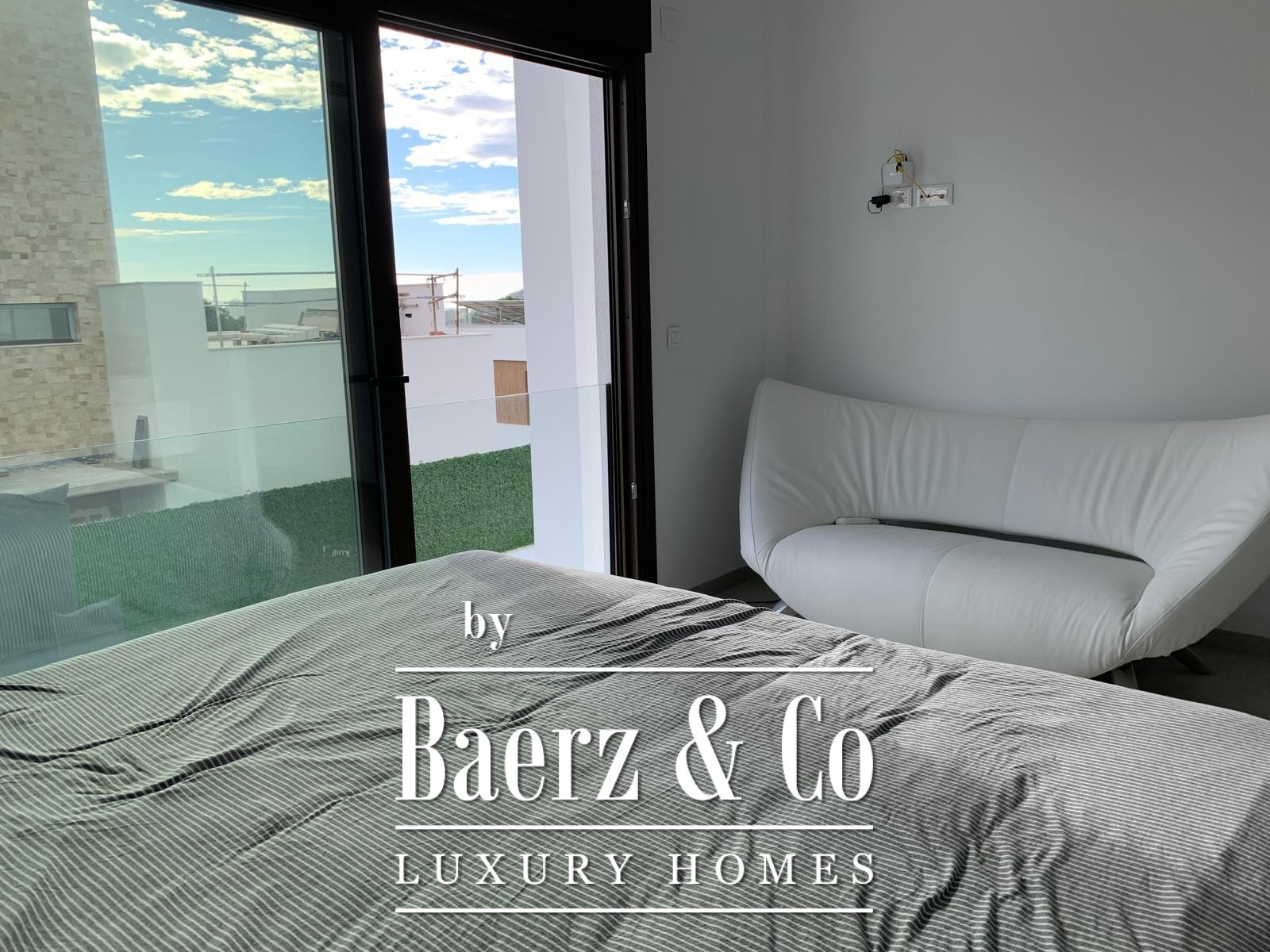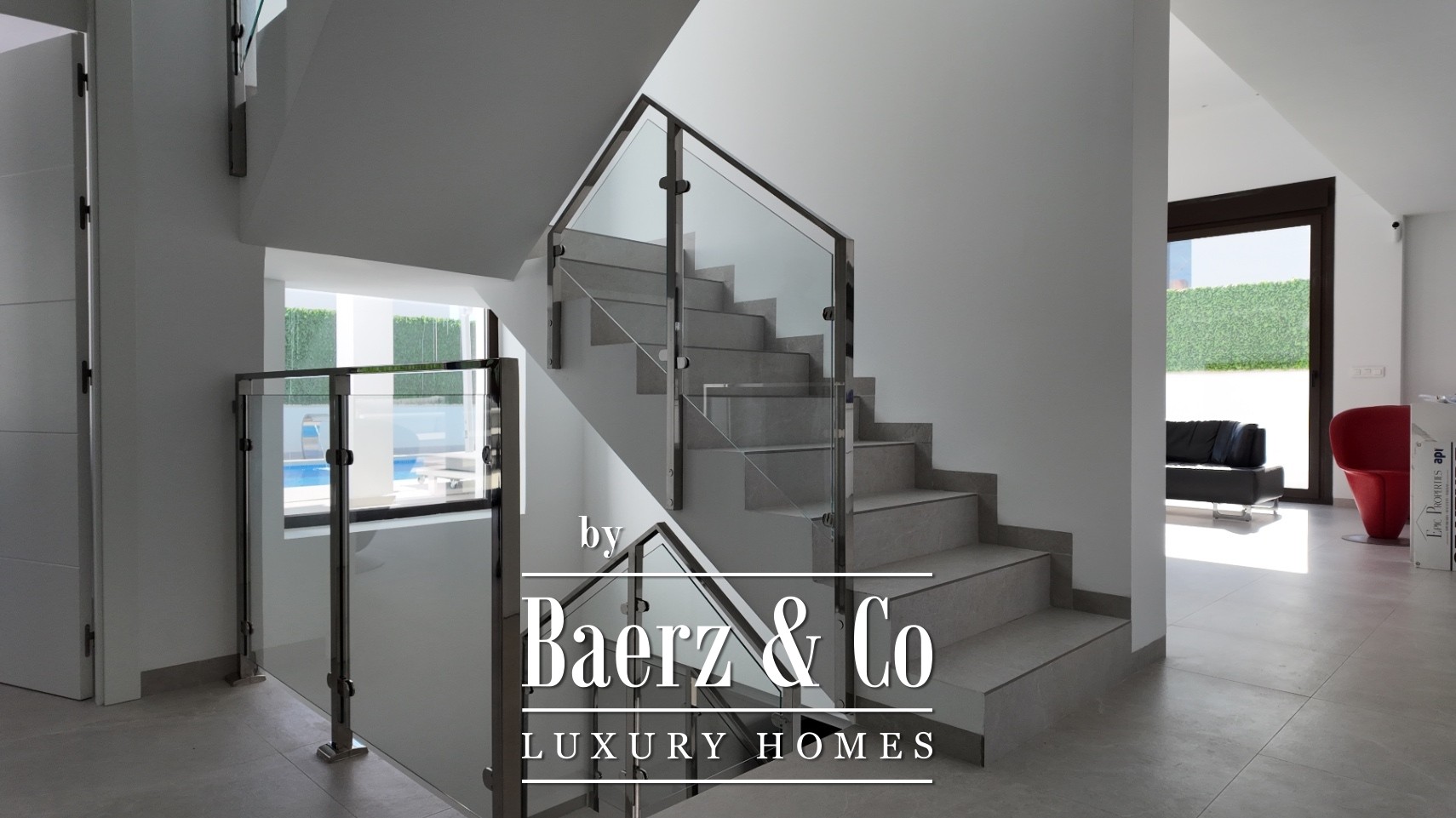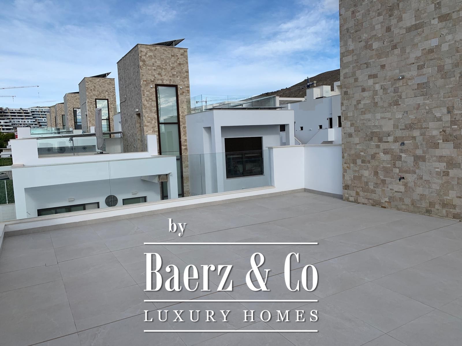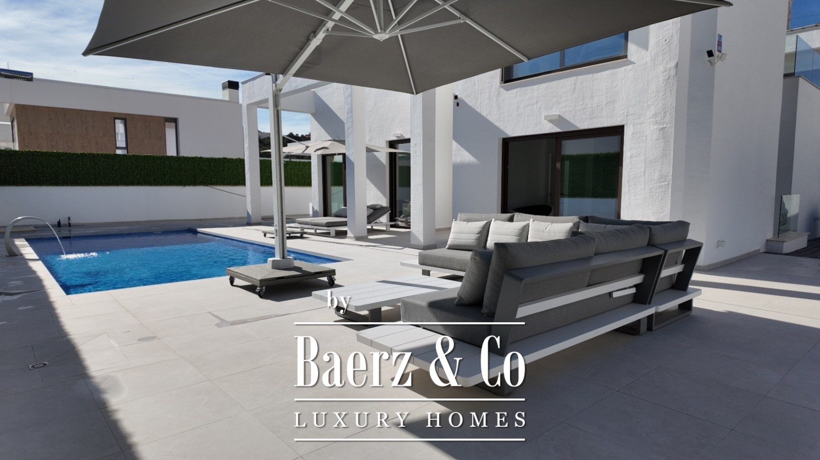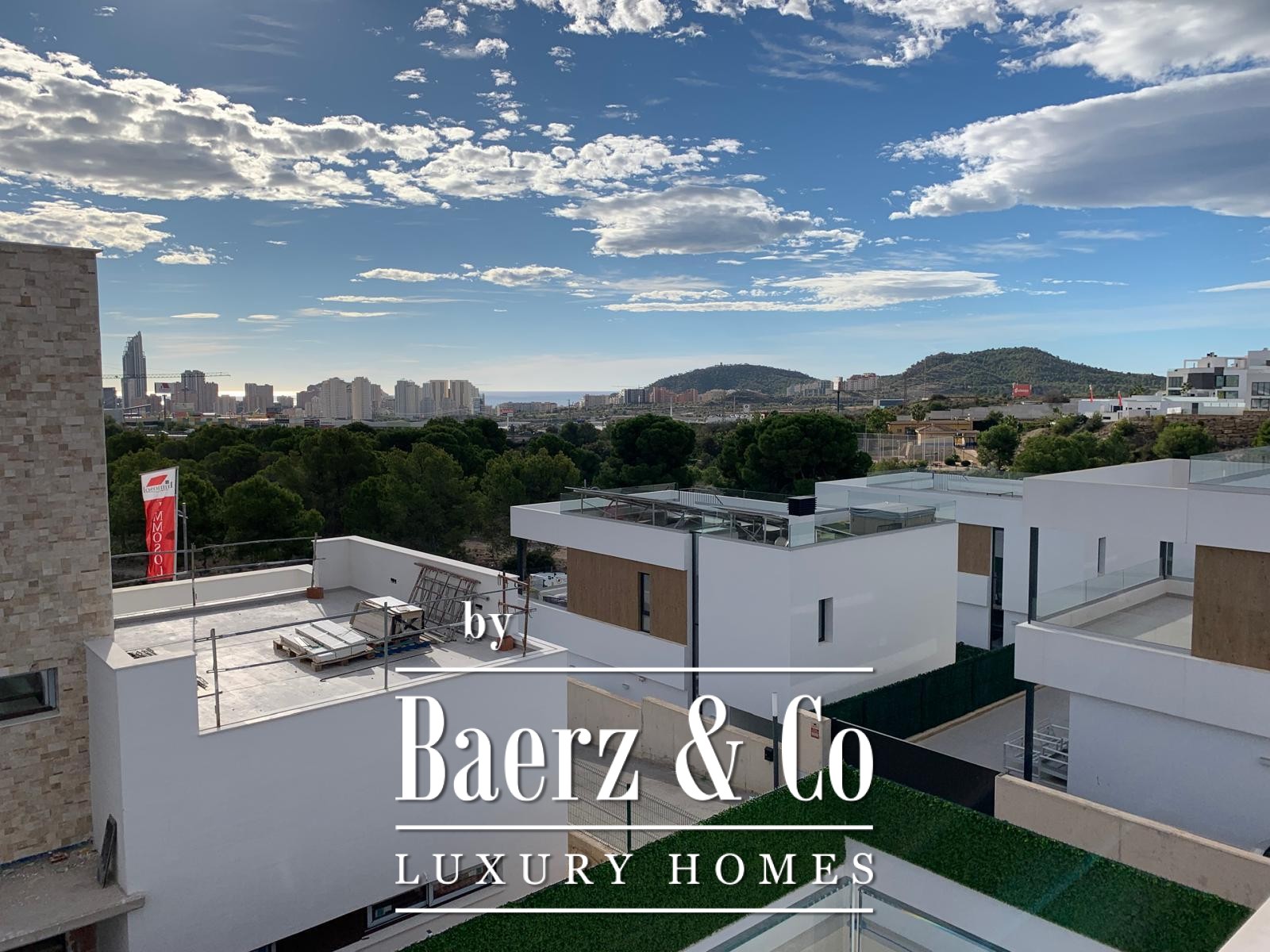 Descending to the semi-basement, a spacious lounge encourages use as a cinema room or personal gym, accompanied by laundry facilities, two further bedrooms, and a bathroom with shower. Outside, the landscaped garden envelopes a private pool and terraces for outdoor relaxation while a fenced parking area offers security and convenience. Two solariums, each with independent access, reveal broad sea and cove views, one equipped with an outdoor shower. This Finestrat villa balances clean lines, double glazing, and intelligent security within a calm residential setting.