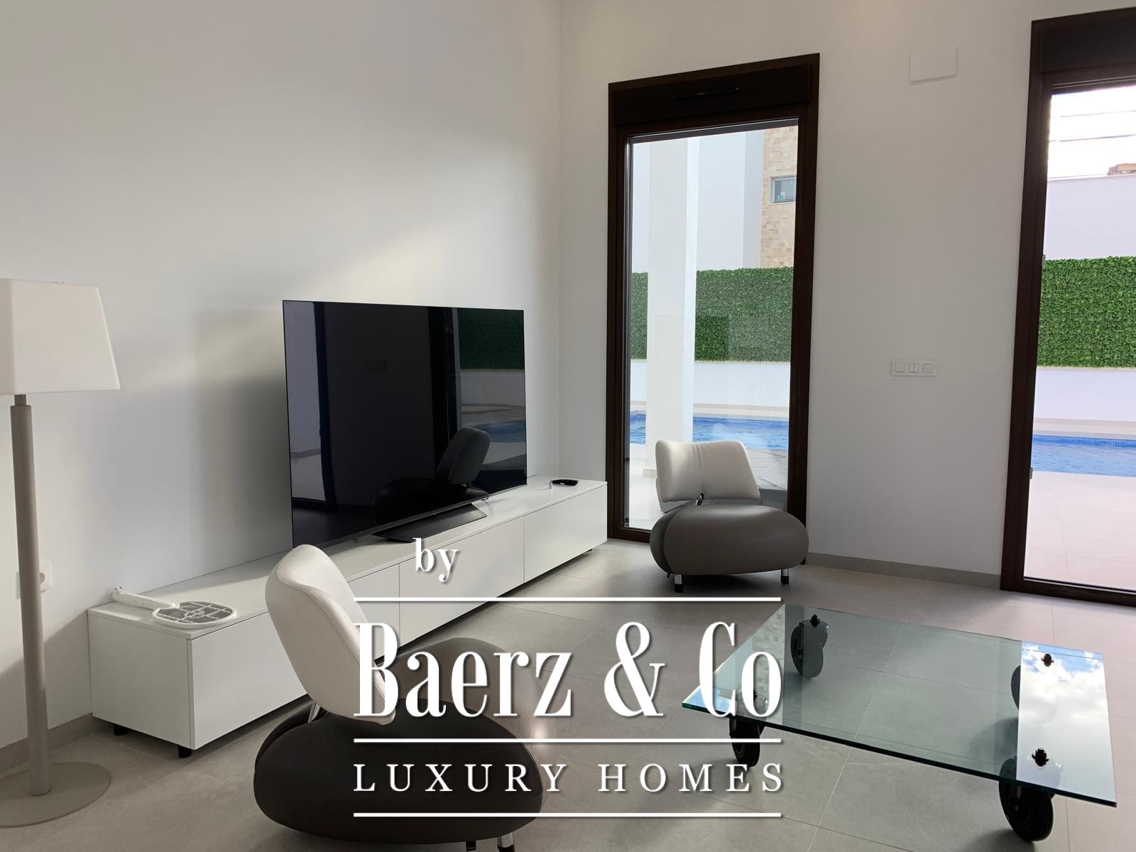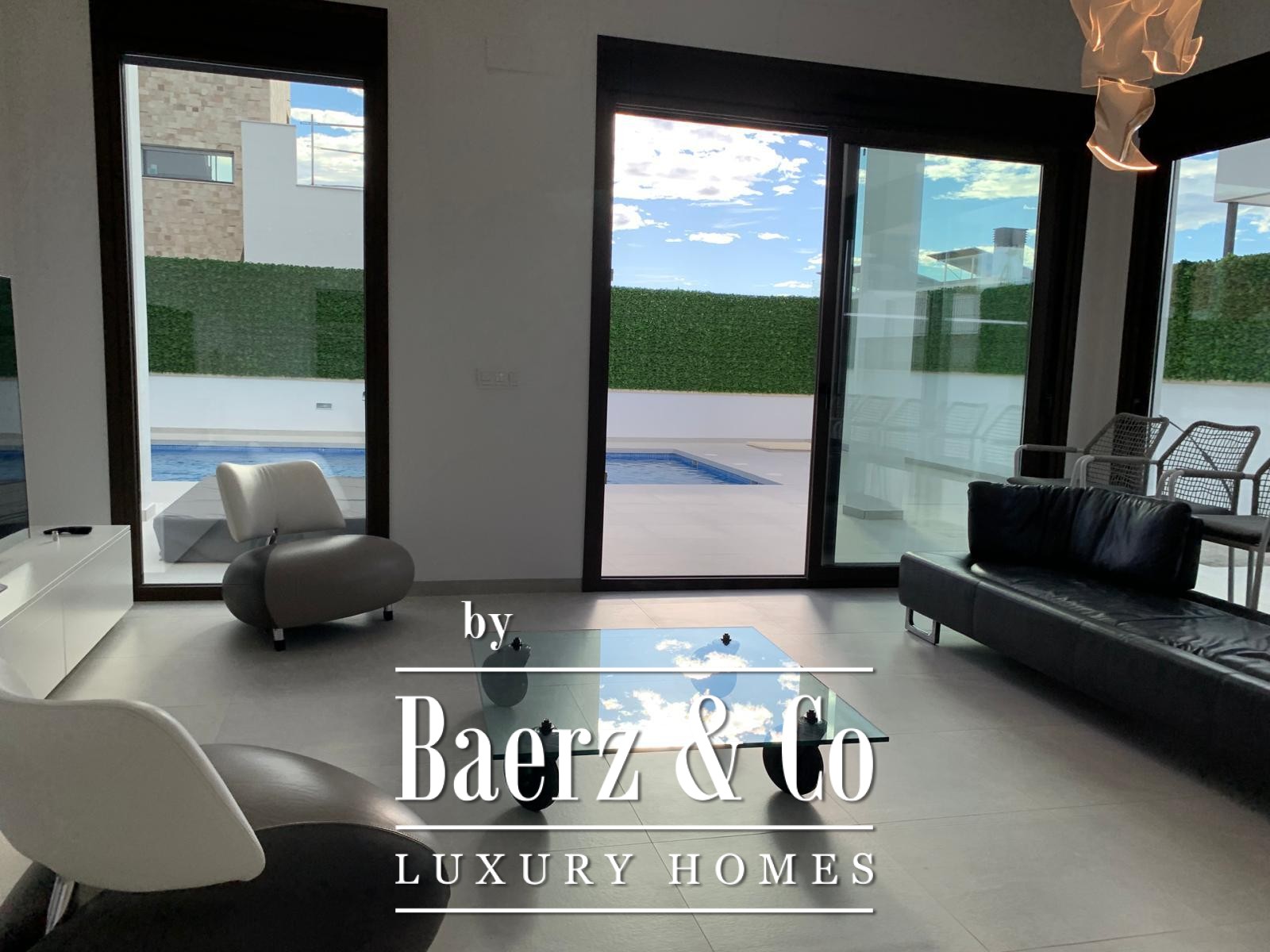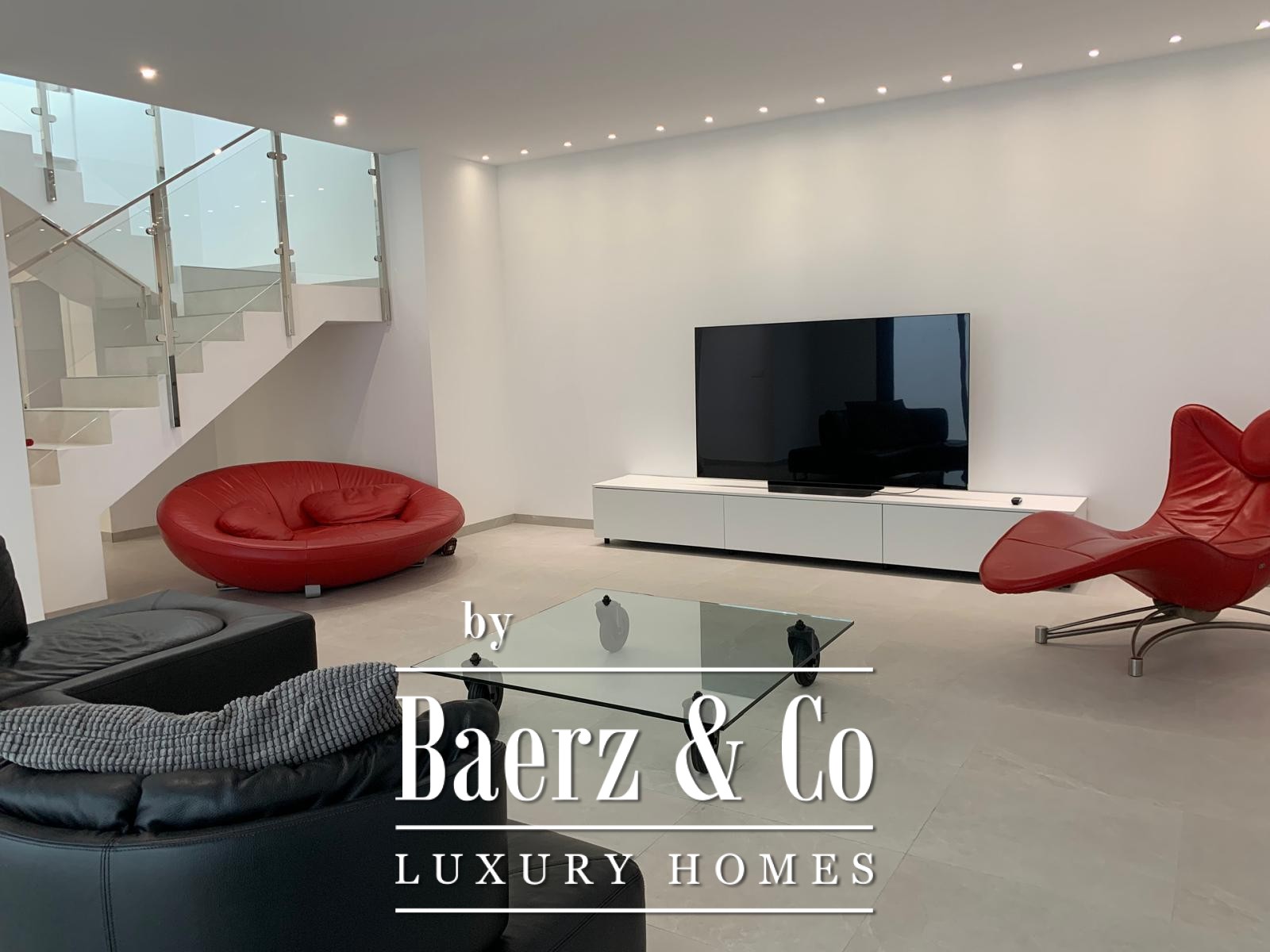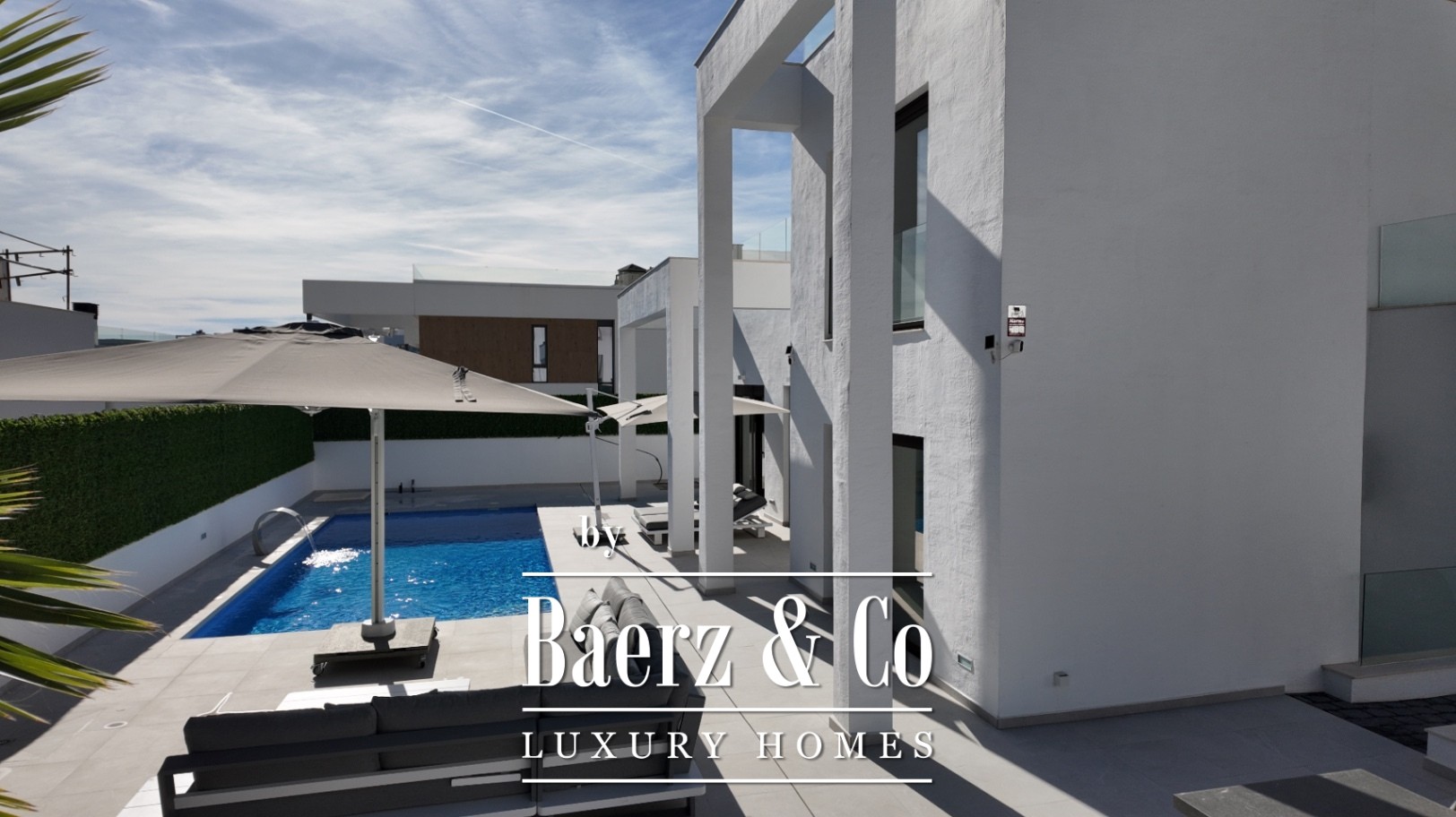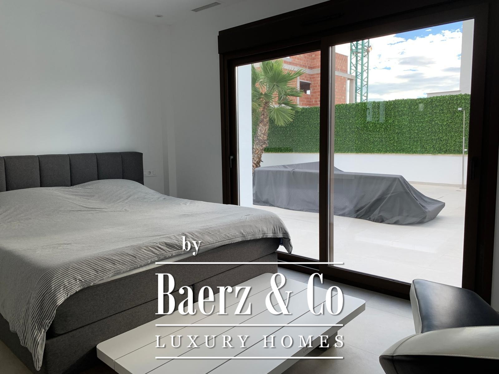 Descending to the semi-basement, a spacious lounge encourages use as a cinema room or personal gym, accompanied by laundry facilities, two further bedrooms, and a bathroom with shower. Outside, the landscaped garden envelopes a private pool and terraces for outdoor relaxation while a fenced parking area offers security and convenience. Two solariums, each with independent access, reveal broad sea and cove views, one equipped with an outdoor shower. This Finestrat villa balances clean lines, double glazing, and intelligent security within a calm residential setting.