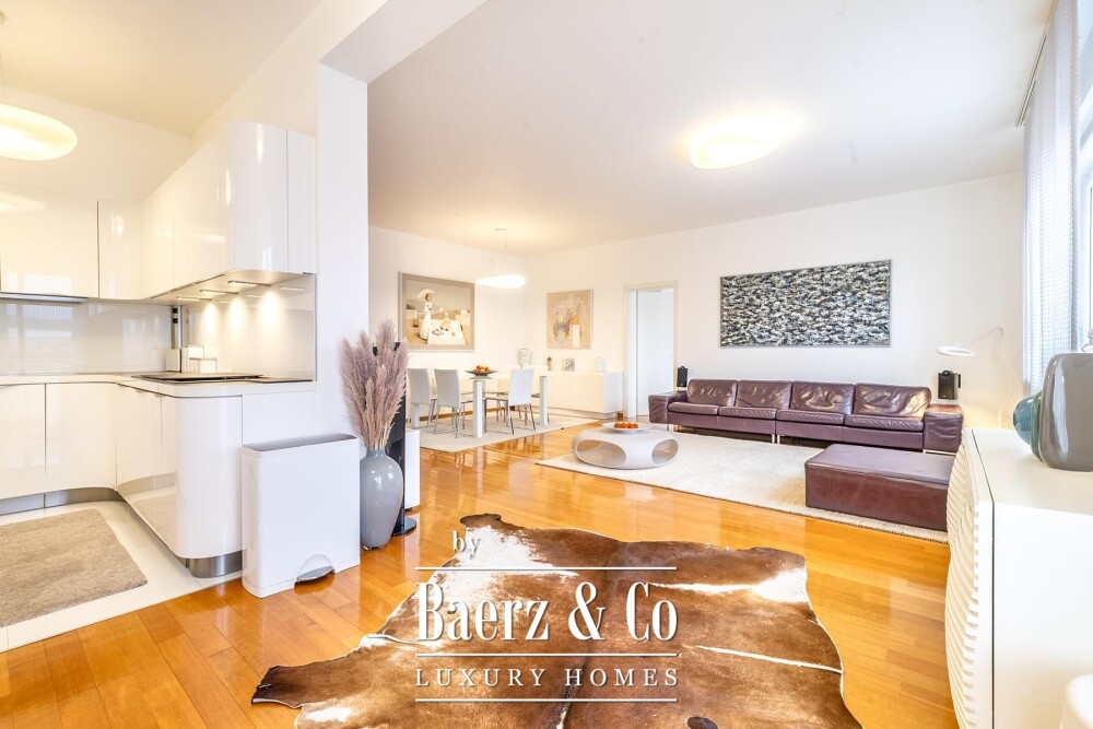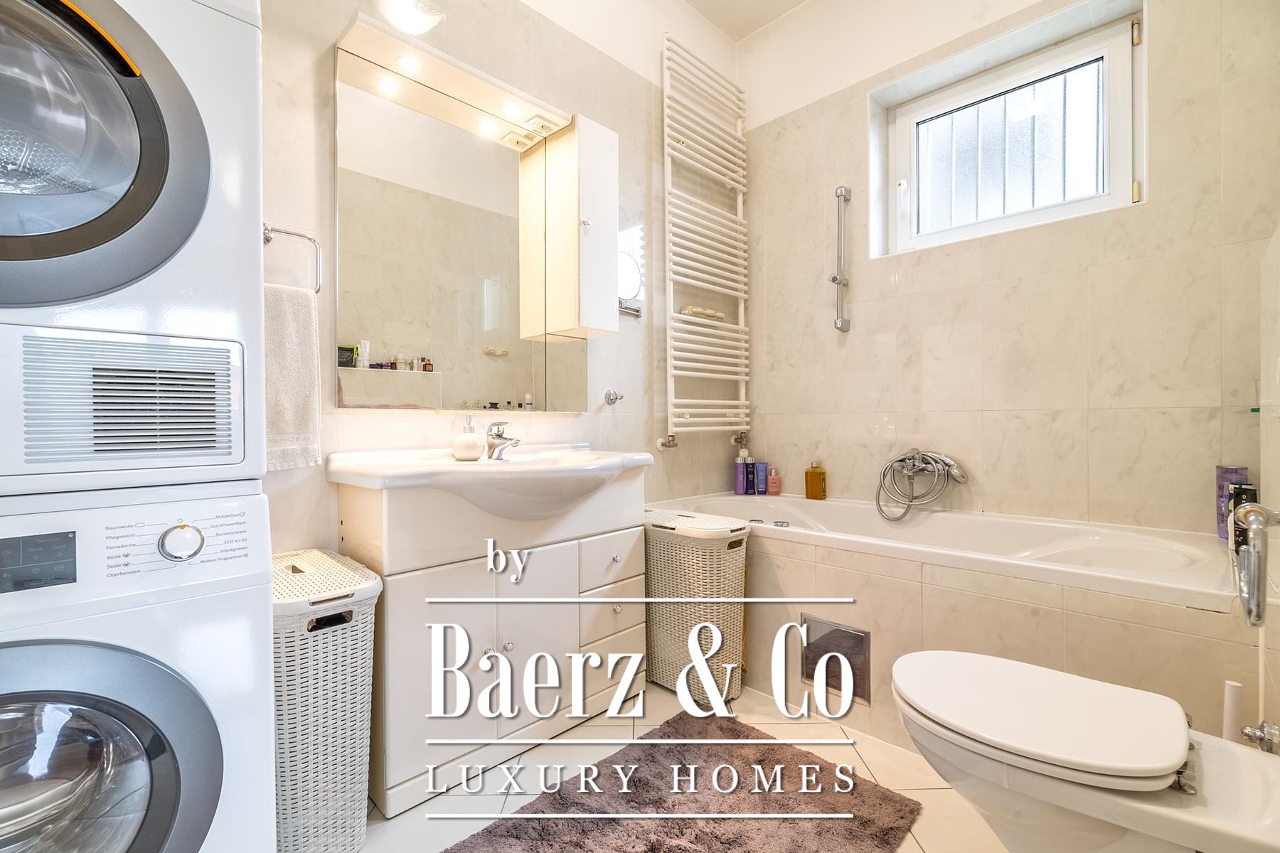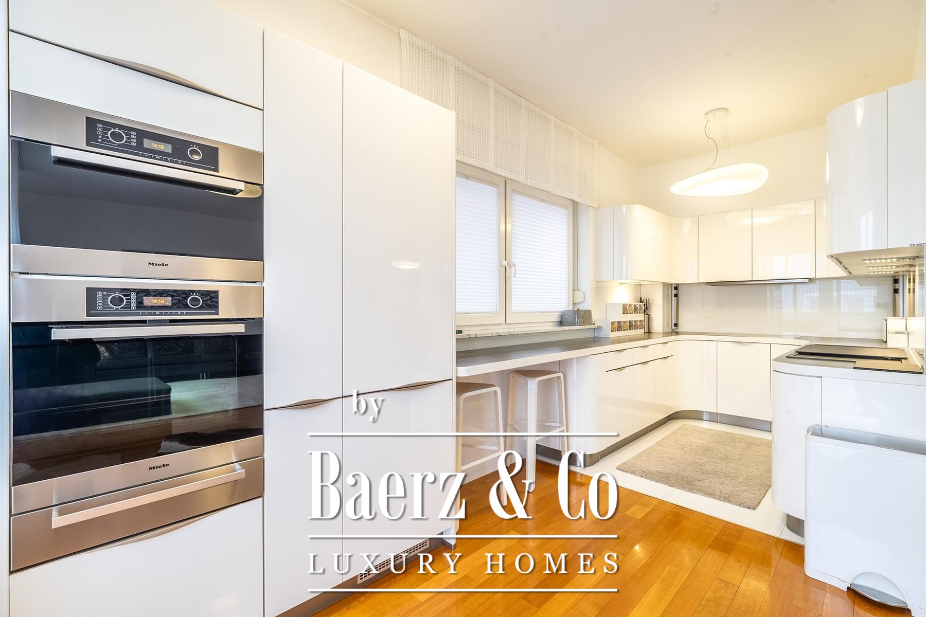 Amenities include gas central heating, air conditioning, elevator access, two garages, an outdoor parking space, and a storage room. The apartment’s north-east orientation enhances morning light while ensuring privacy. Local schools, kindergartens, shops, and public transport are all within easy reach, supporting a family-friendly yet cosmopolitan pace of life.