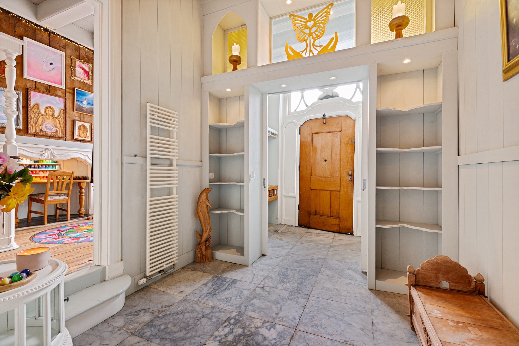 The front room currently used as a gallery shop enjoys a beautiful view of the canal through its corner windows.