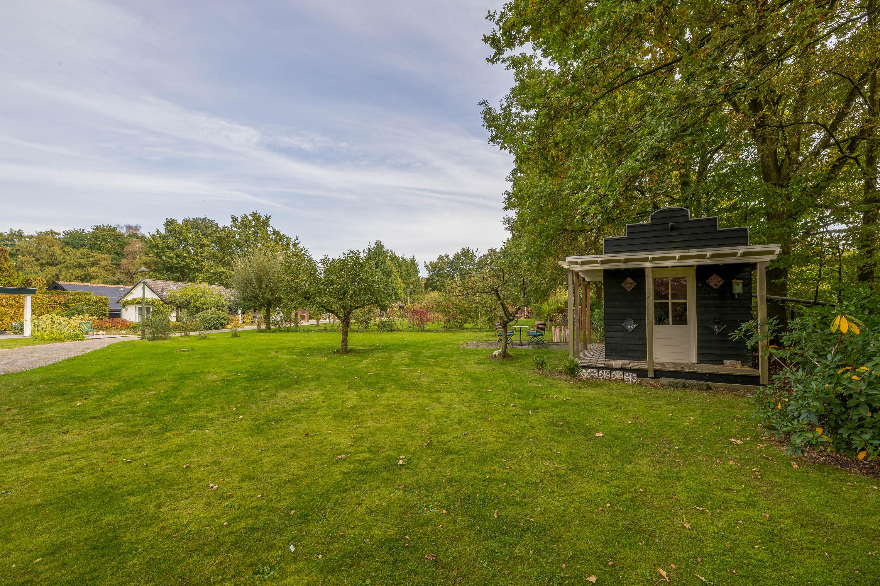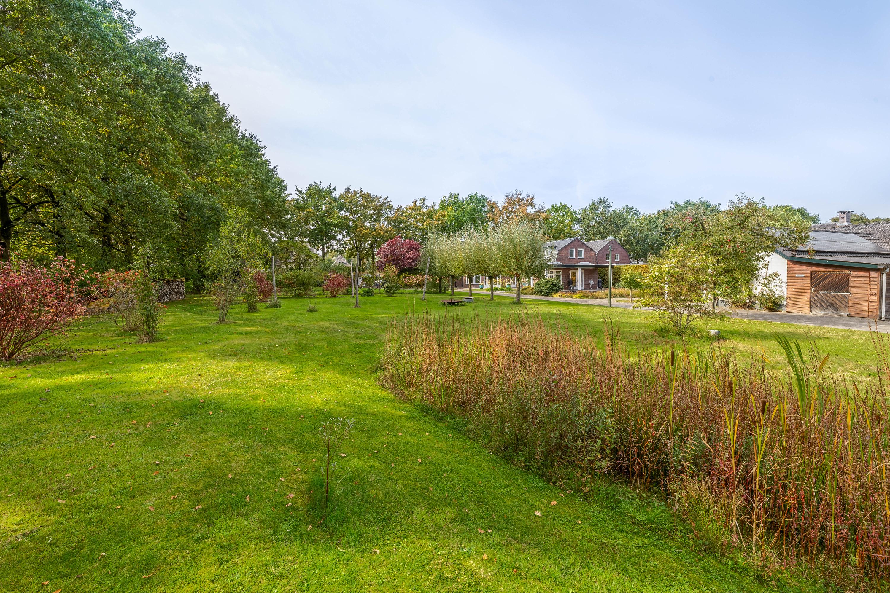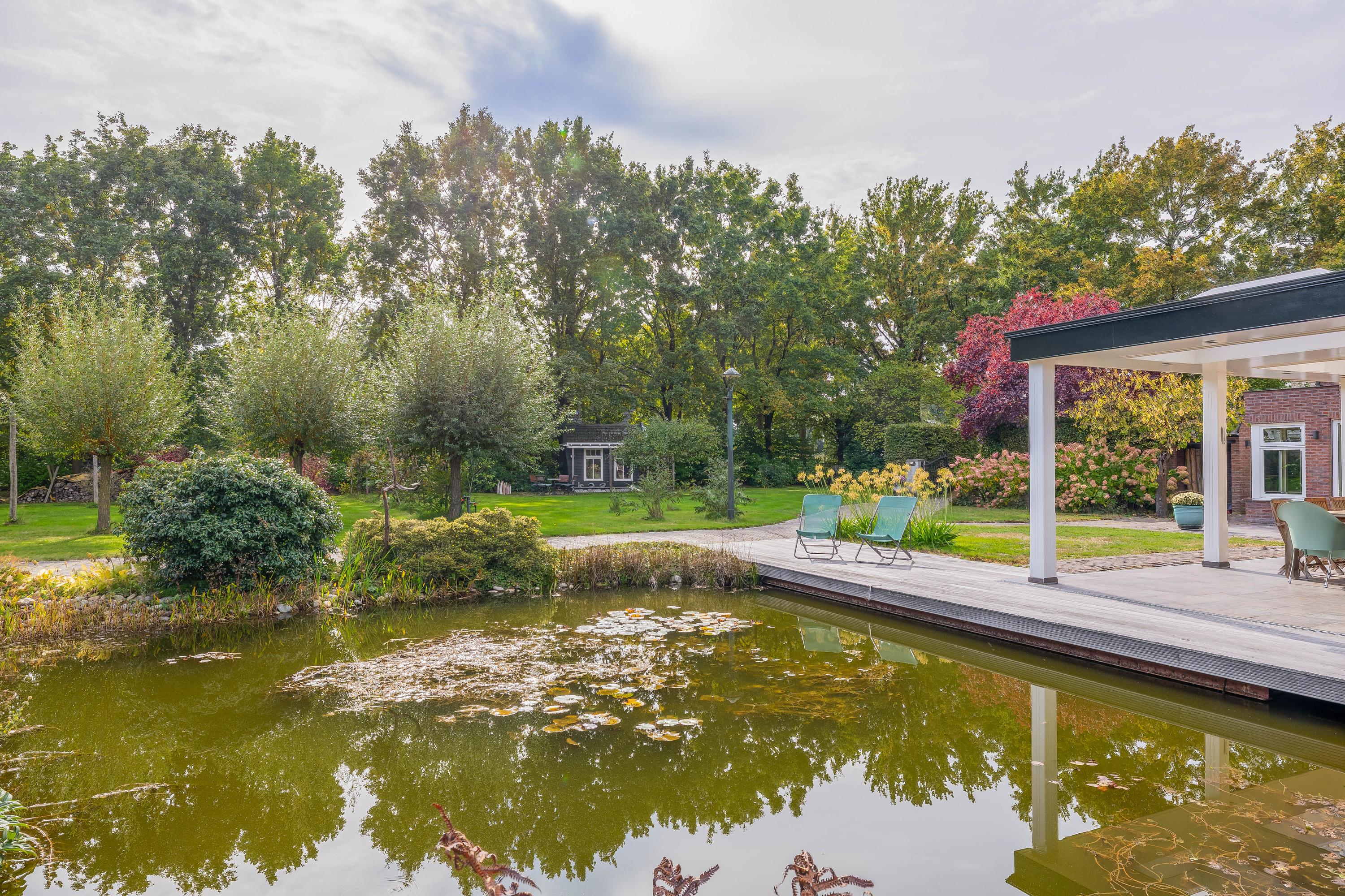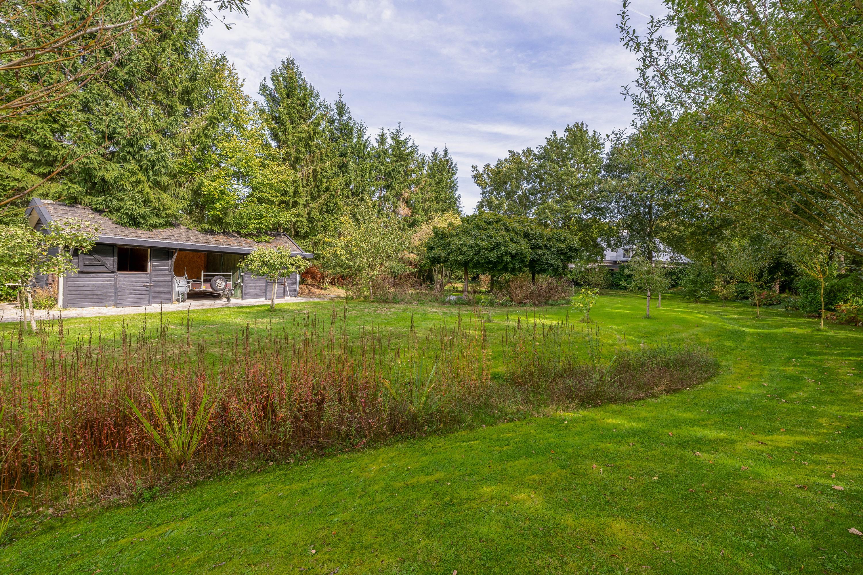 A very spacious, beautifully landscaped garden with a covered terrace at the rear and a charming terrace at the front; perfect for enjoying both the sun and the shade. The park-like grounds are further decorated with baked clinker paths, an elegant beech hedge and an impressive, sloping lawn. The large water feature with a beautiful decking terrace and a natural wadi further down the plot create a special harmony between water, nature and architecture. The garden also offers a variety of fruit and nut trees and raspberry bushes, which attract a rich variety of wildlife and birds. The “writer's cottage” is located at the front of the garden. This unique cottage is constructed of wood with a tiled roof and vinyl flooring. A decking terrace has been laid around the cottage. This charming cottage is suitable for various purposes: a playhouse for children, a workspace or a hobby room. The practical layout, with its own back entrance on both sides of the house, guarantees optimal accessibility and privacy.