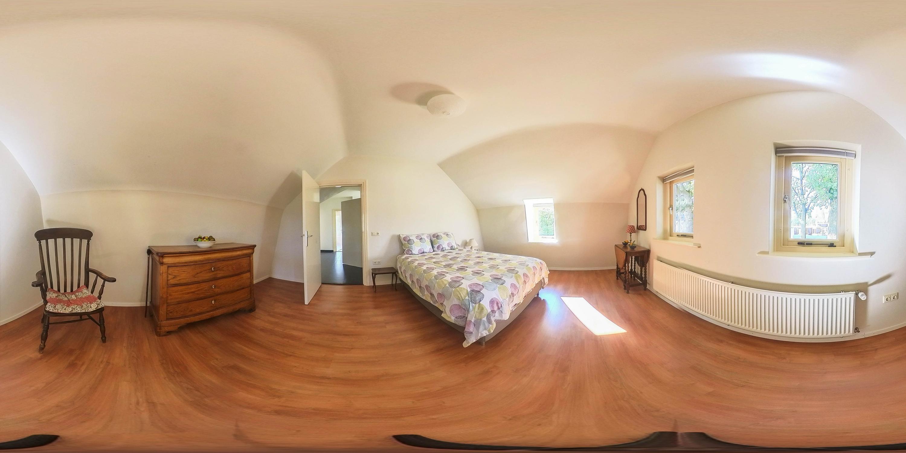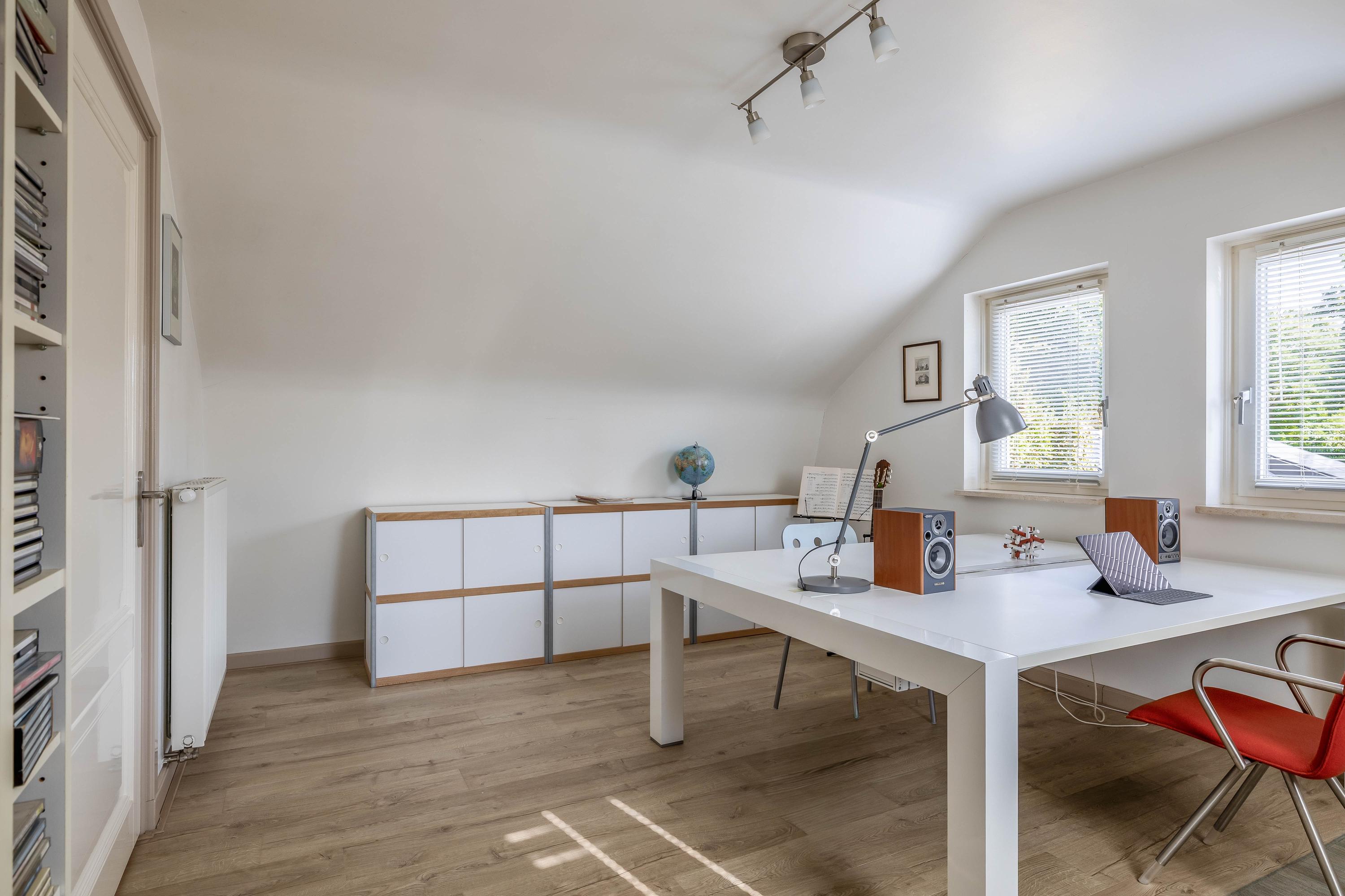 the same finish: laminate flooring, stucco walls and a stucco ceiling. The bedroom on the right has French doors that provide access to the flat roof. From here you have a beautiful view of the garden. The largest bedroom is currently furnished as a hobby room and has a walk-in wardrobe, storage room and a central heating