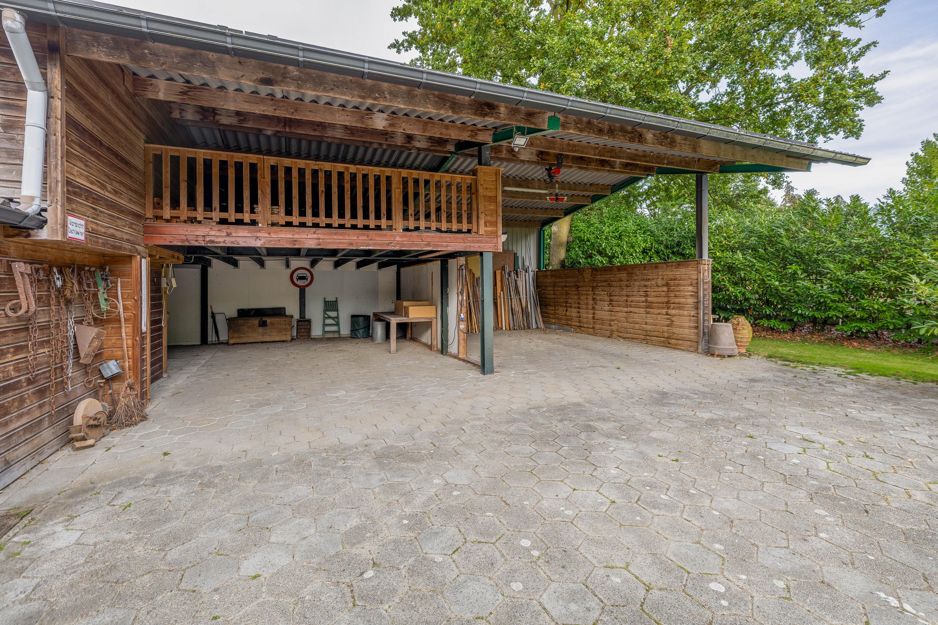The outbuilding is constructed of brickwork and the roof is insulated and covered with roof tiles. French doors in the front façade provide access from the garden to a pleasant space finished with a tiled floor, stucco walls and a sanded ceiling with recessed lighting. This space is ideal for use as a hobby or chill-out room. In addition, the outbuilding also has its own central heating boiler and shower room, which is equipped with a walk-in shower, toilet and washbasin. A loft ladder provides access to the storage attic. The space is currently used as a hobby room, but is of course also very suitable for various other purposes. On the right-hand side of the building are three former horse stalls. These stalls are equipped with divisible doors with an overhang at the front. The stalls are currently used as storage spaces. One of the stalls houses the inverter for the solar panels. There is a sink. The overhang at the front is spacious and can serve as a covered terrace, a wonderful place to sit. At the rear is a shed with wooden walls and a corrugated iron roof. This